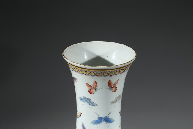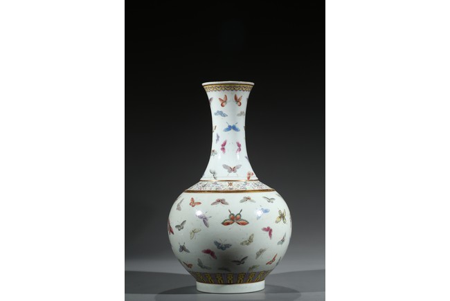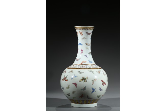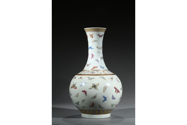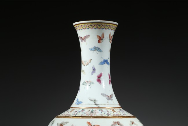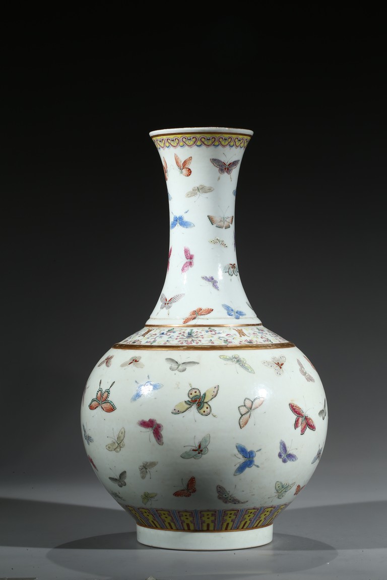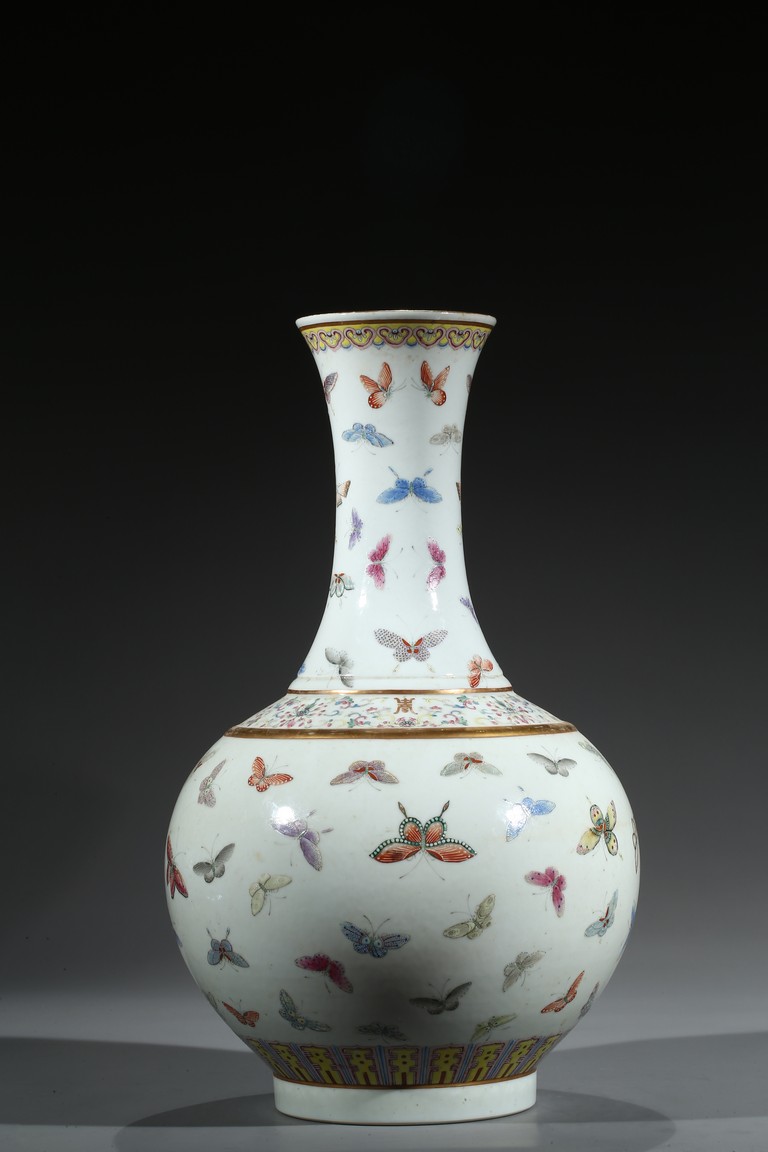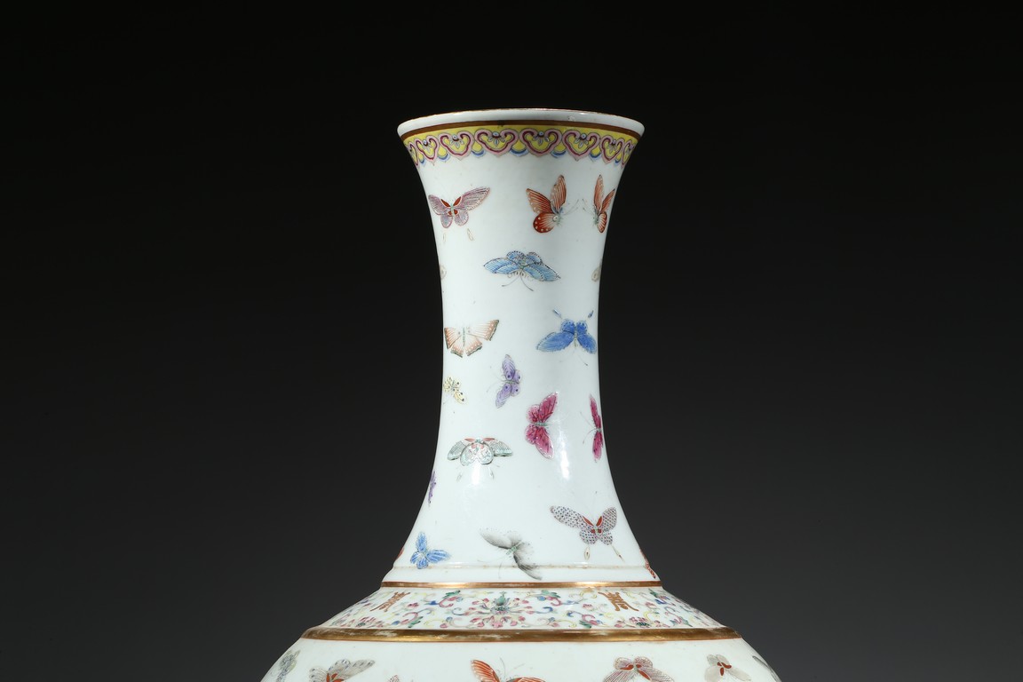 此瓶為清光緒、宣統兩朝御窯彩瓷經典品種,瓶身以粉彩百蝶紋裝飾,俏麗喜慶。整器形制規整,胎釉精良,頸、腹部繪粉彩“百蝶圖”,取“歡天喜地”之吉意,所繪蛺蝶五色煥然,身姿各異,須翅栩然,靈動精采。全器設色豐富,筆觸工致,明快妍麗,陳設效果上佳。