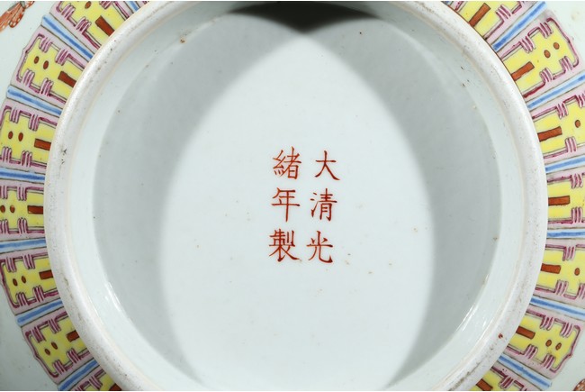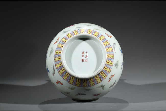 The compressed globular body rising from a short foot to a tall waisted neck, decorated with the 'Hundred butterflies' design divided by a band of lotus scrolls and stylised shou characters at the shoulder, the rim and the foot with ruyi and lappet bands, inscribed to the base with a six-character iron-red reign mark. Qing Dynasty Guangxu period.