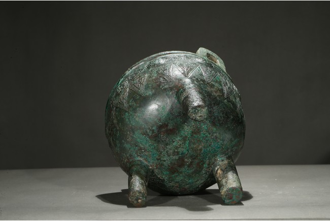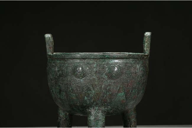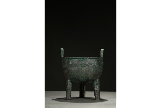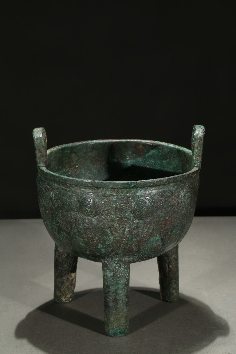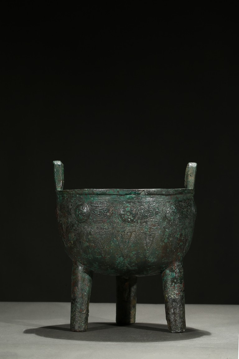 Of rounded body, the exterior cast with a frieze of alternating whorls and cicada against leiwen above band of triangular cicada blades ,supported on three straight columnar legs. Late Shang Dynasty period.