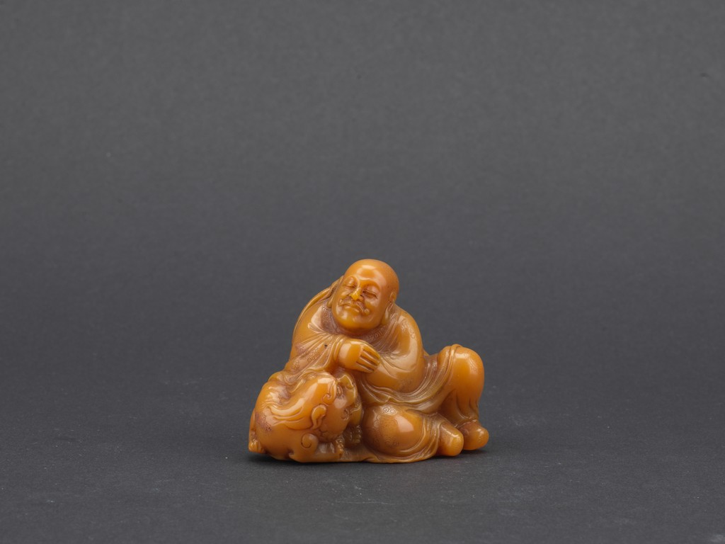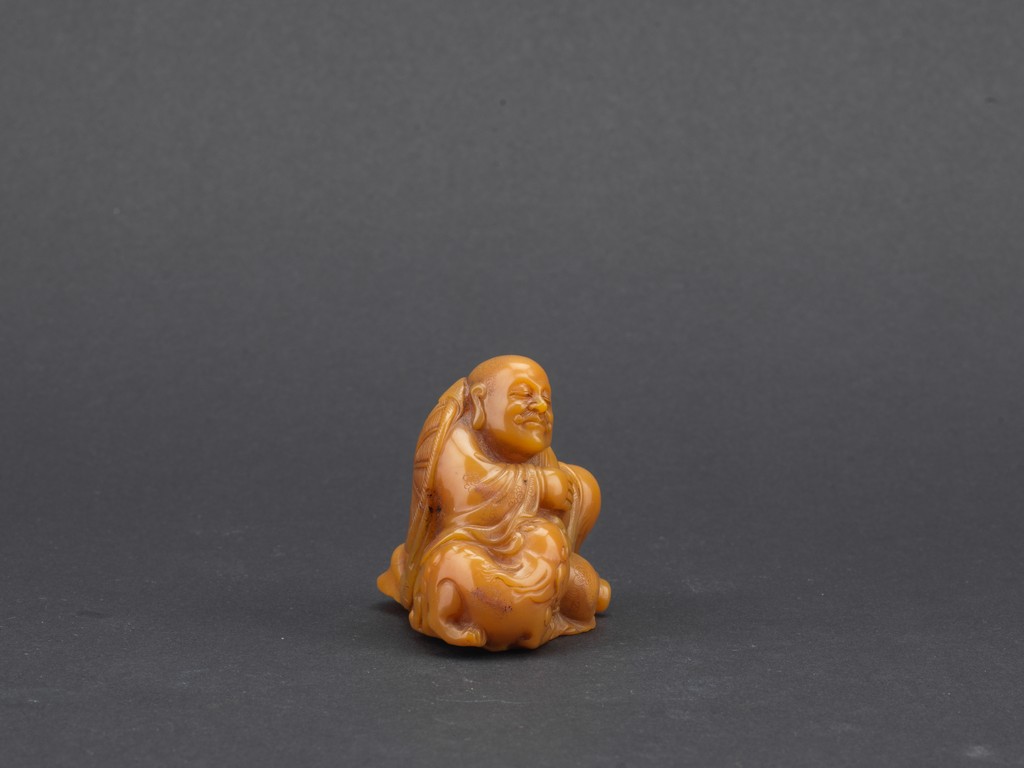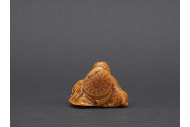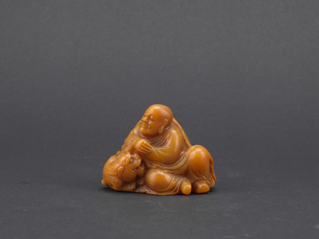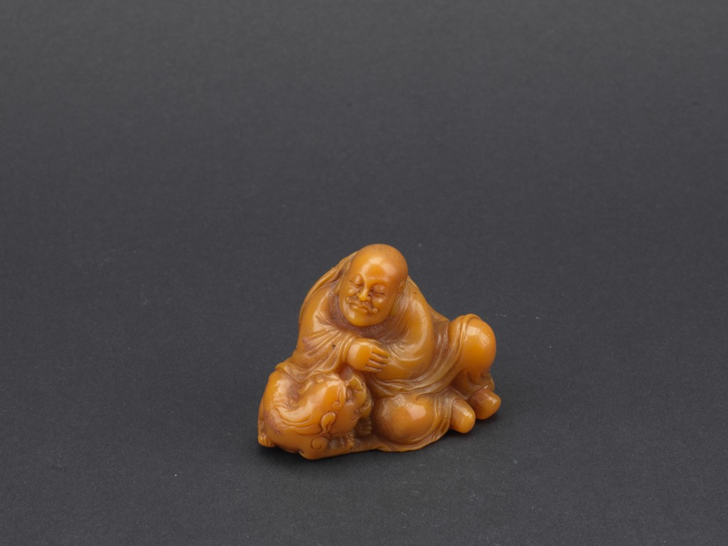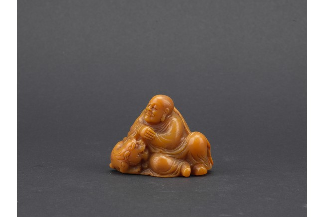Finely carved as an arhat figure leaning against a tiger, his face rendered in an meditative expression, wearing loose robe with elegant folds, wearing a large hat on his back, carved with two character inscription Yu Xuan. Qing Dynasty period.