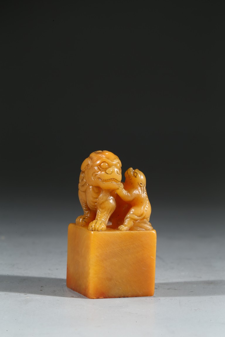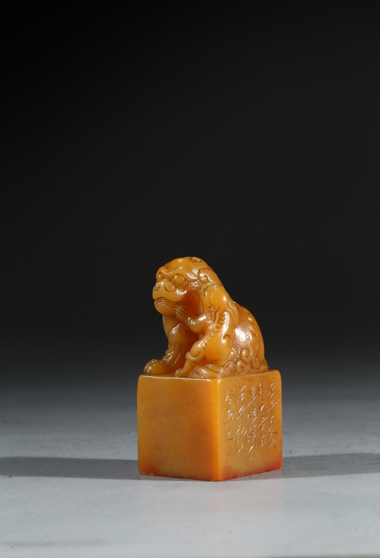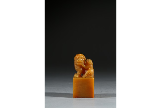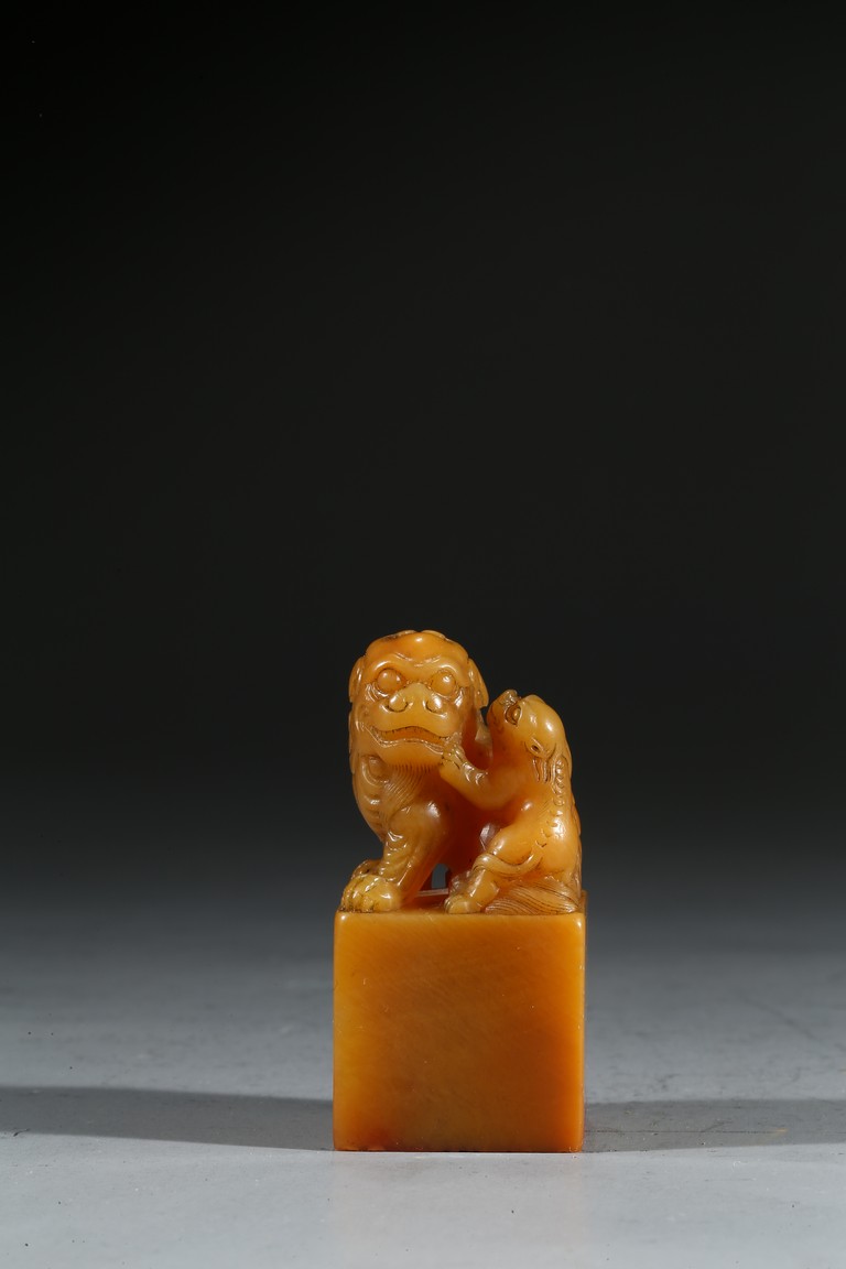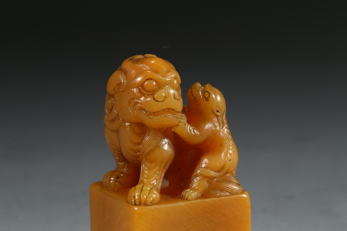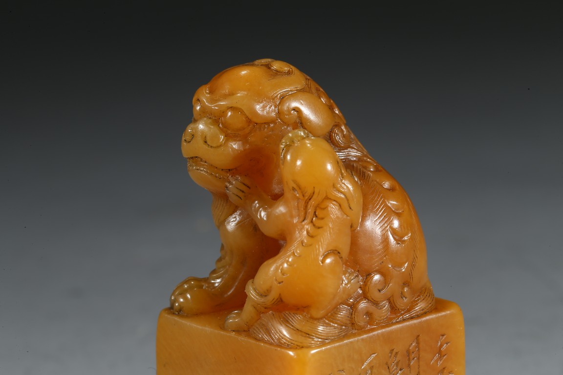 of square section, surmounted by a well-carved seated lion with its head turned back towards its cub playfully escalating its back, one inscribed attributed to Gui Fu, the seal face inscribed with a three character in seal script, the stone a warm amber-honey color. Qing Dynasty period.