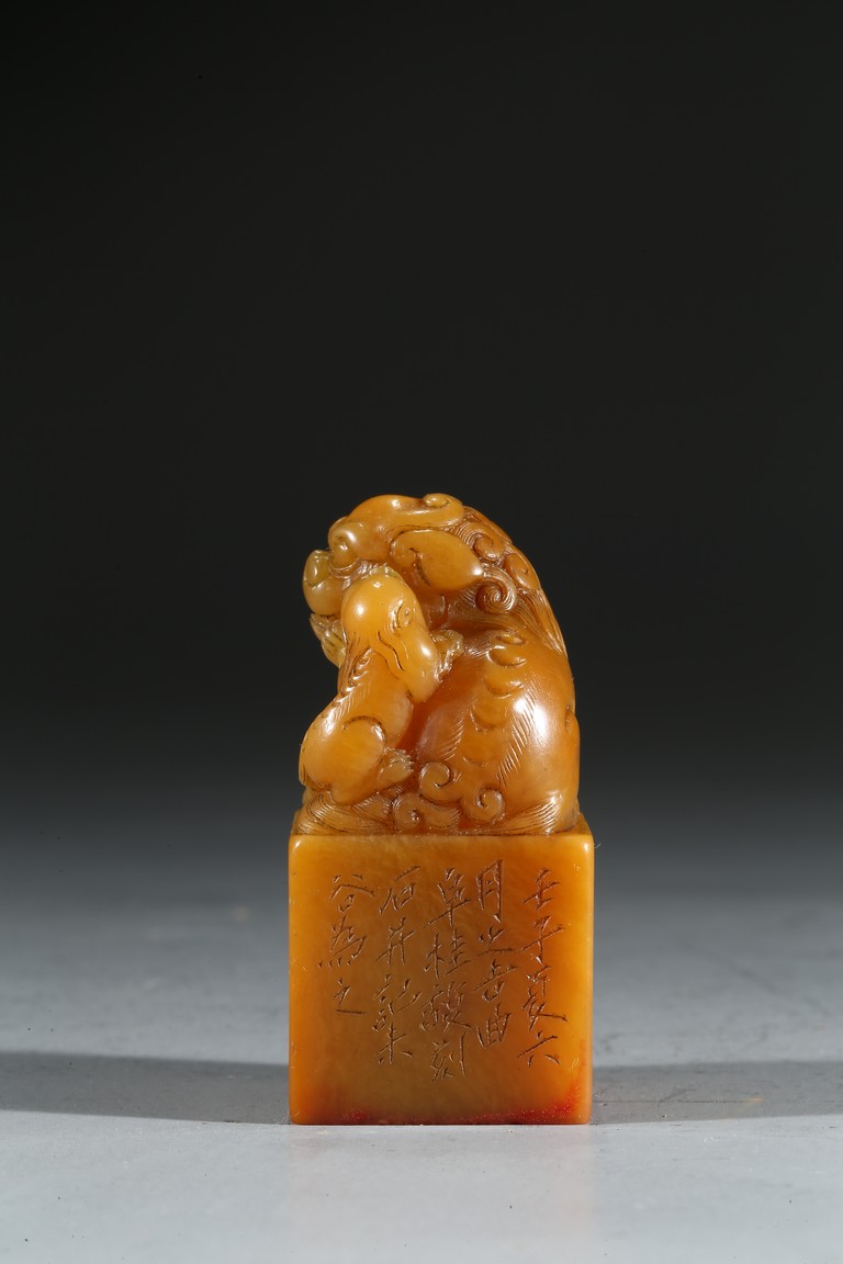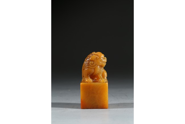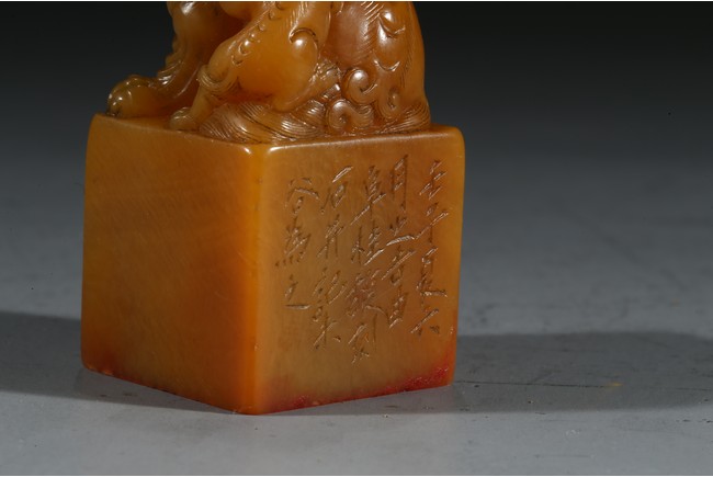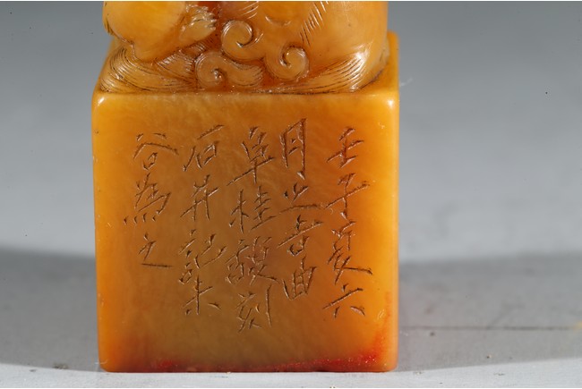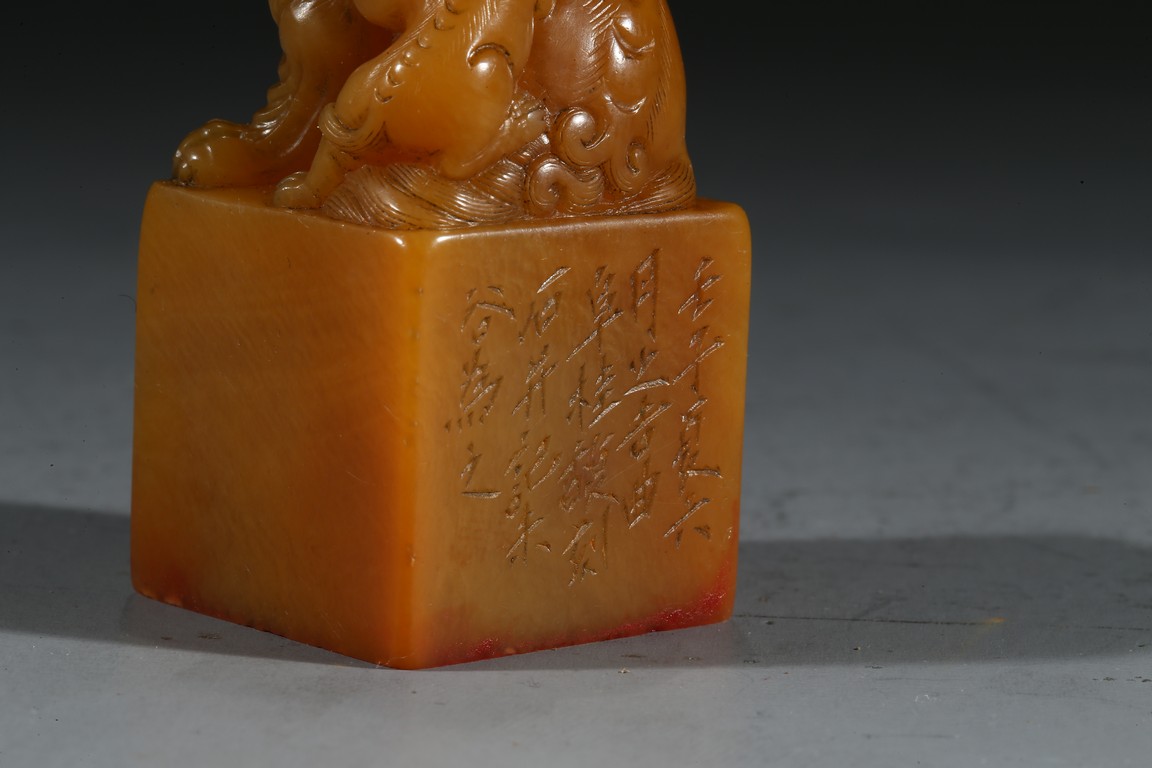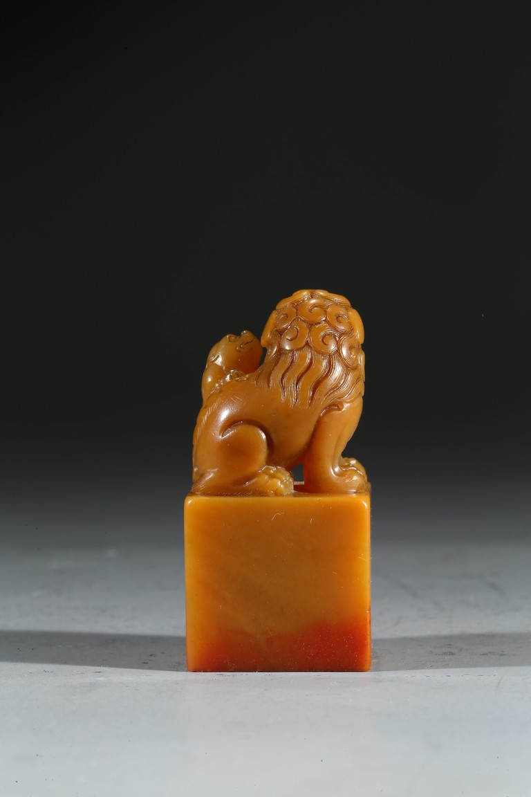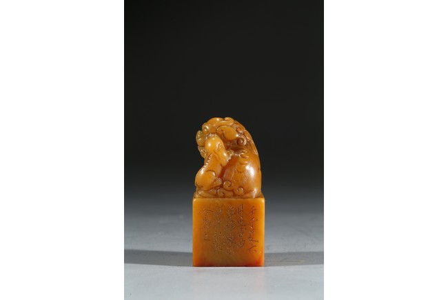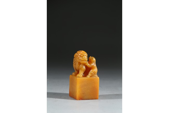 of square section, surmounted by a well-carved seated lion with its head turned back towards its cub playfully escalating its back, one inscribed attributed to Gui Fu, the seal face inscribed with a three character in seal script, the stone a warm amber-honey color. Qing Dynasty period.