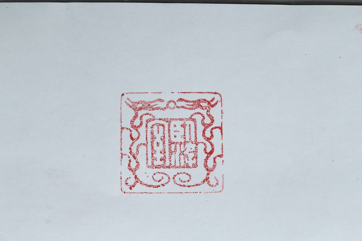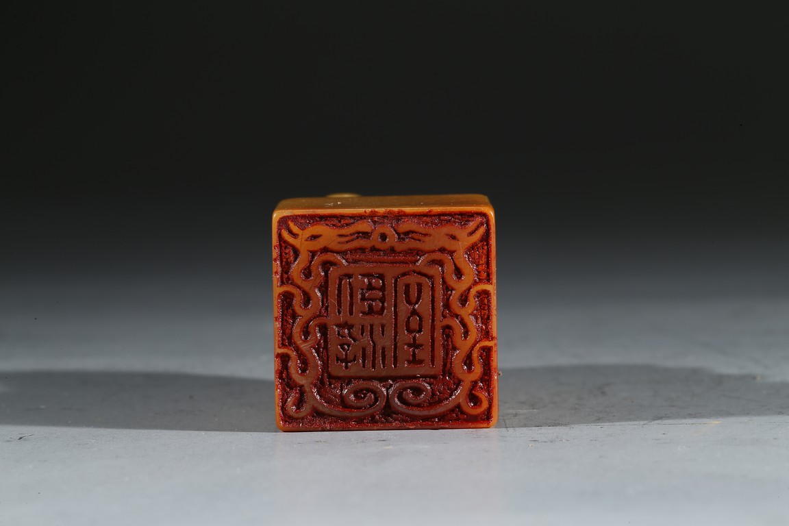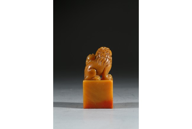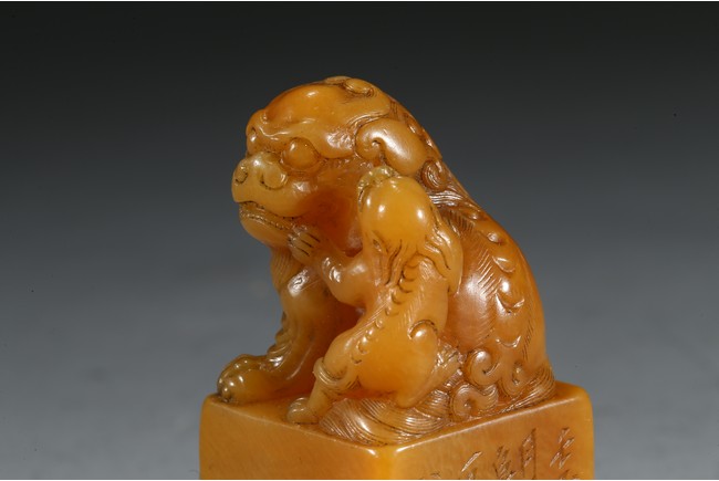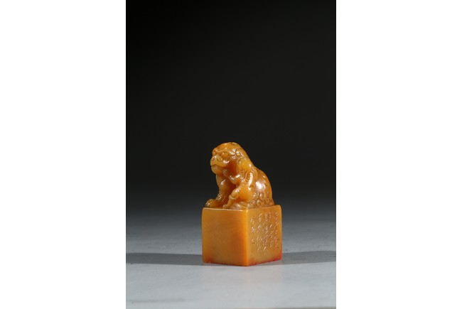 獅鈕方章,凍透潤澤,質感細膩凝潤,蘿蔔絲紋清晰綿密,通體呈黃金黃色,濃郁純正,外裹一層明顯的包漿,幽然古樸,發出燦燦葆光,是田黃石中的極品。雕刻家毫不惜材,將質地如此完美的田黃石切割成長方形,配以圓雕的太獅少獅鈕,極盡奢華。獅自古就是民間喜聞樂見的題材,母子獅有 “子嗣昌盛”之意,亦有借諧音“太師少師”,寓高官厚祿。