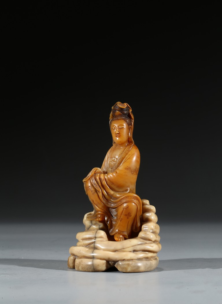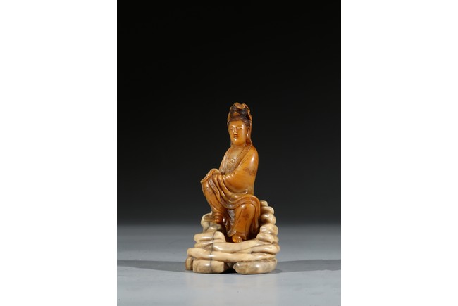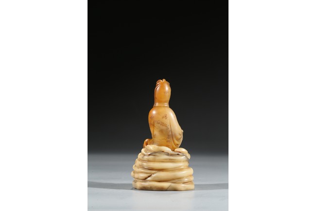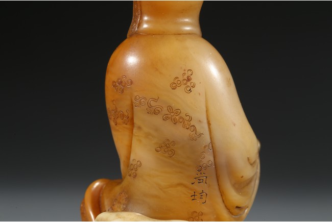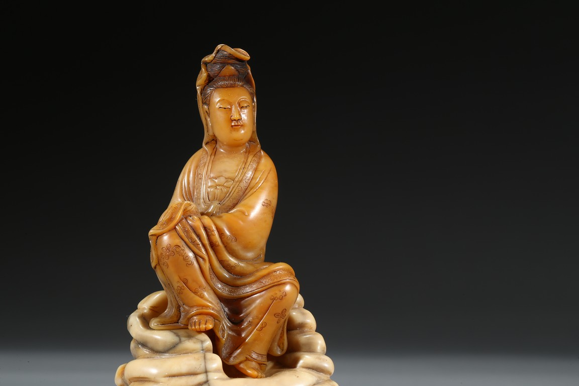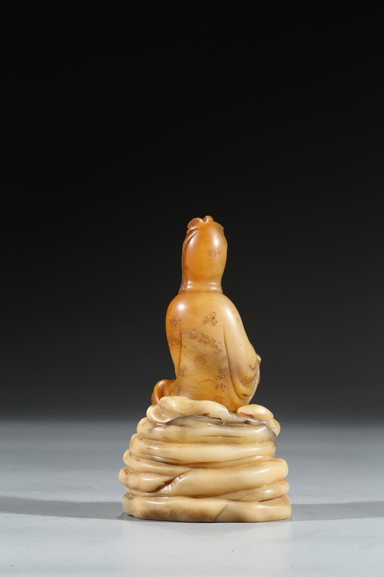 Seated in lalitasana and with a benevolent expression, wearing loose robes incised with scrolling clouds and floral decoration, all supported on base, the reverse with two character Shang Jun. Qing Dynasty period.