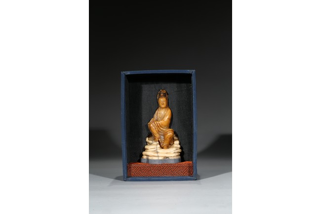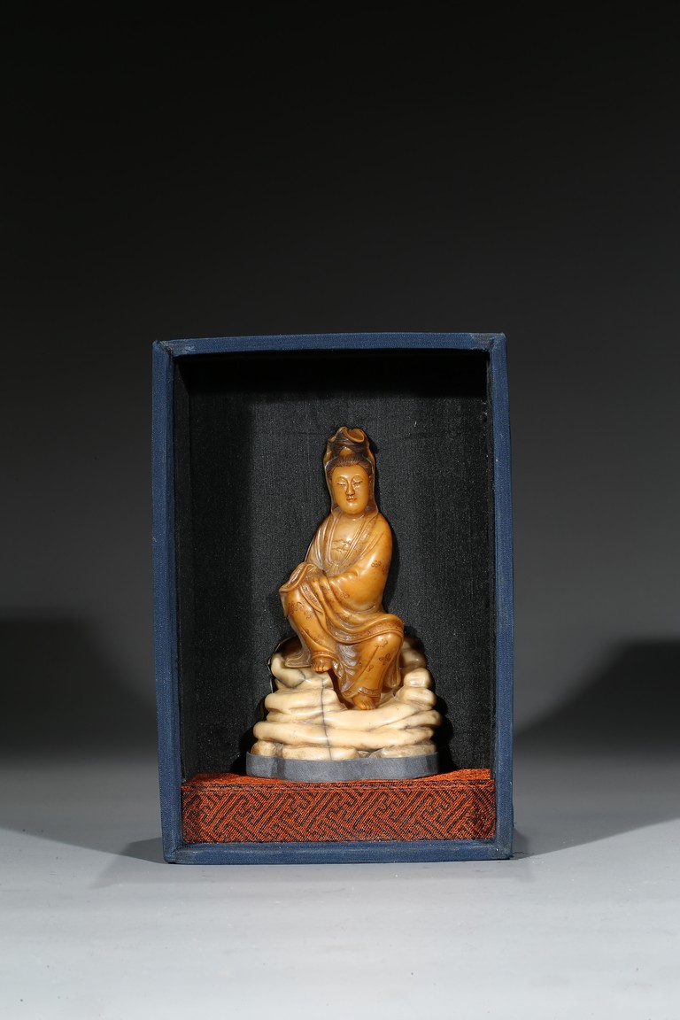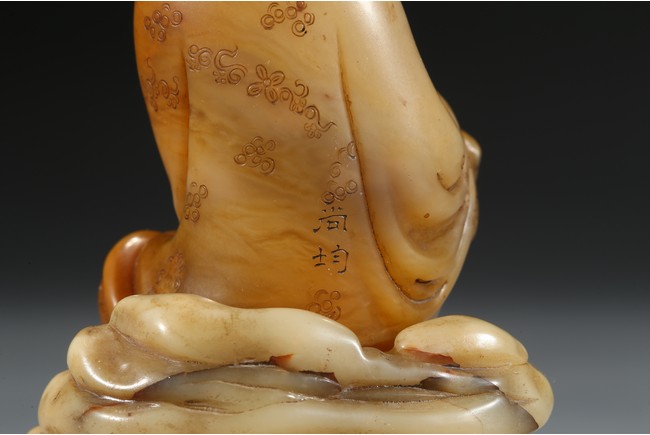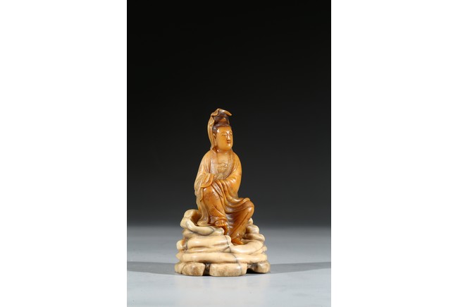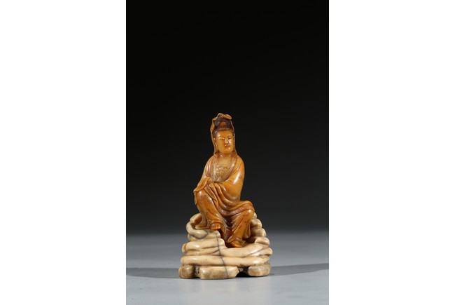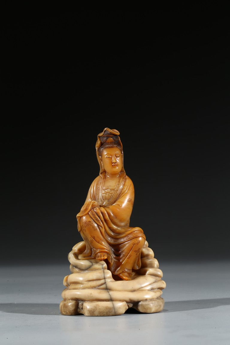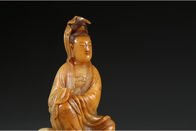 Seated in lalitasana and with a benevolent expression, wearing loose robes incised with scrolling clouds and floral decoration, all supported on base, the reverse with two character Shang Jun. Qing Dynasty period.