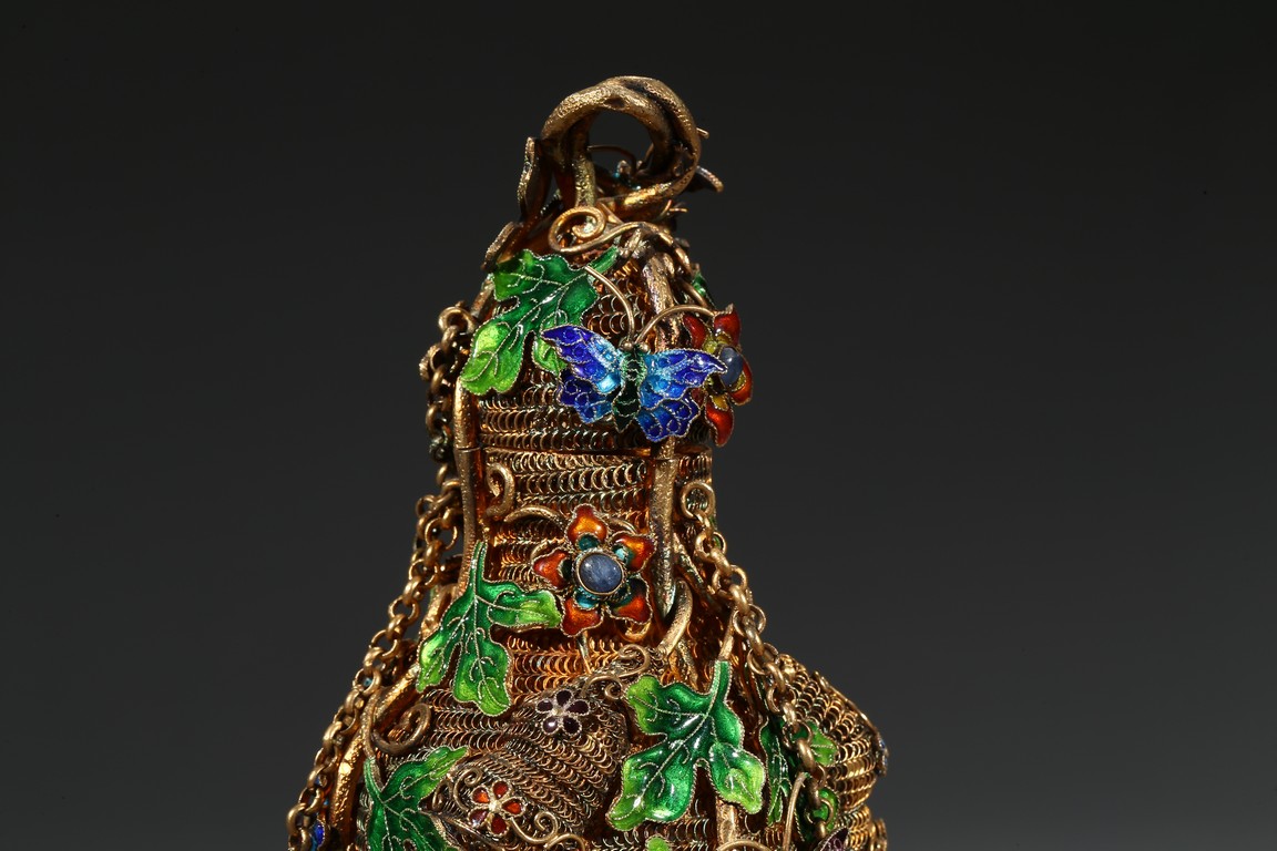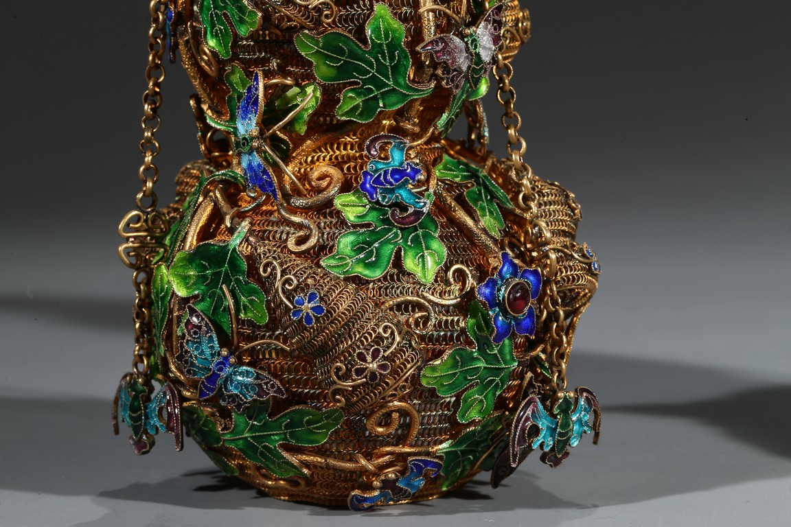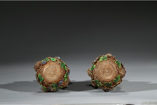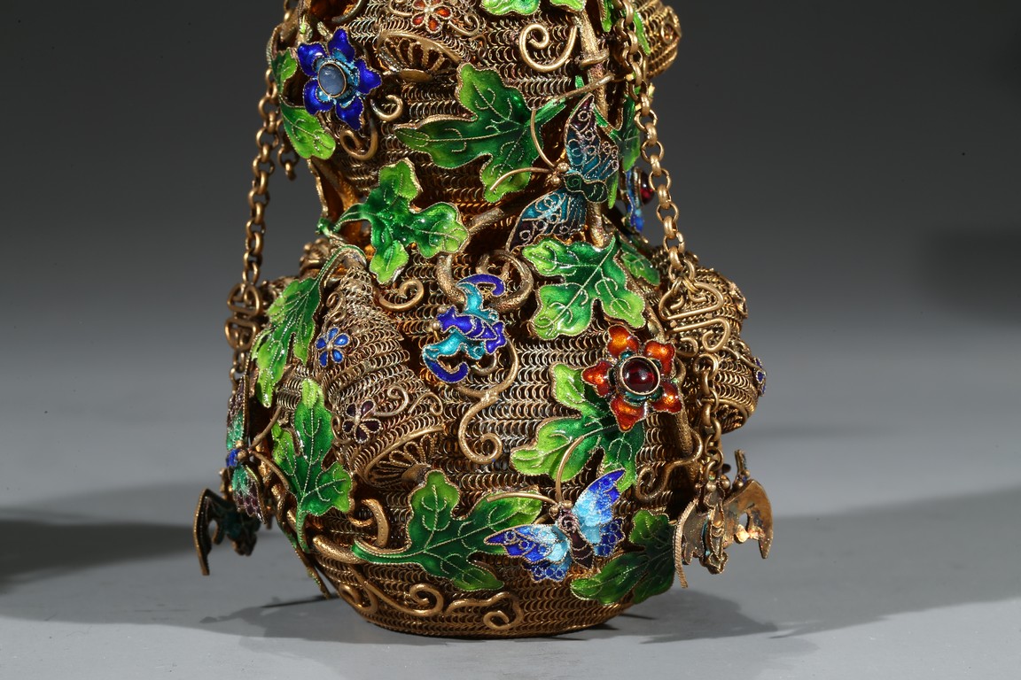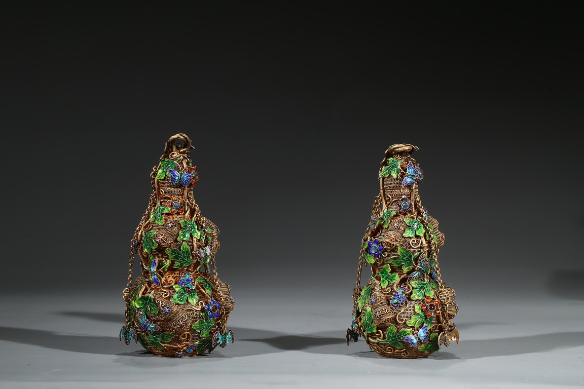 A PAIR OF SILVER GILT ENAMEL FILIGREE DOUBLE GOURD VASES 清 銀鎏金琺瑯葫蘆蓋瓶一對