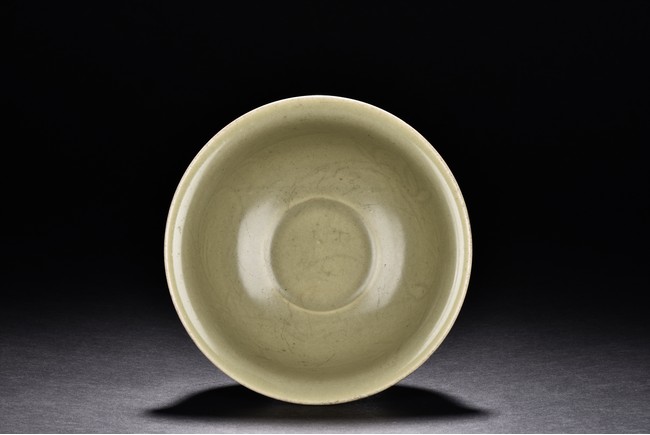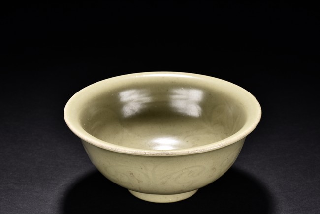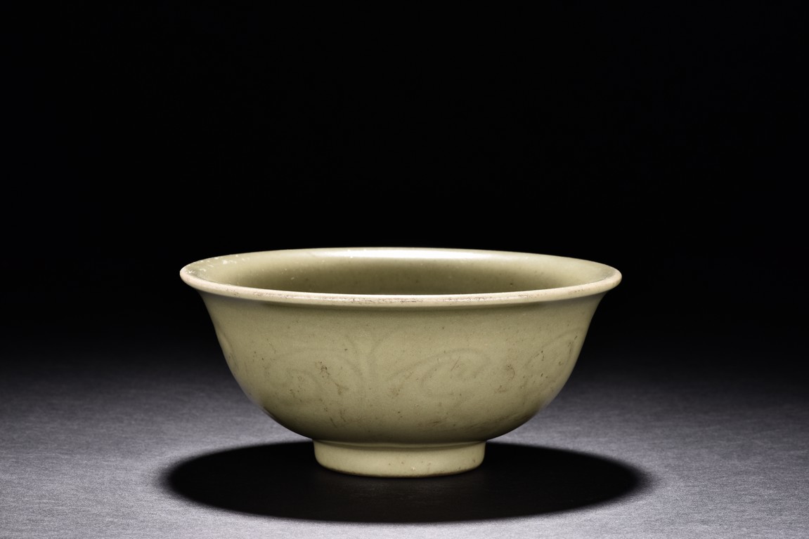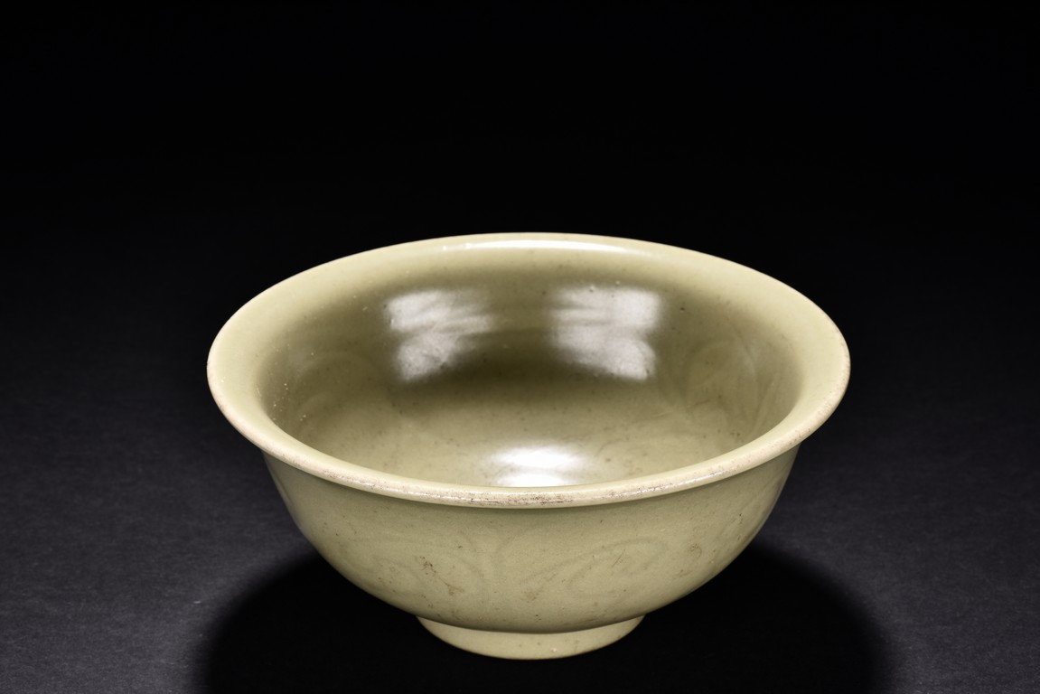 Rising from a circular foot ring,it is overall covered in celadon glaze with shallow floral motif to the exterior and interior. Qing Dynasty