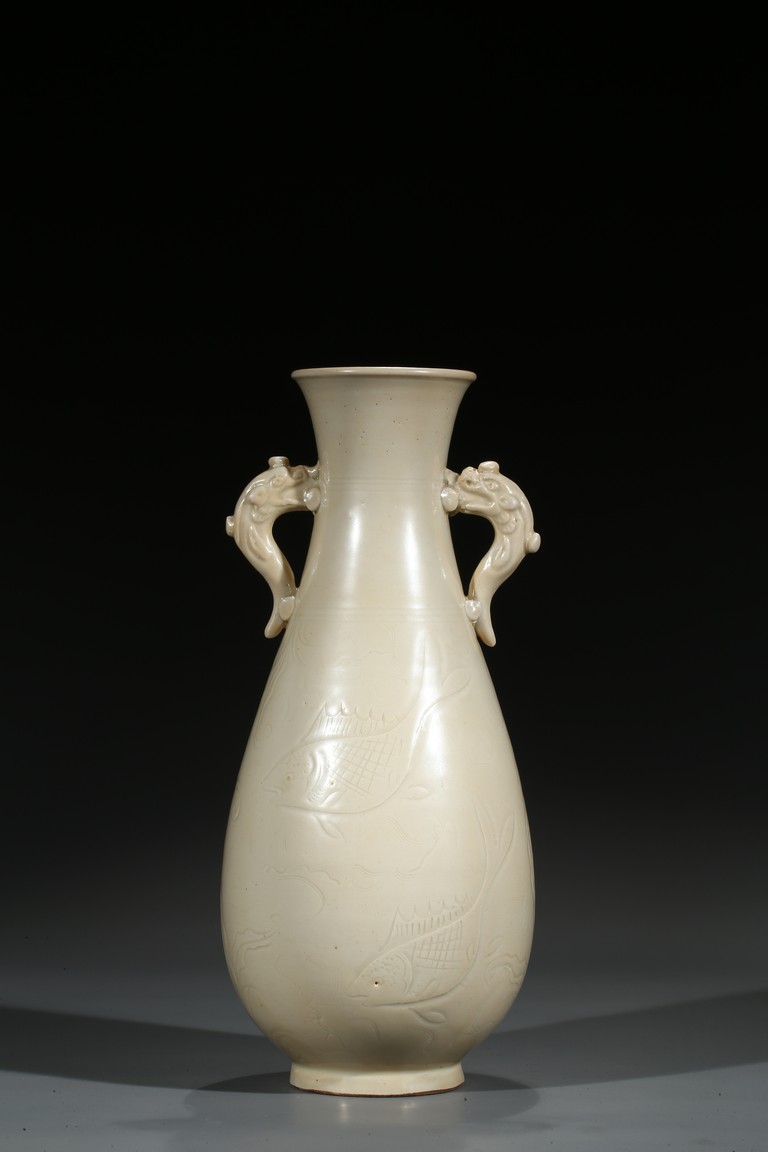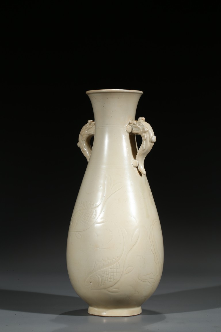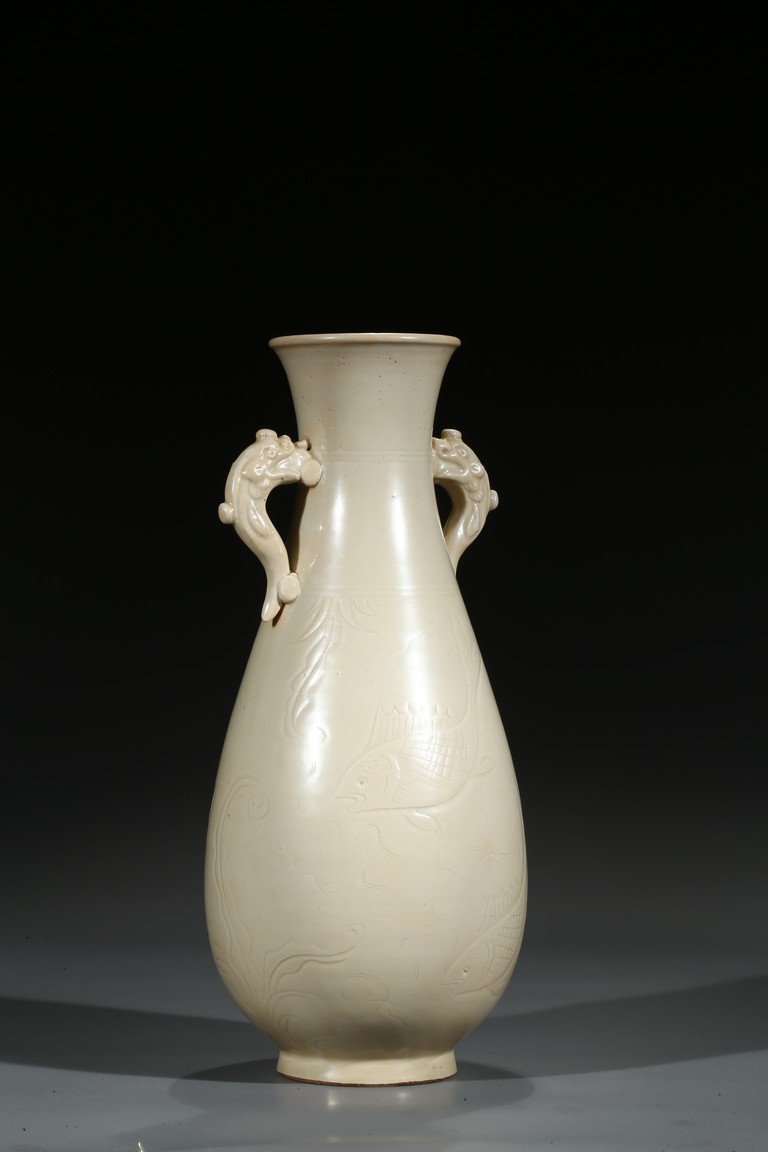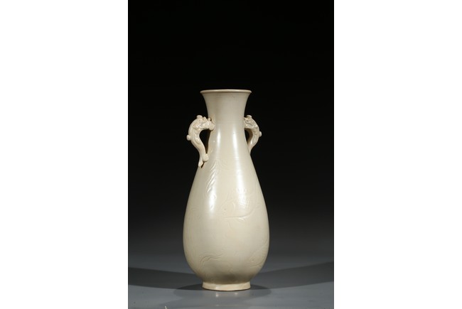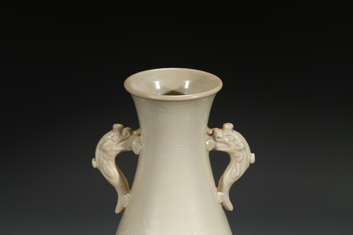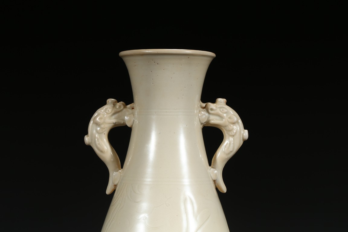 此瓶瓶身修長,唇口、束腰、鼓腹、圈足、龍耳。胎體緻密,通體施白釉,瓷胎細薄、潔白,釉色透亮略顯乳白,釉面滋潤。釉下刻魚草紋,技術嫻熟,紋飾素麗、典雅,氣韻非凡。底部刻有“官”字款,應為貢瓷。