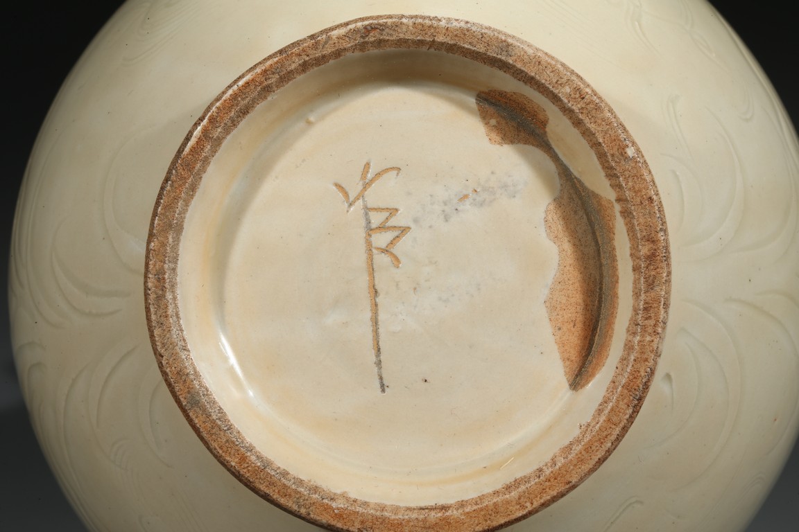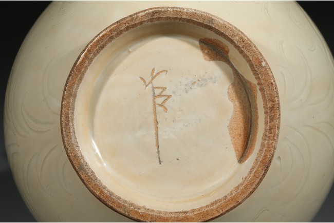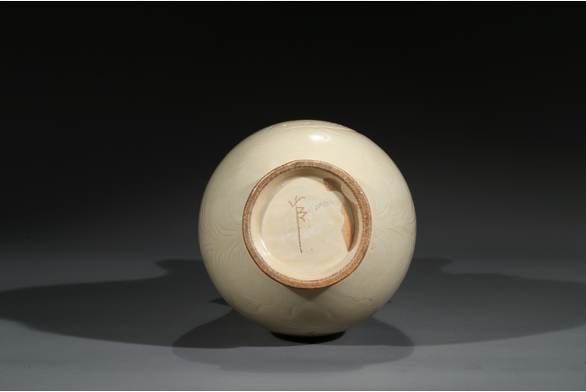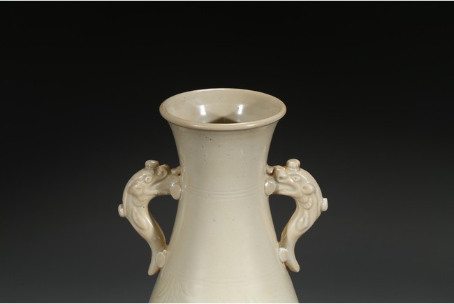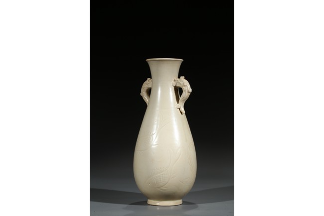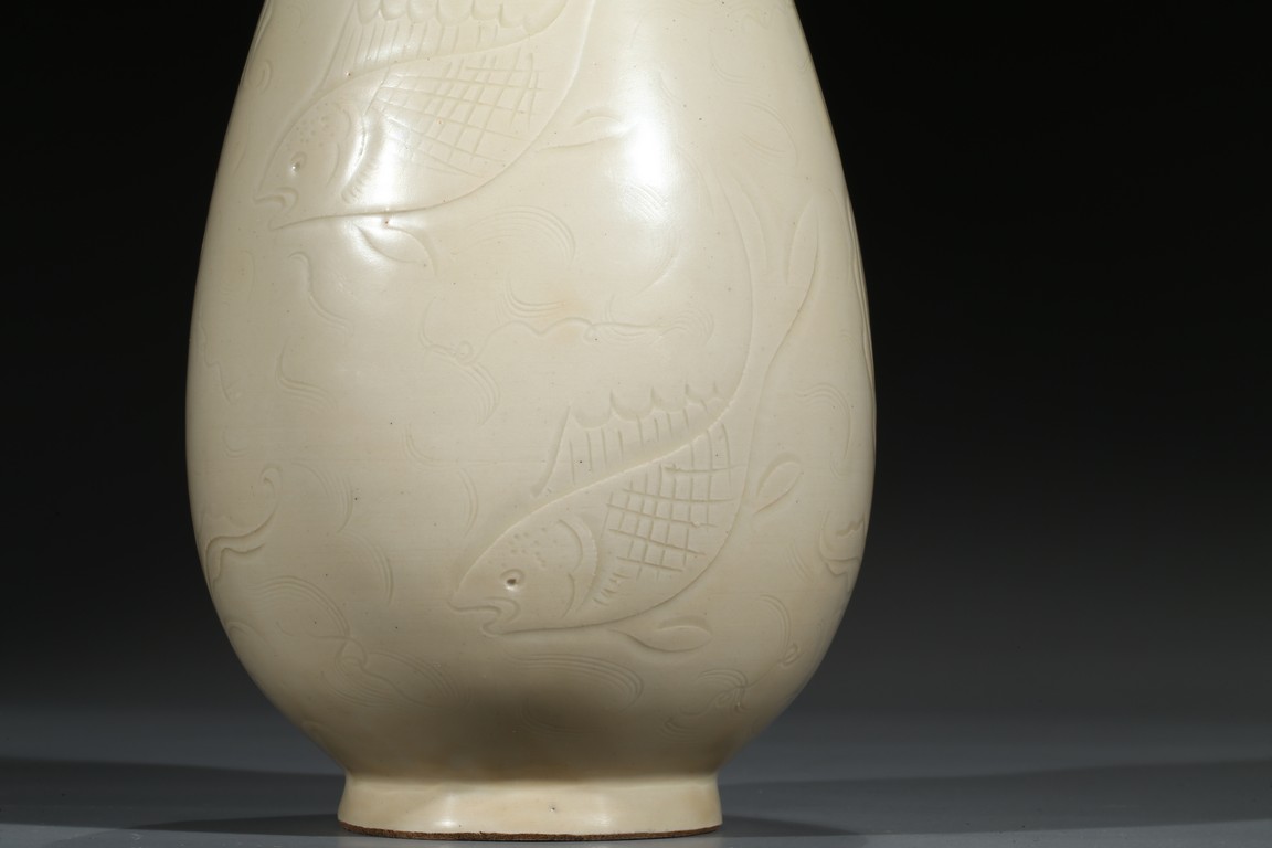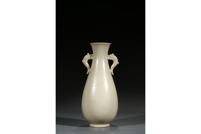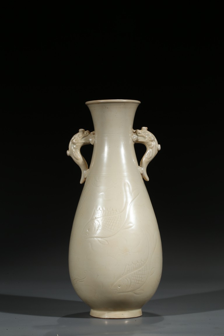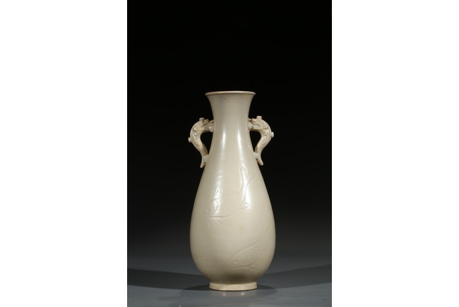 此瓶瓶身修長,唇口、束腰、鼓腹、圈足、龍耳。胎體緻密,通體施白釉,瓷胎細薄、潔白,釉色透亮略顯乳白,釉面滋潤。釉下刻魚草紋,技術嫻熟,紋飾素麗、典雅,氣韻非凡。底部刻有“官”字款,應為貢瓷。