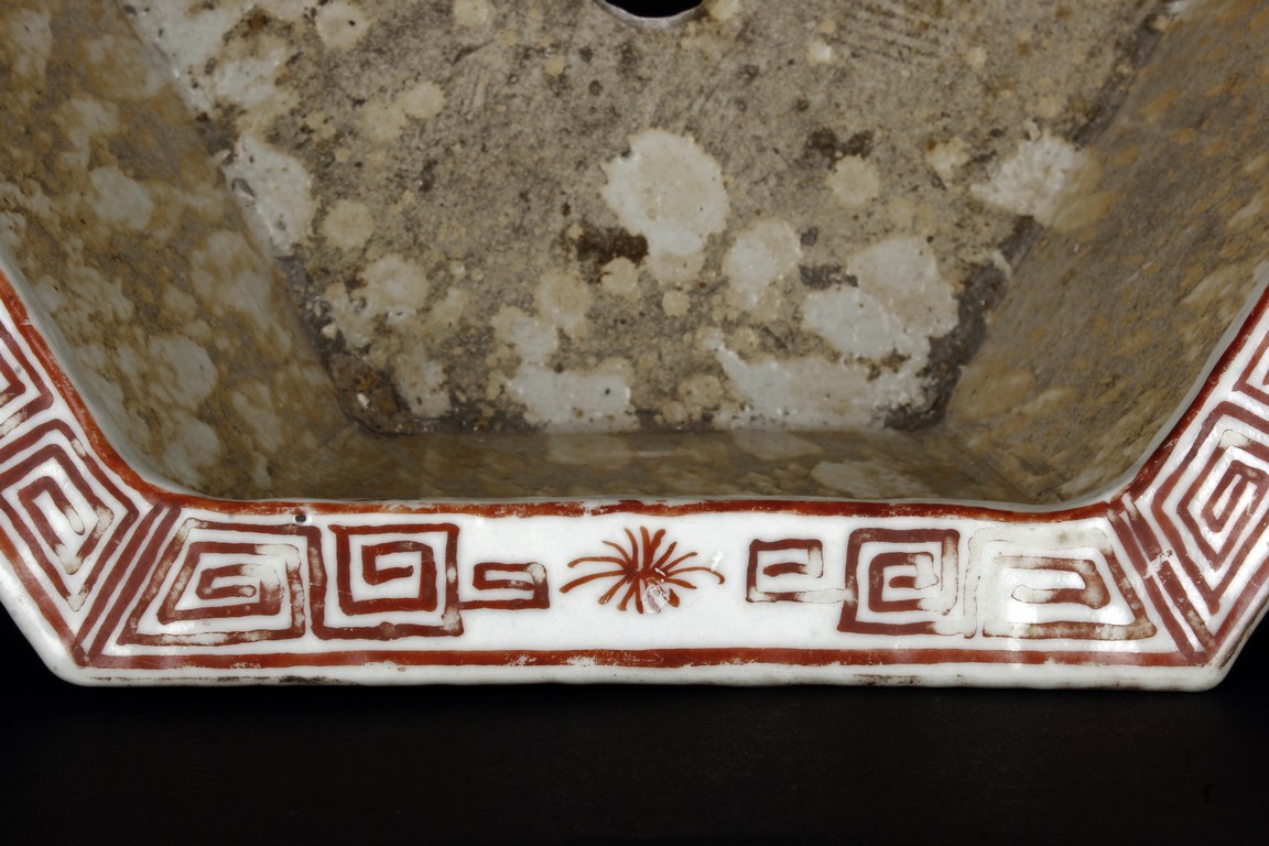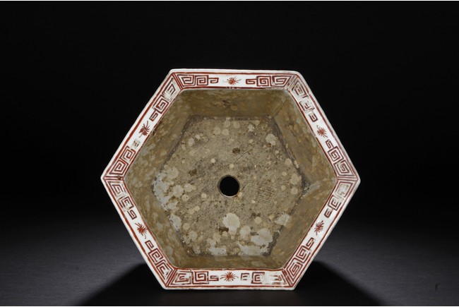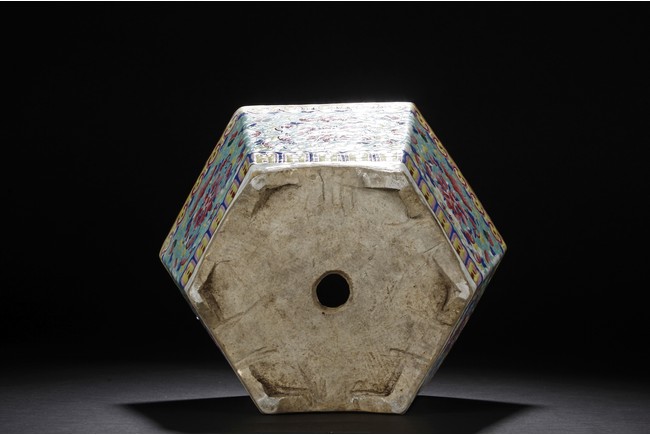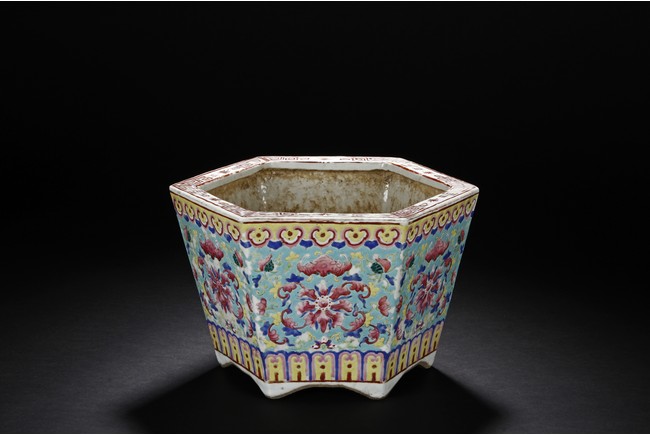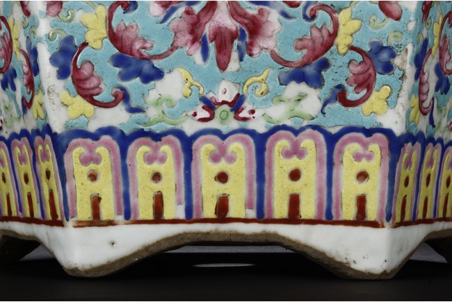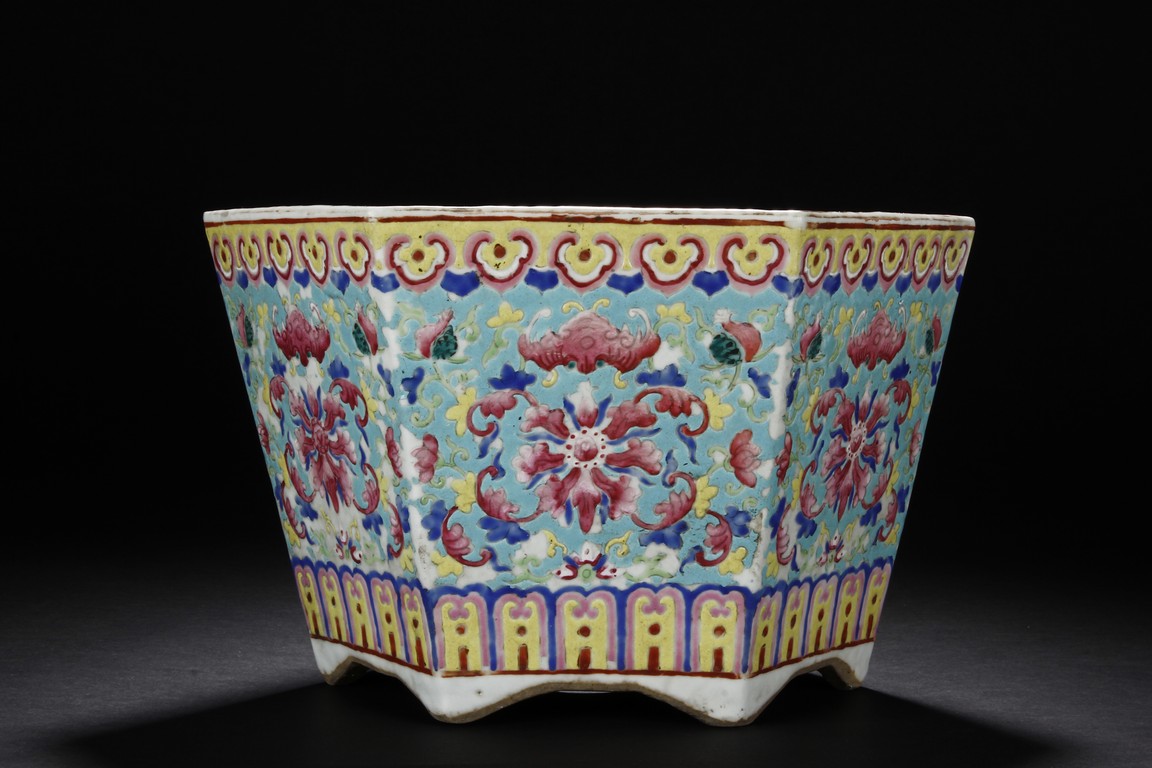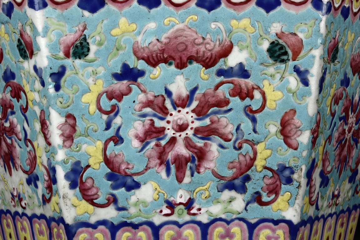 Of hexagonal shaped, each side is enamelled with scrolling foliage with a bat all reserved on turquoise ground, flanked by a continuous ruyi scroll band to the neck and a key-fret band at the foot reserved on yellow ground. Qing Dynasty period.