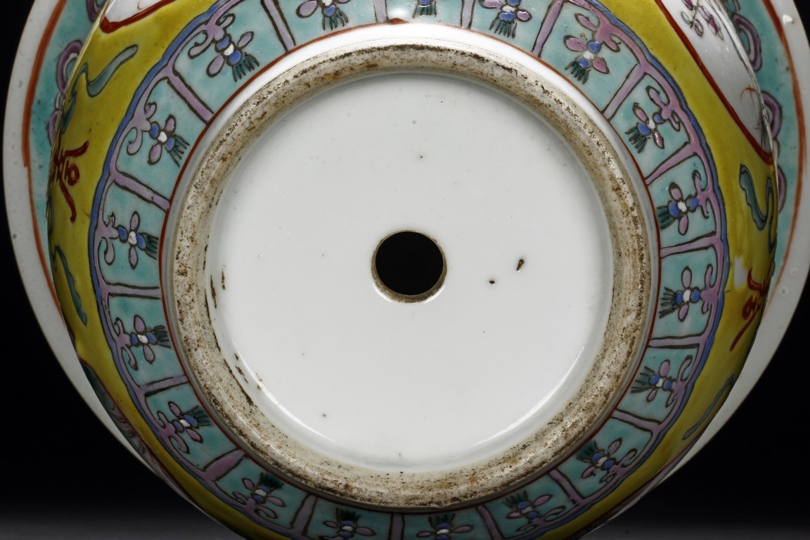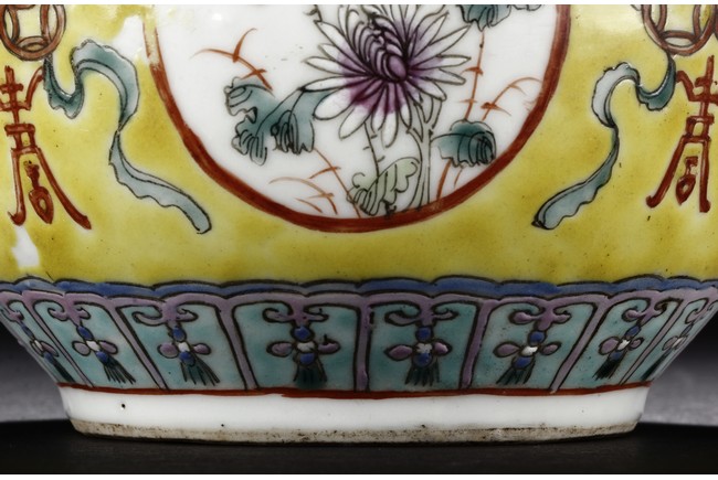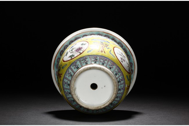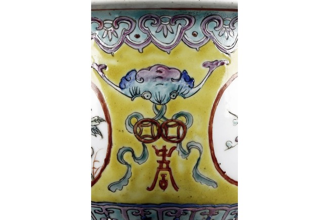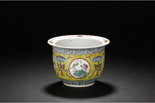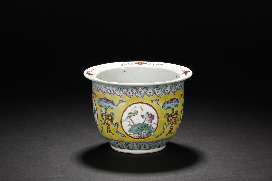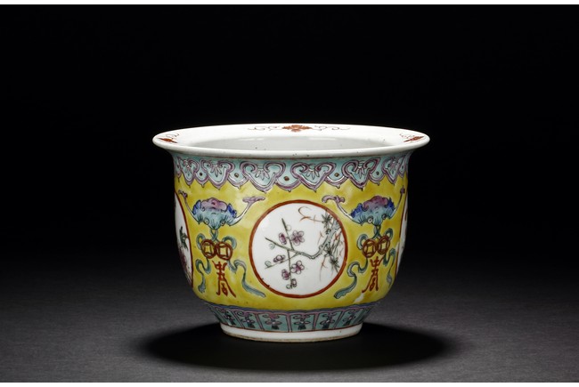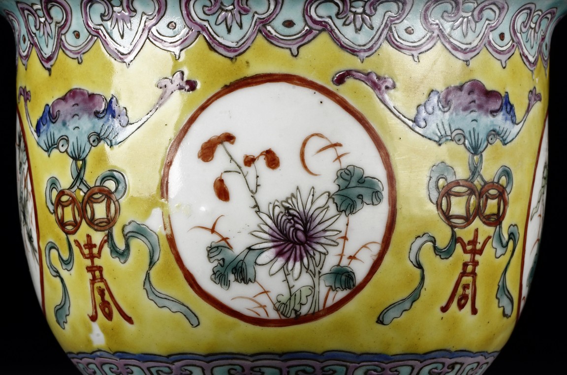 The Jardinière is decorated with four roundel panel, each enclosing lotus, chrysanthemum, plum, and peony, all flanked by auspicious bat with longevity character reserved on yellow ground below ruyi-shaped band around neck. Qing Dynasty period.