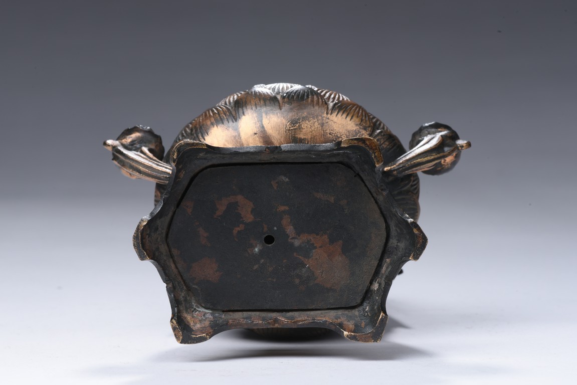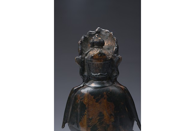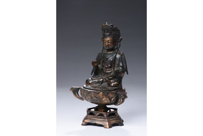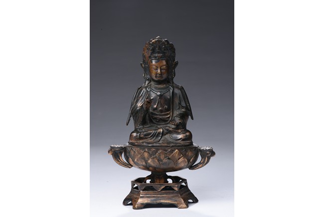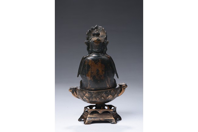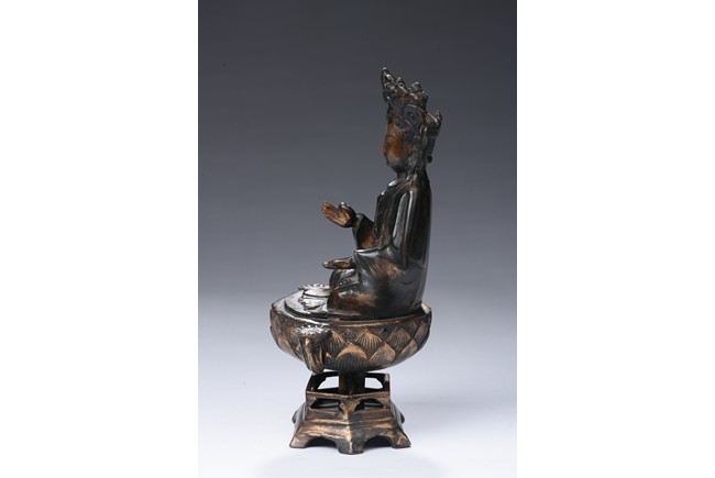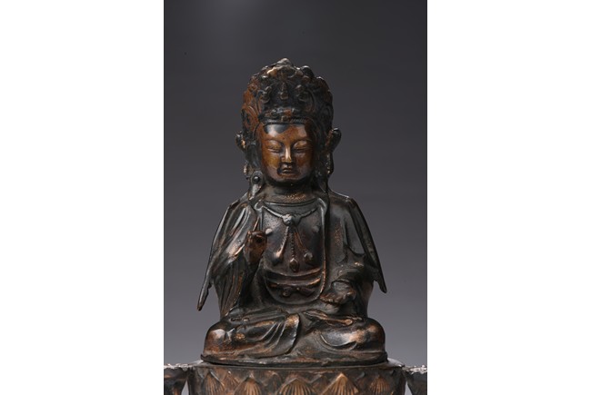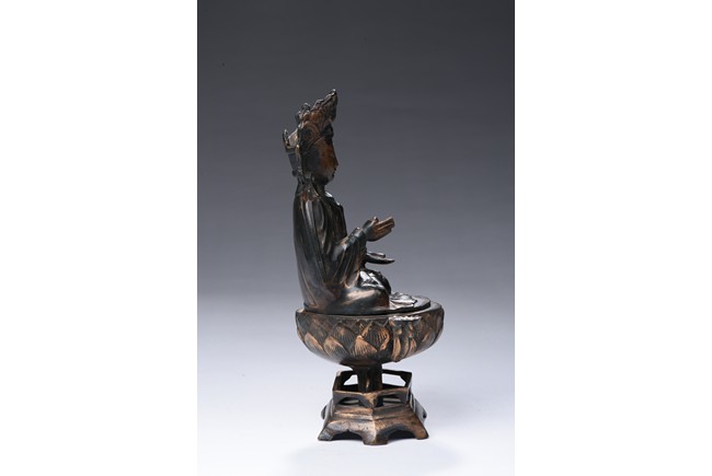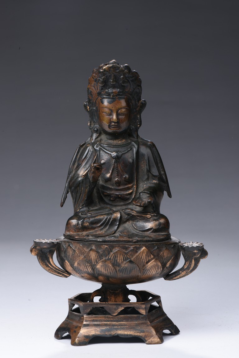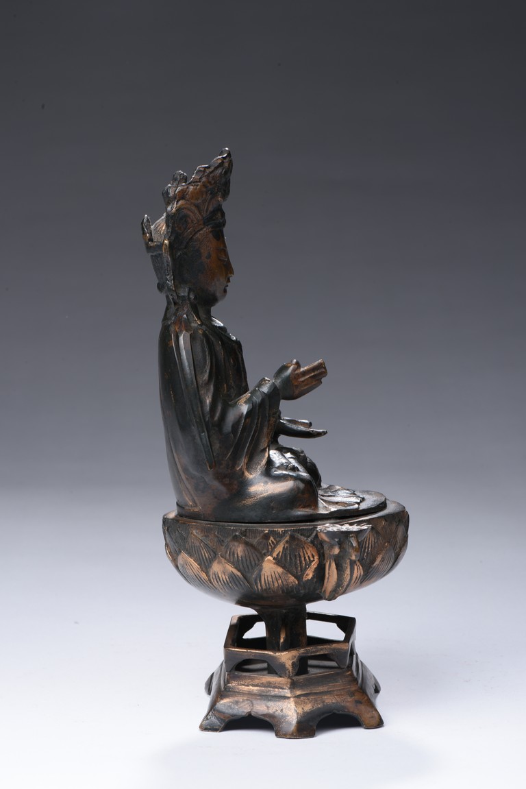 Shown seated on a lotus throne supported by a stand, the bodhisattva is shown in dhyanasana, hands in abhaya mudra , wearing long and voluminous robe, chest adorned with beaded jewelry, the face shown in meditative expression, wearing a crown with a seated Amitabha at center. Qing Dynasty period.