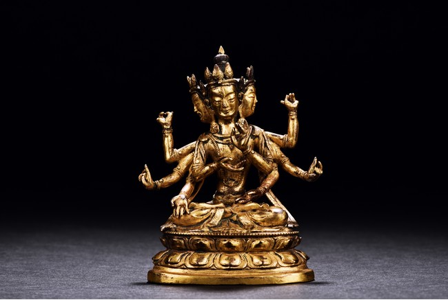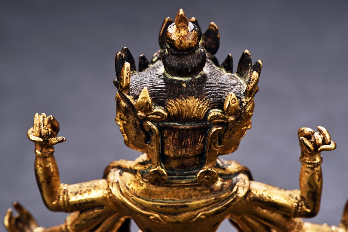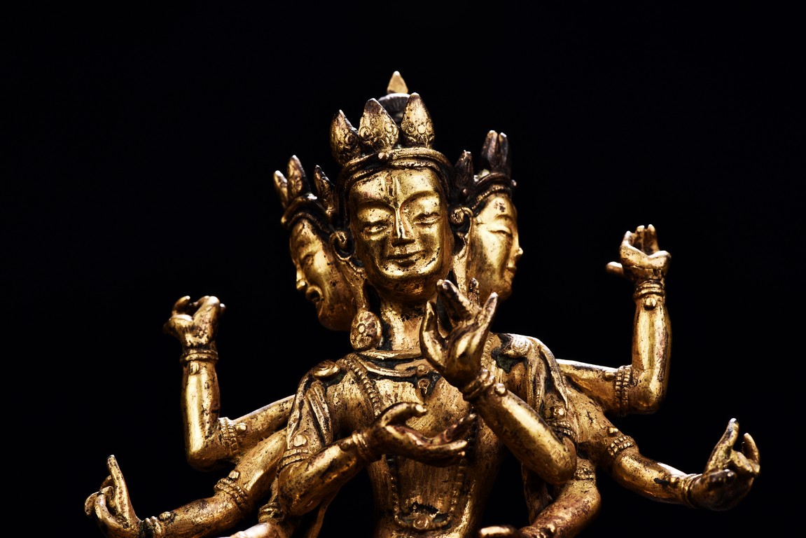 The three headed deity seated in dhyanasana on a double lotus base, the eight arms held in various mudras, dressed in a dhoti with elaborate jewellery, the hair piled up into a chignon crowned with a tiara