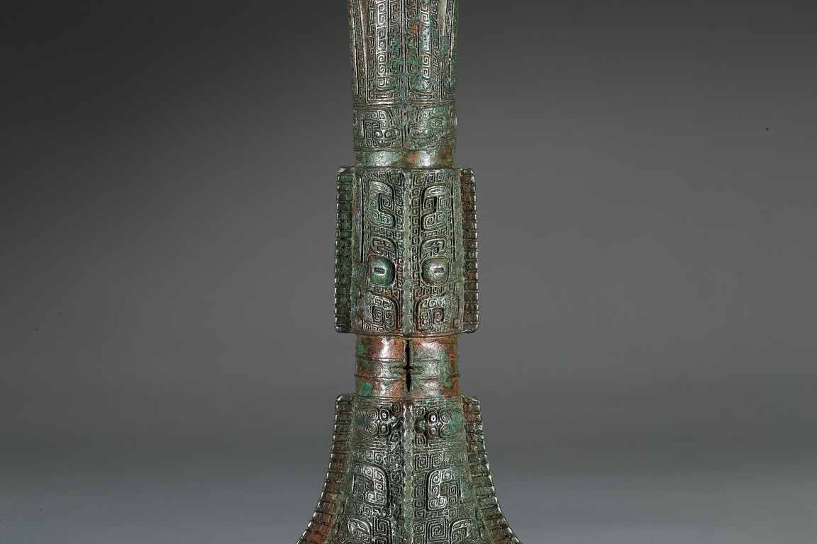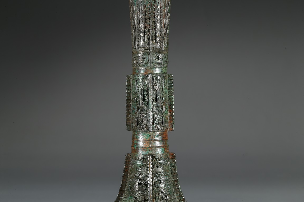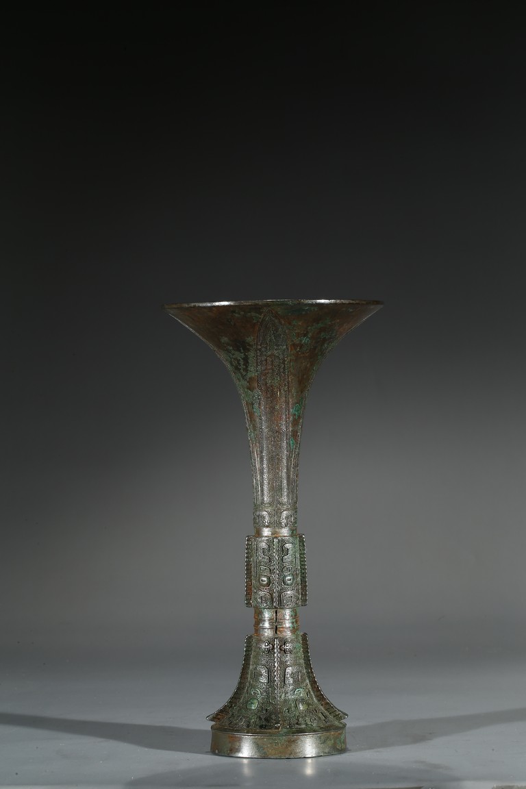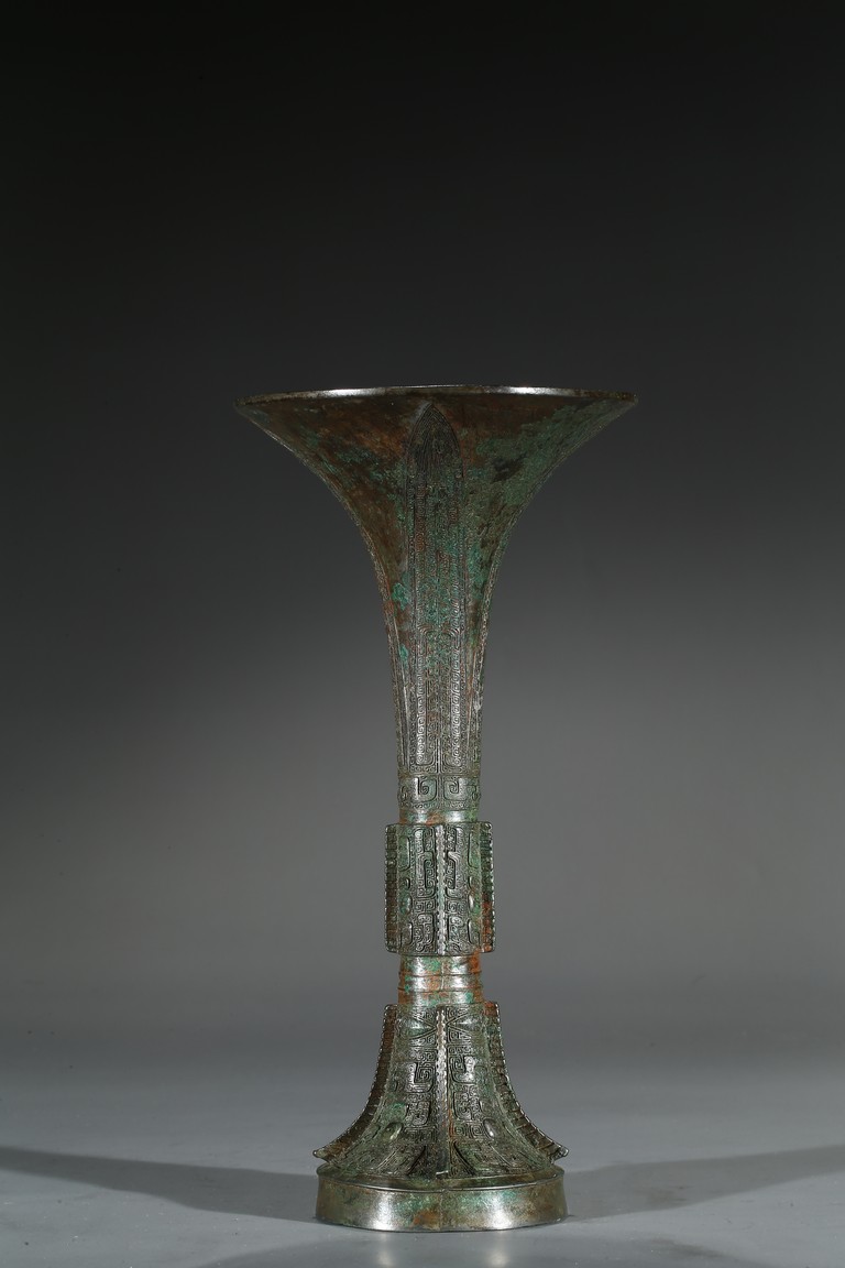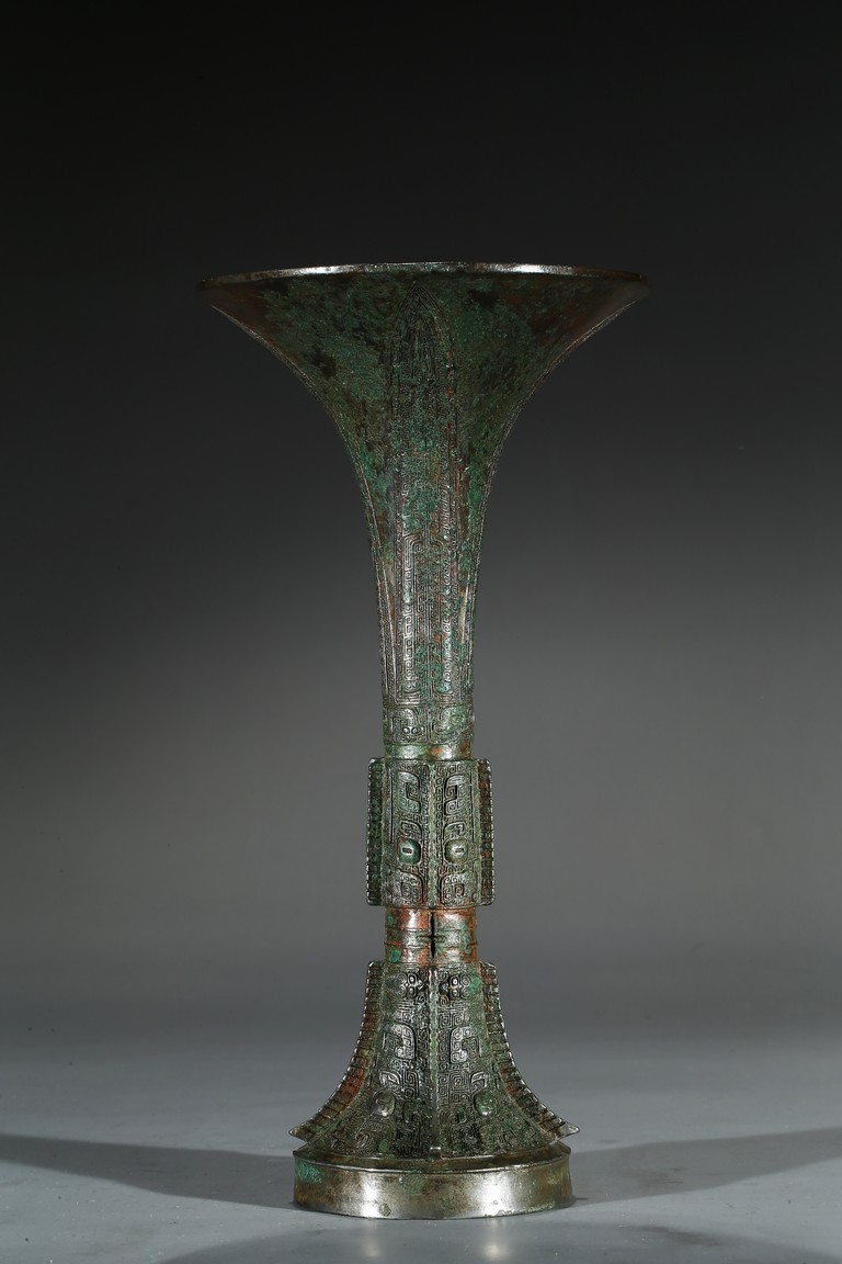 Of slender waisted form, crisply cast around the mid-section with pairs of taotie masks with raised eyes divided by notched flanges, the splayed foot similarly decorated, the tall flared neck encircled by four upright triangular blades, the underside cast with one pictogram. The surface with areas of malachite encrustation. Late Shang Dynasty period.