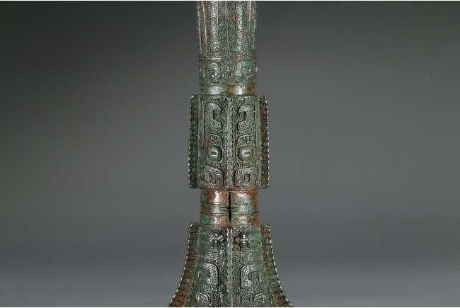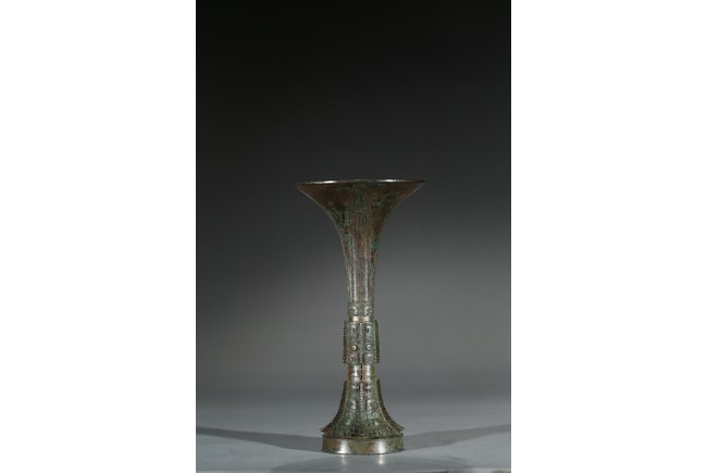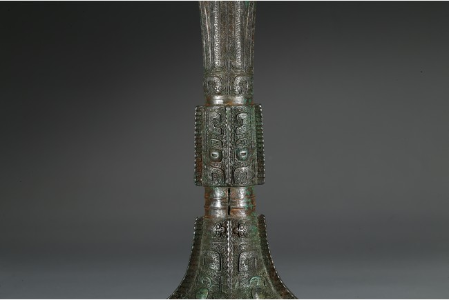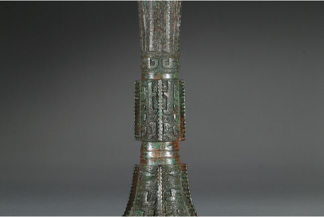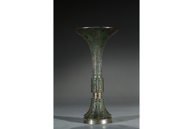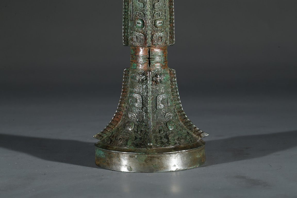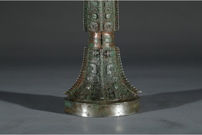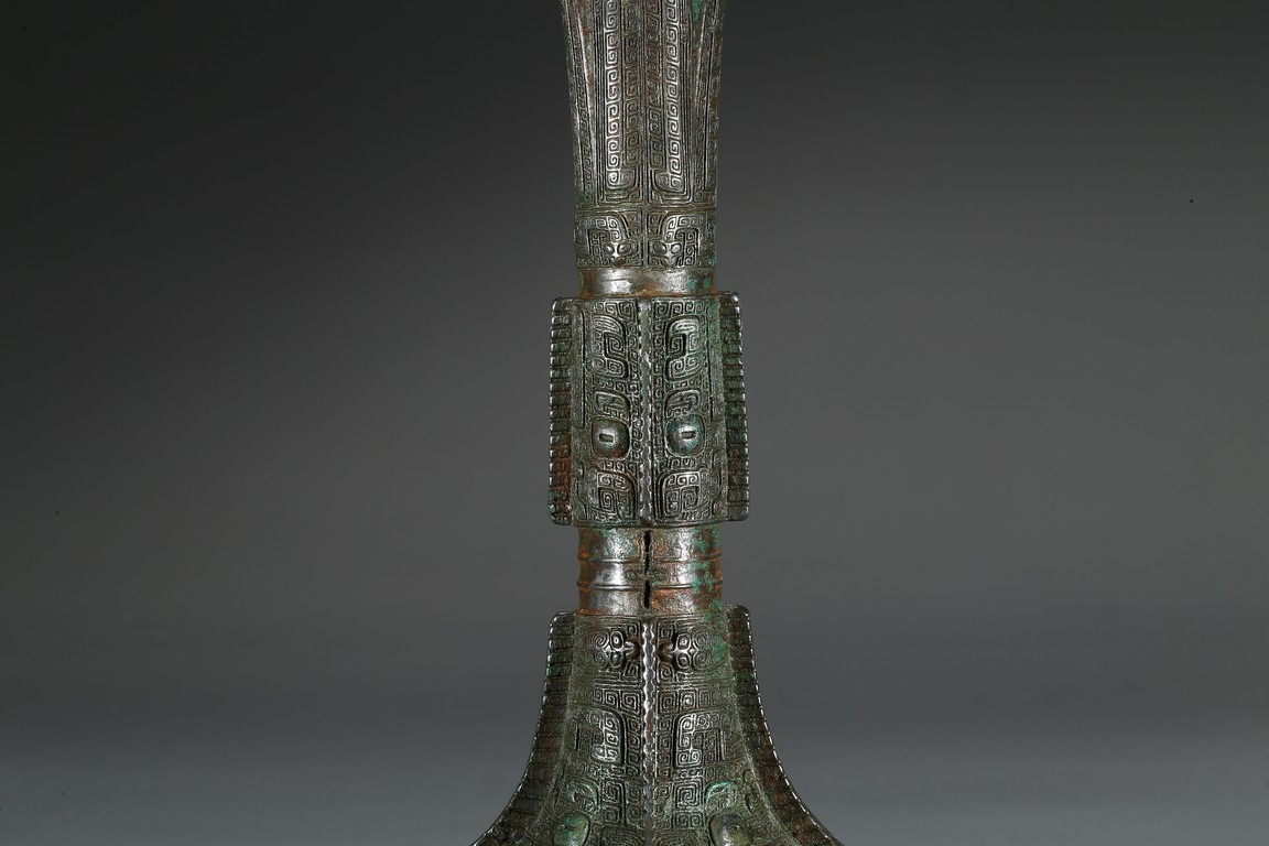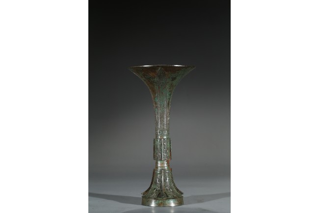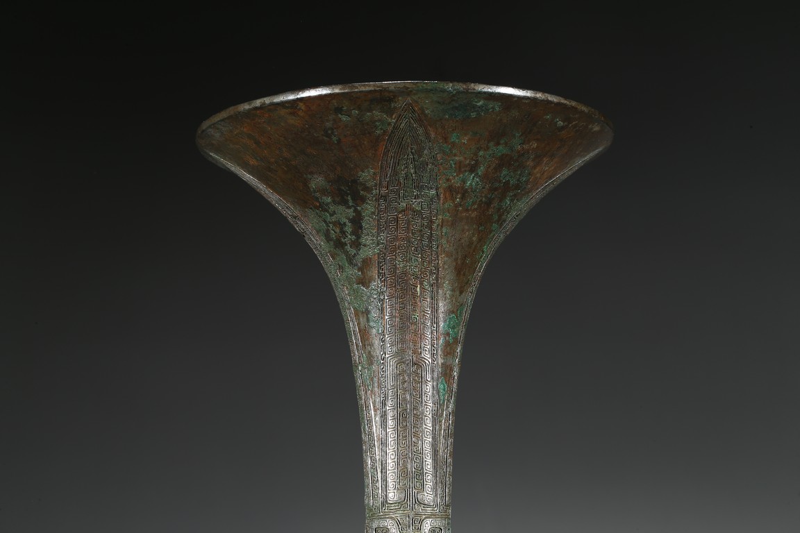 Of slender waisted form, crisply cast around the mid-section with pairs of taotie masks with raised eyes divided by notched flanges, the splayed foot similarly decorated, the tall flared neck encircled by four upright triangular blades, the underside cast with one pictogram. The surface with areas of malachite encrustation. Late Shang Dynasty period.