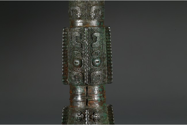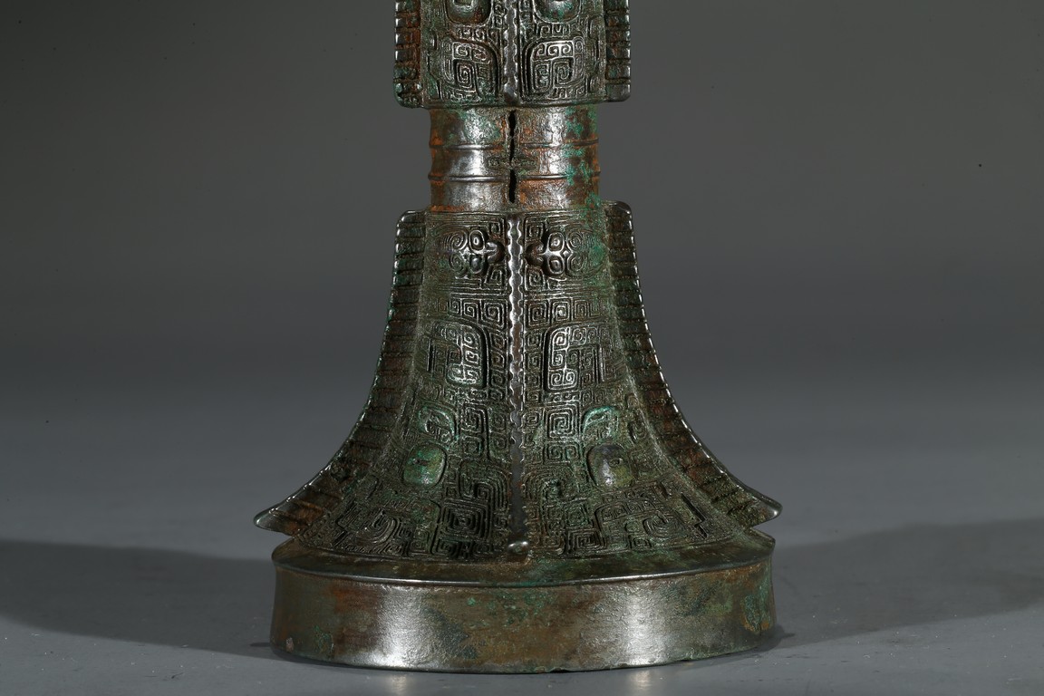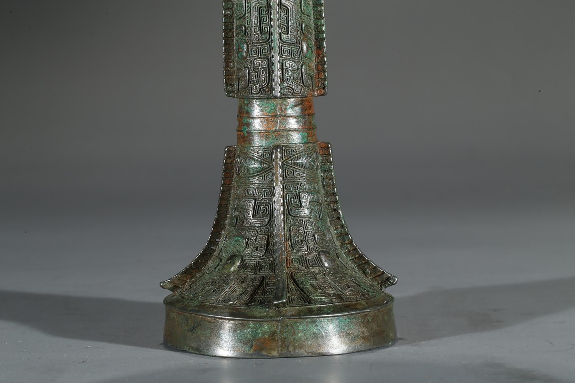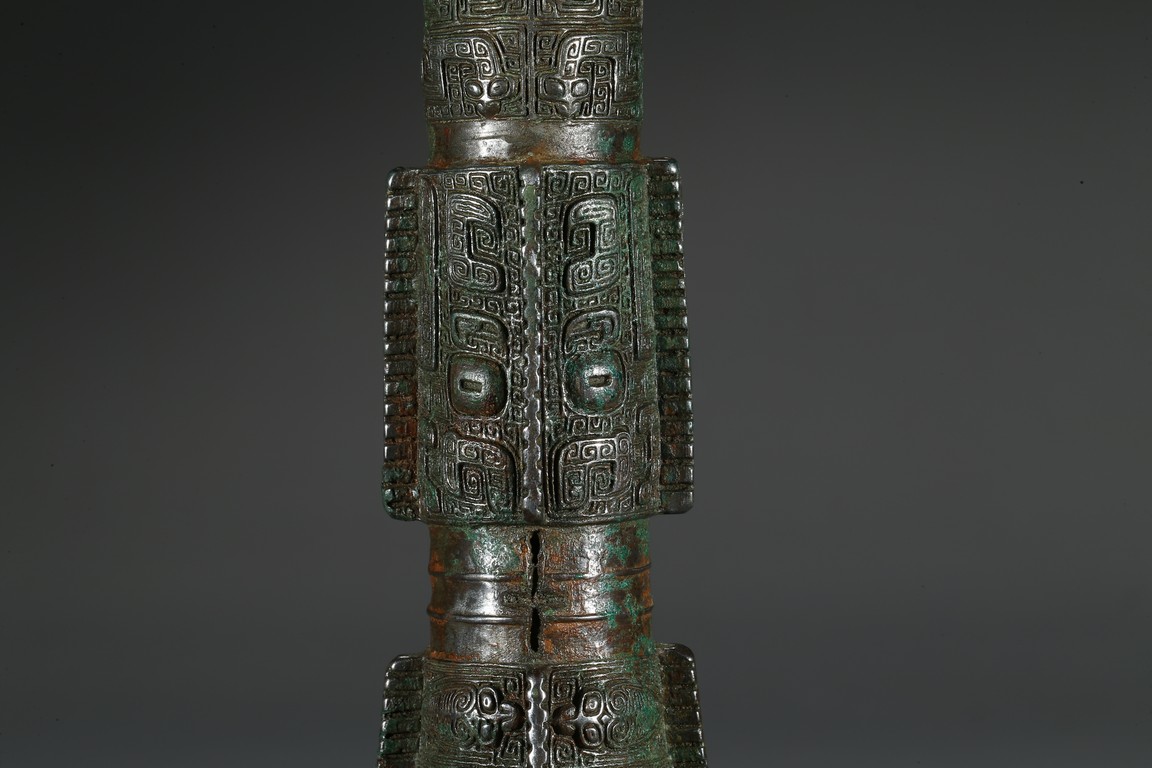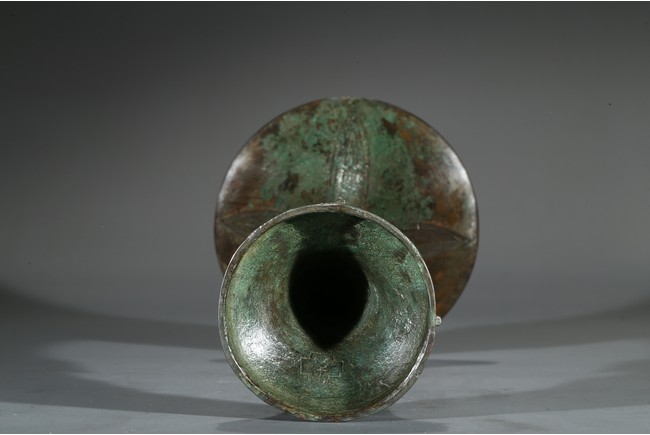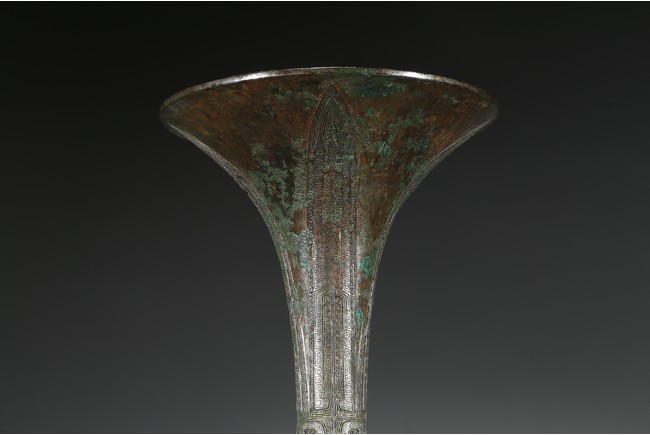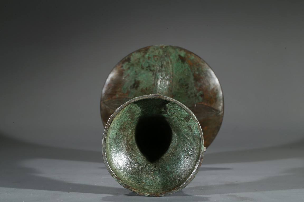 Of slender waisted form, crisply cast around the mid-section with pairs of taotie masks with raised eyes divided by notched flanges, the splayed foot similarly decorated, the tall flared neck encircled by four upright triangular blades, the underside cast with one pictogram. The surface with areas of malachite encrustation. Late Shang Dynasty period.