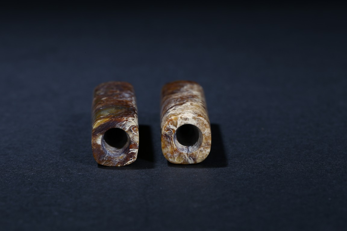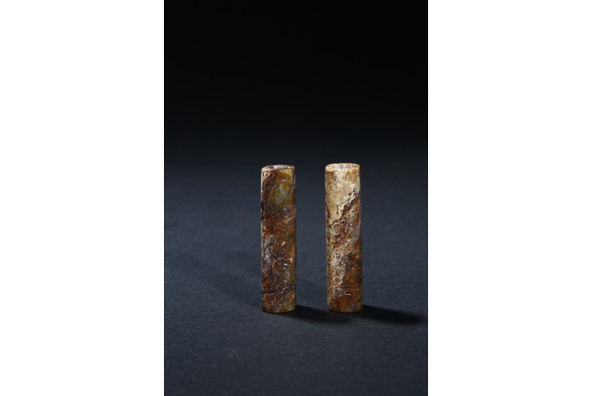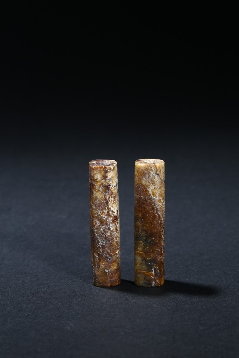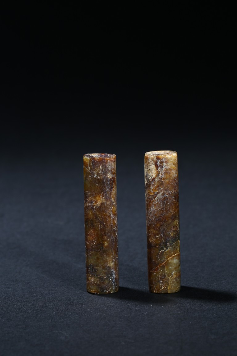 Each of cylinder form and the stone is of mottled russet and dark brown opaque tone. Shang Dynasty period.