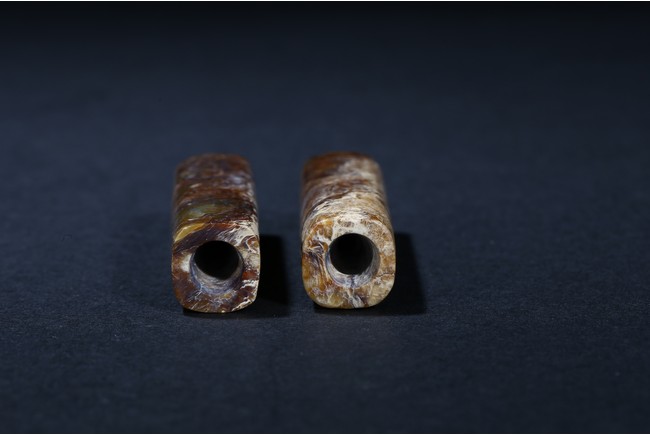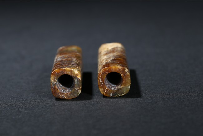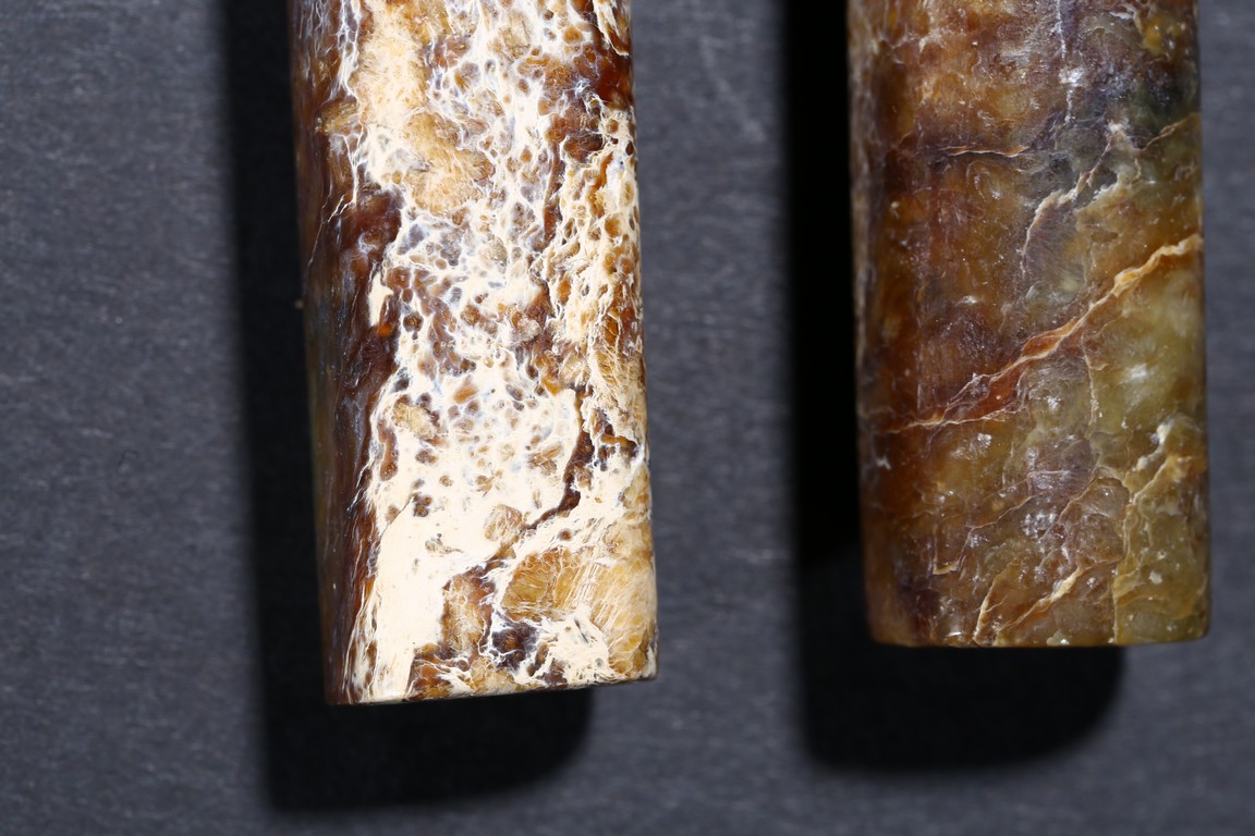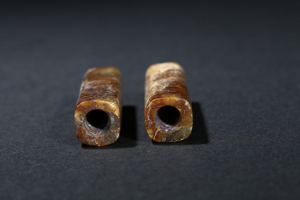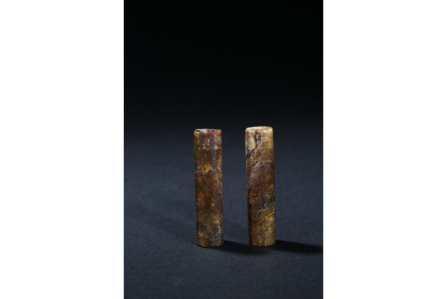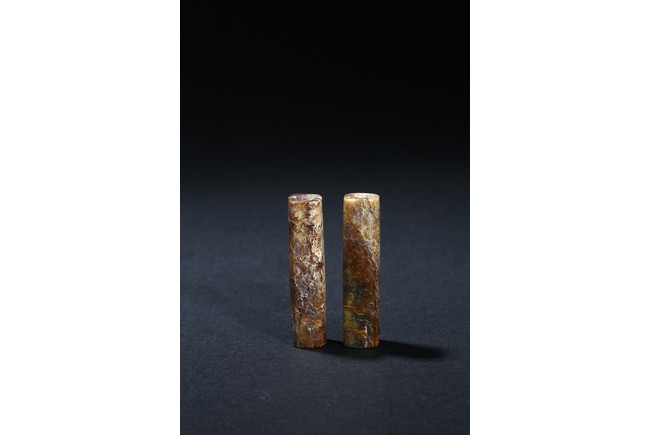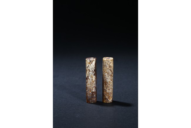 Each of cylinder form and the stone is of mottled russet and dark brown opaque tone. Shang Dynasty period.