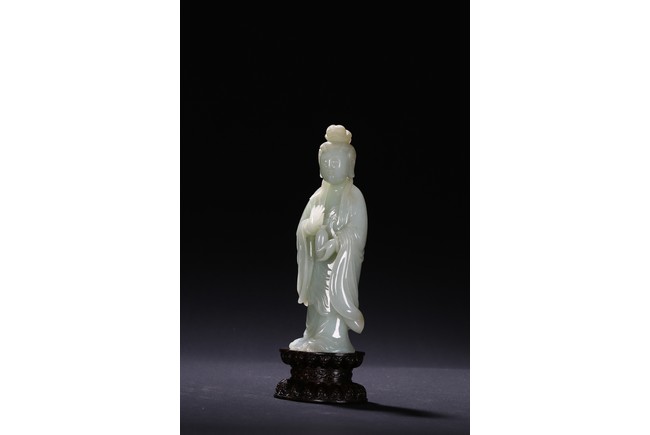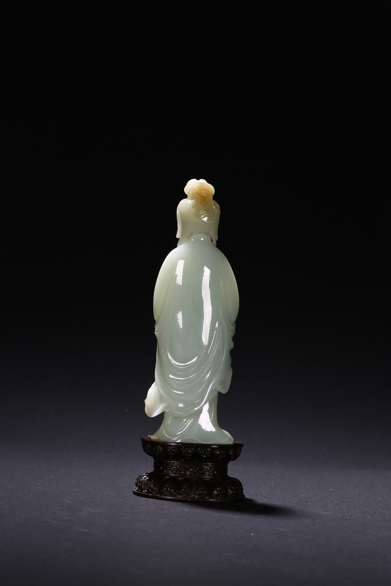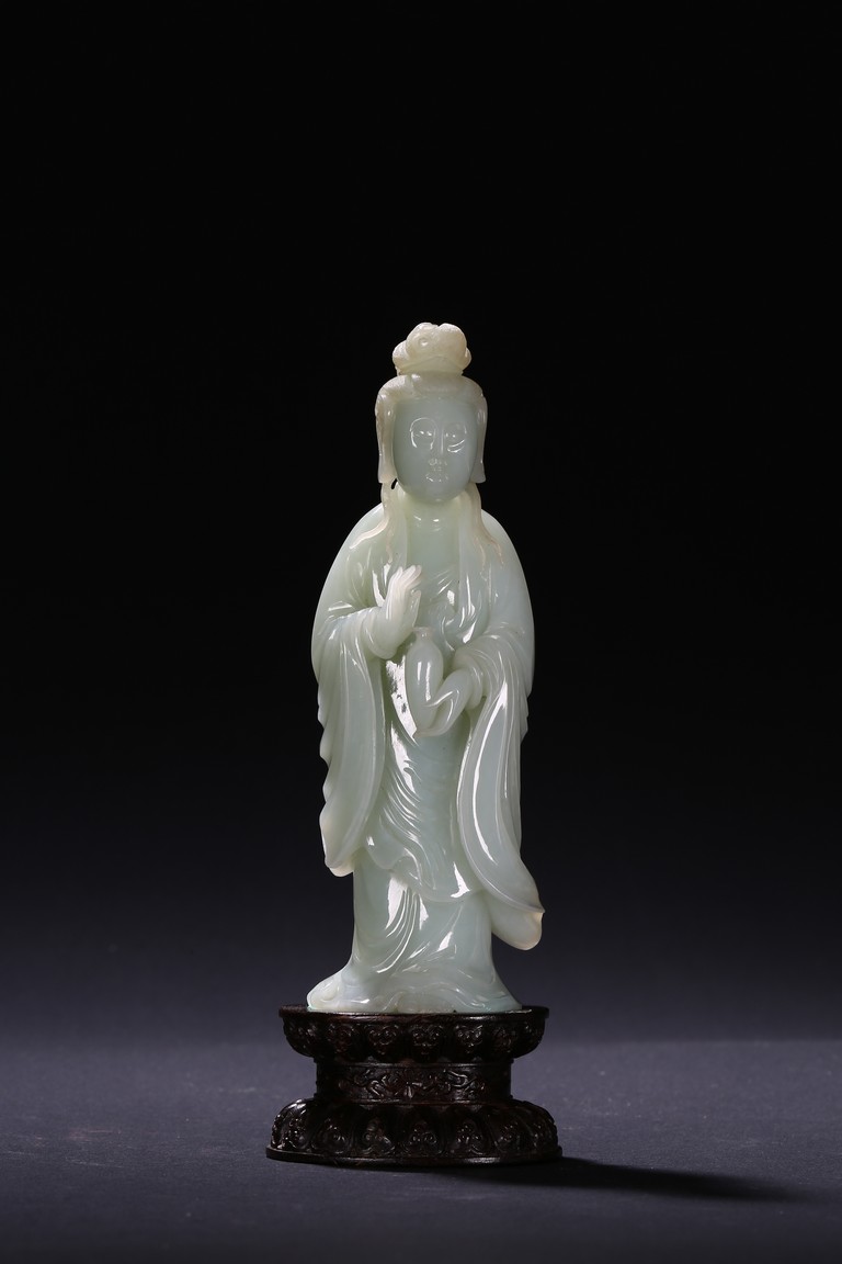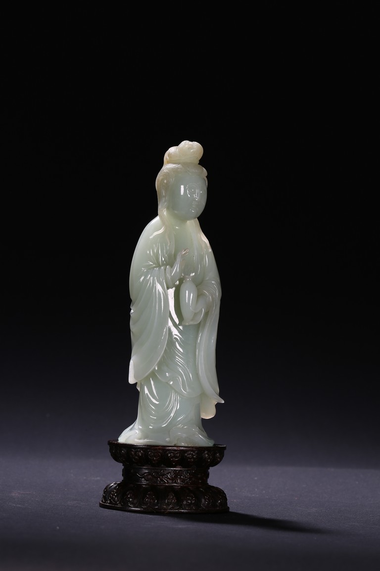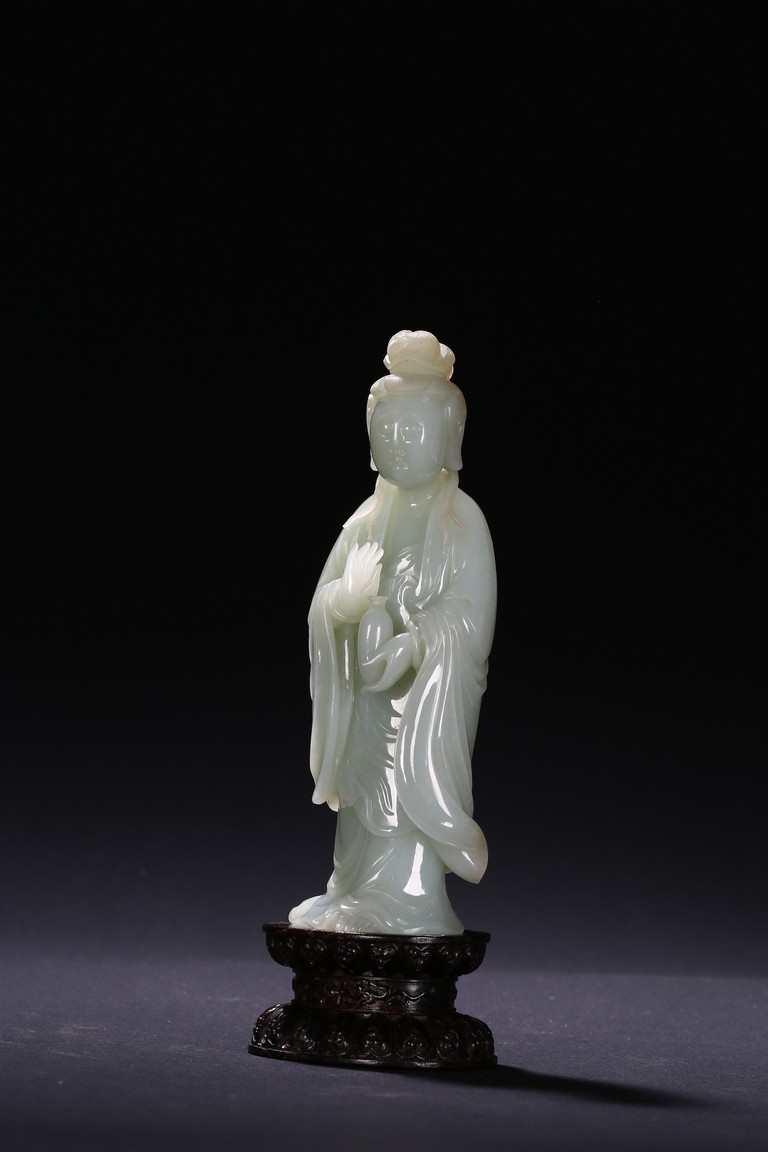 The Guanyin is shown standing with left hand holding vase and right hand raised in mudra, wearing voluminous robe falling in elegant folds, face with serene expression, all supported on a wood lotus stand. Republic period.