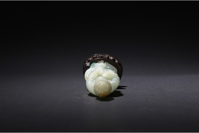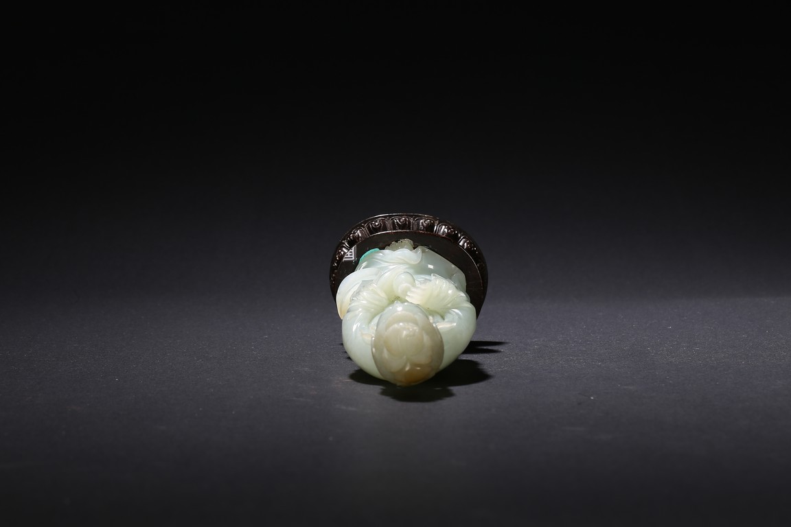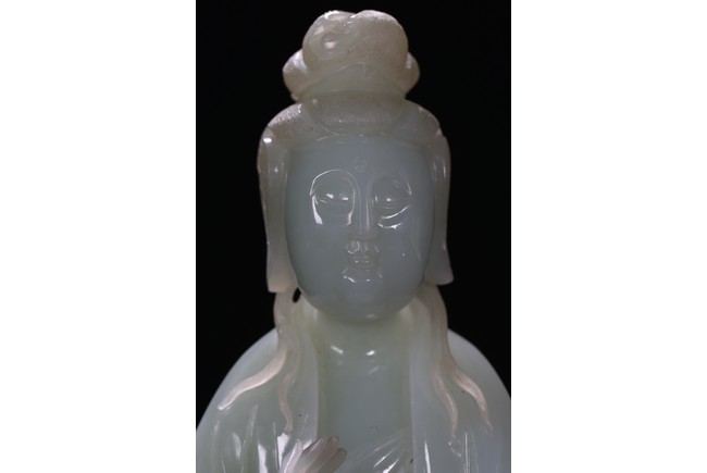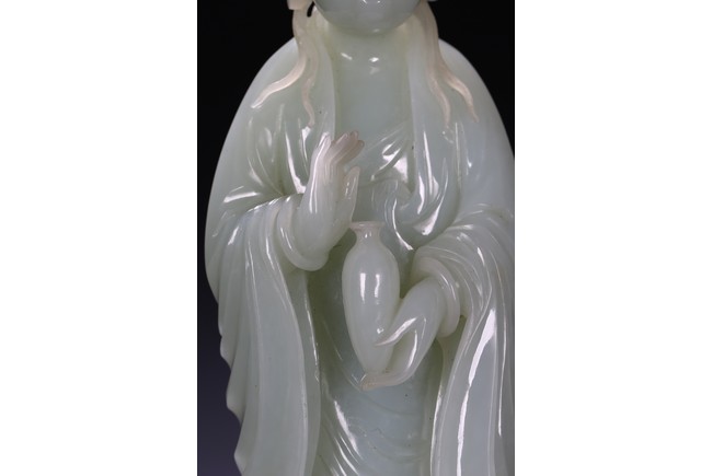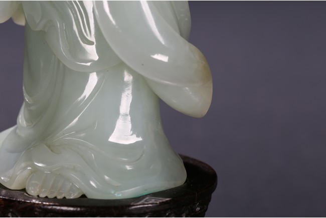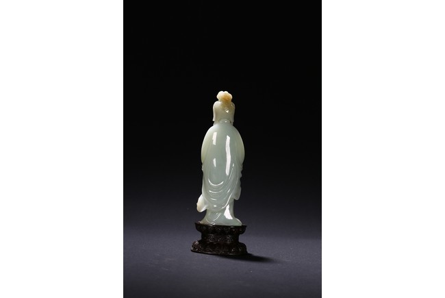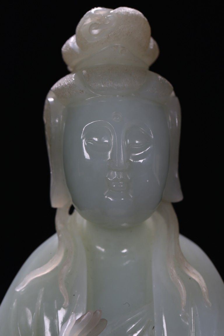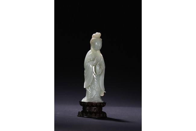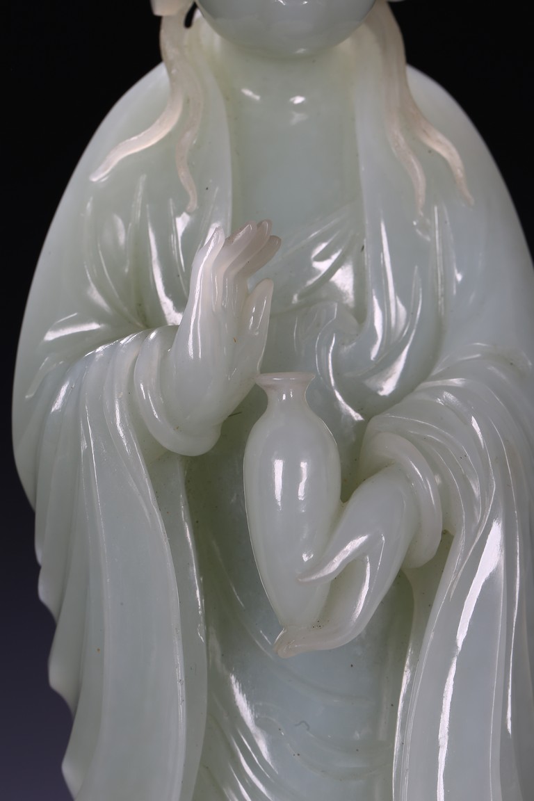 The Guanyin is shown standing with left hand holding vase and right hand raised in mudra, wearing voluminous robe falling in elegant folds, face with serene expression, all supported on a wood lotus stand. Republic period.