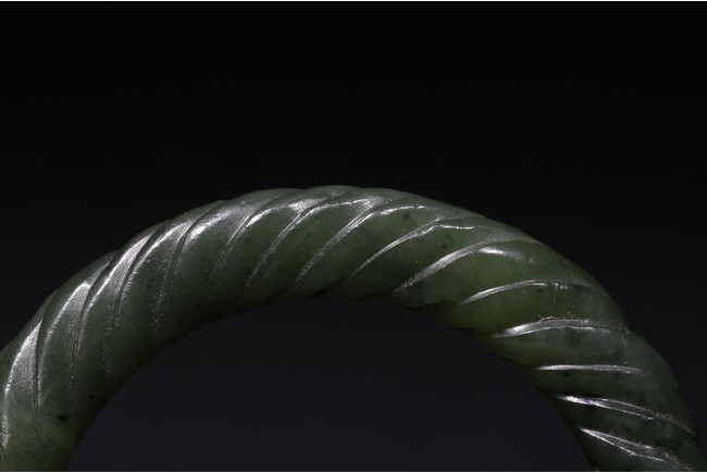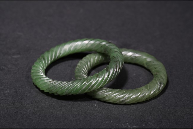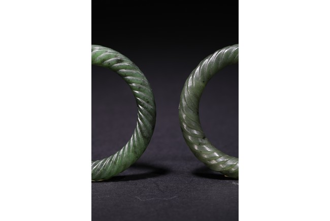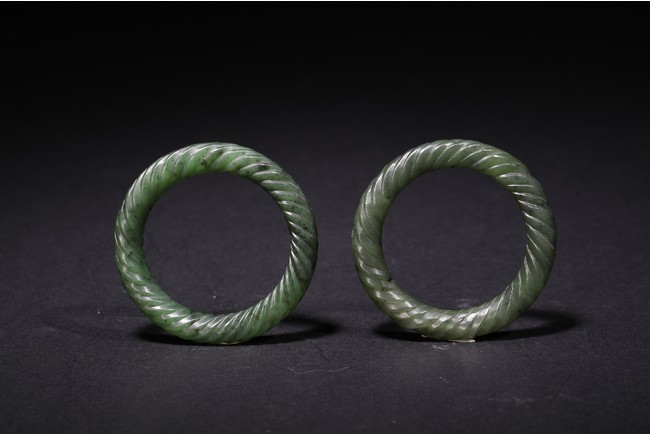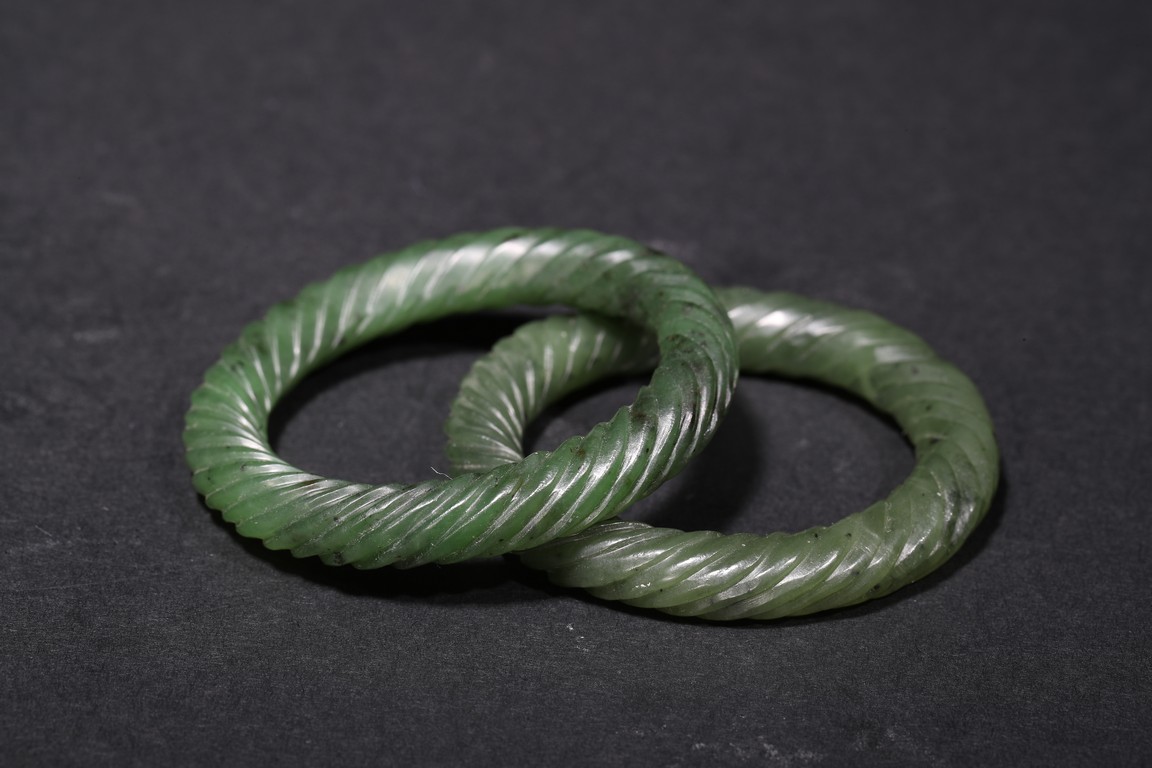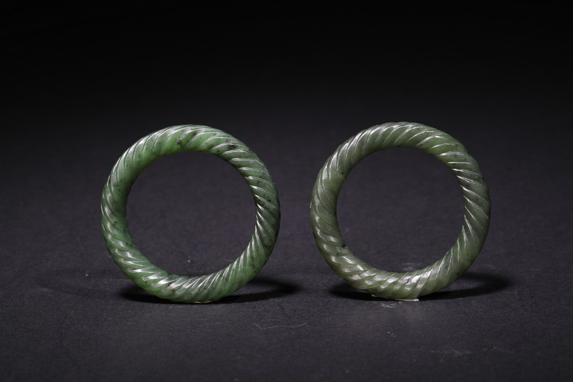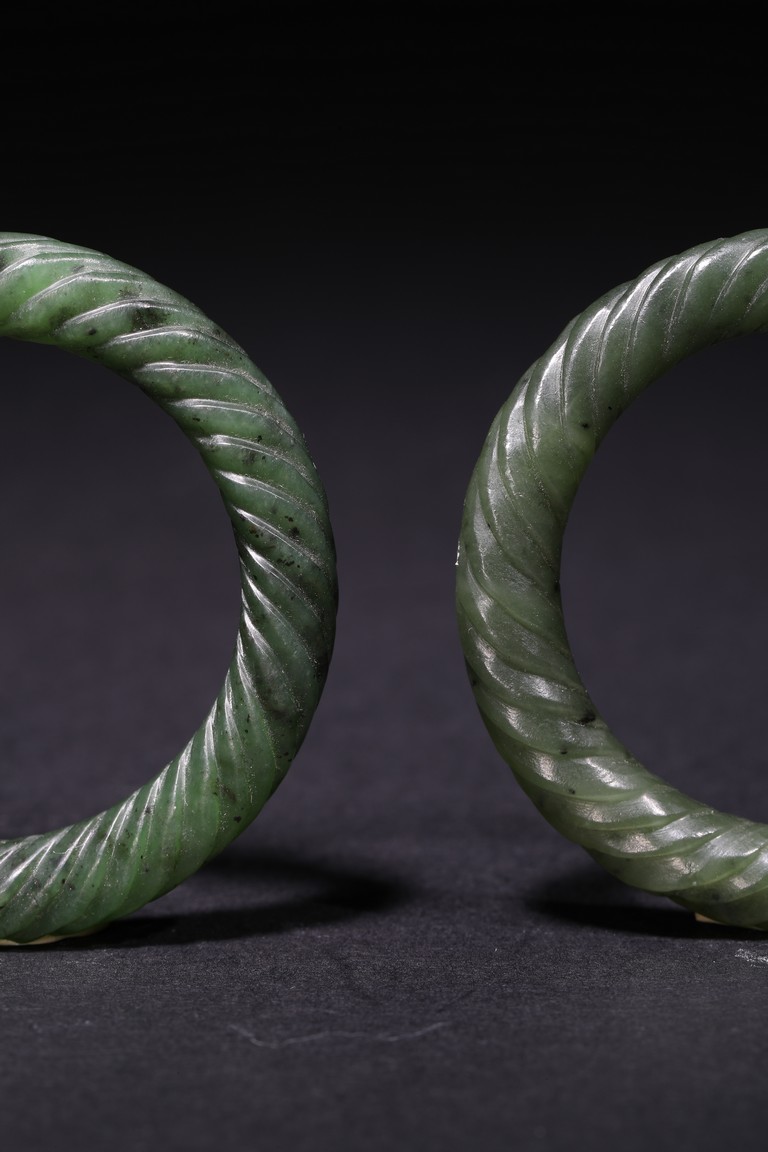 Each of small circular form, the stone of an even spinach-green tone with paler green inclusions and darker green mottling.