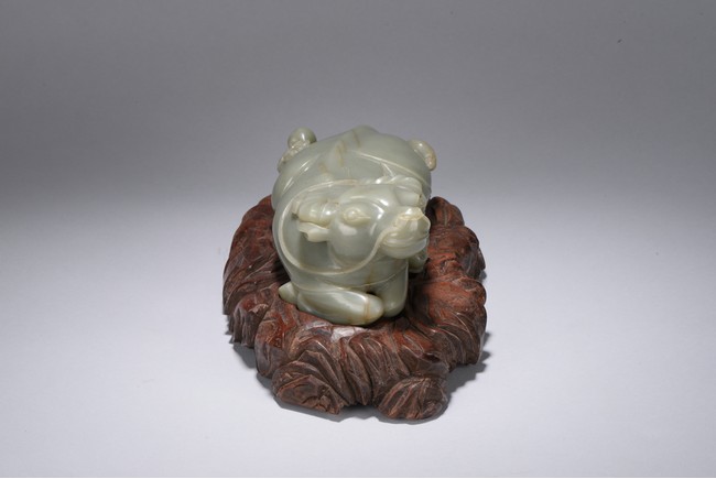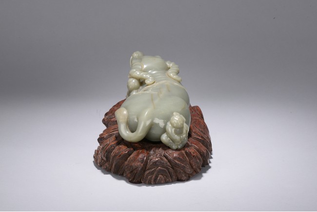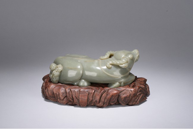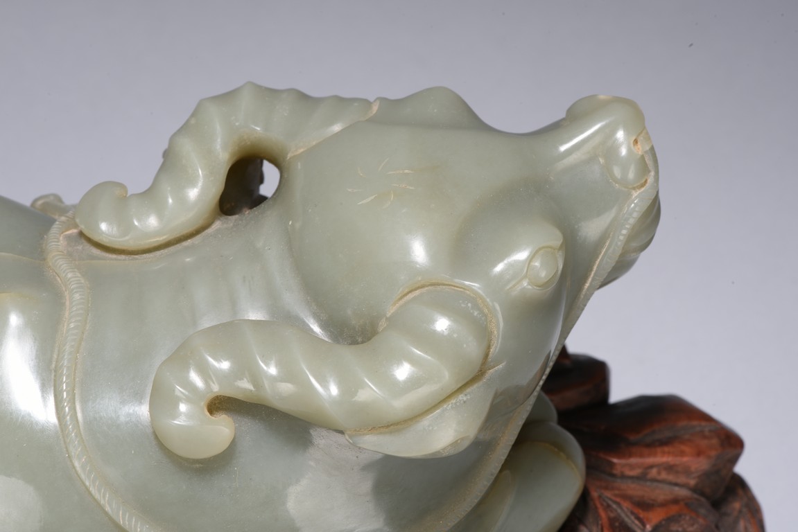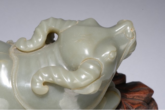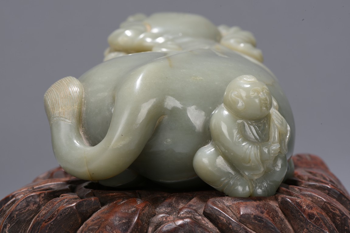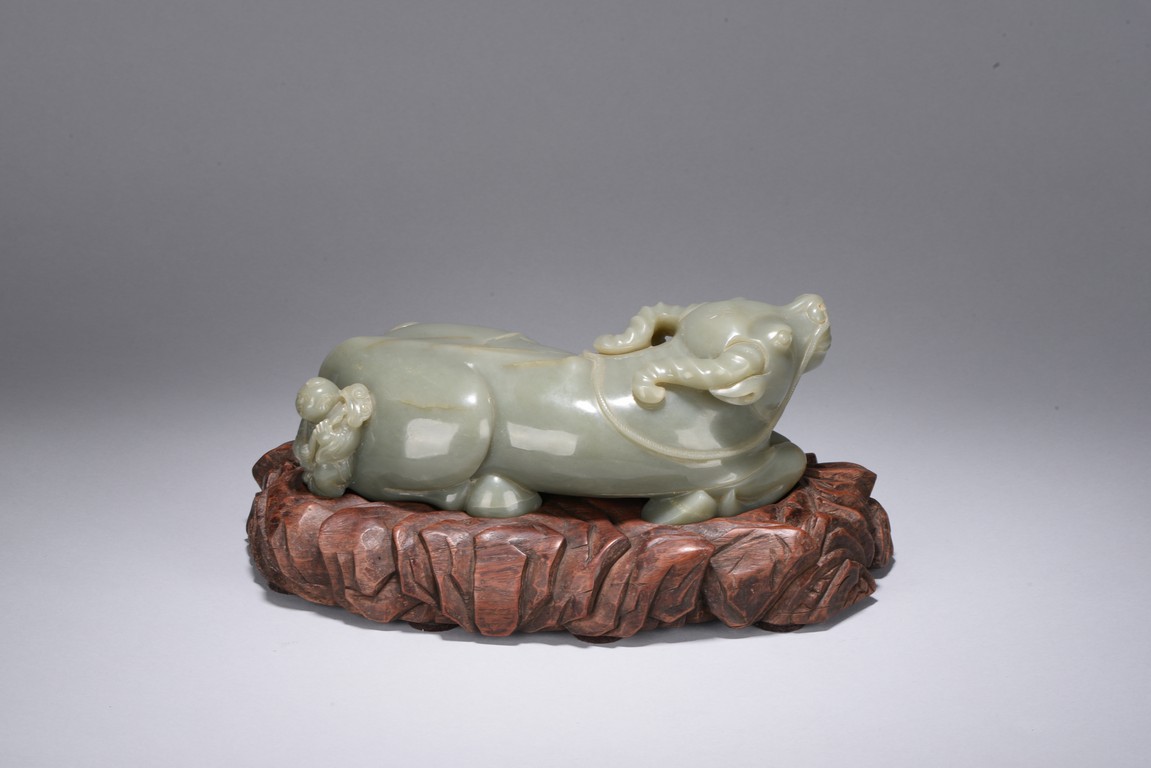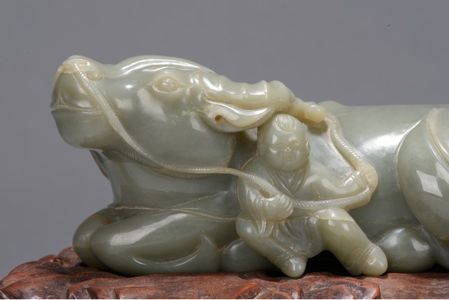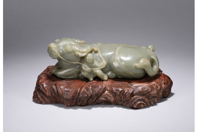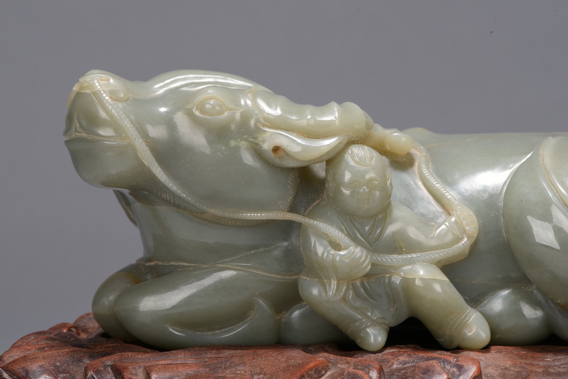The recumbent buffalo is carved with four feet tucked underneath body,the head slightly raised and tail swept to the left,with a boy sitting beside holding a rope tied through its nostril and over its back,and the other side with a boy holding a large lingzhi. The stone is of even celadon tone with minor russet veins. Accompanied with hardwood carved base imitating the rocky ground. Qing Dynasty period.