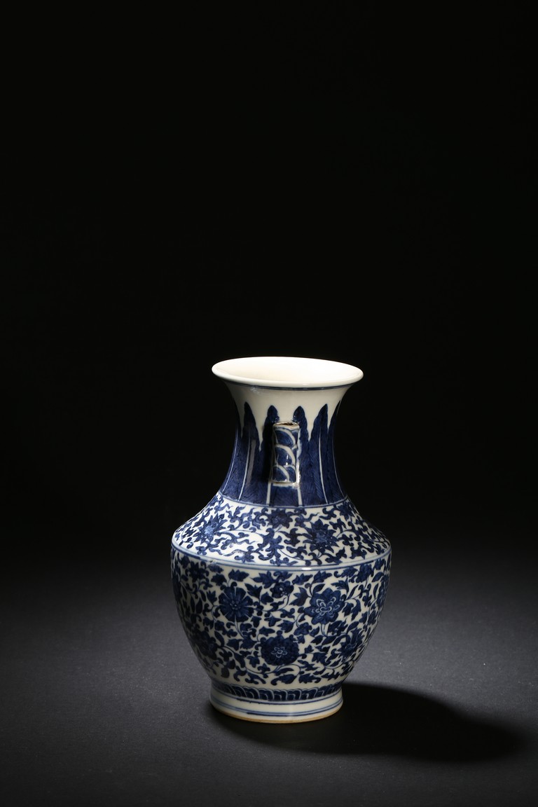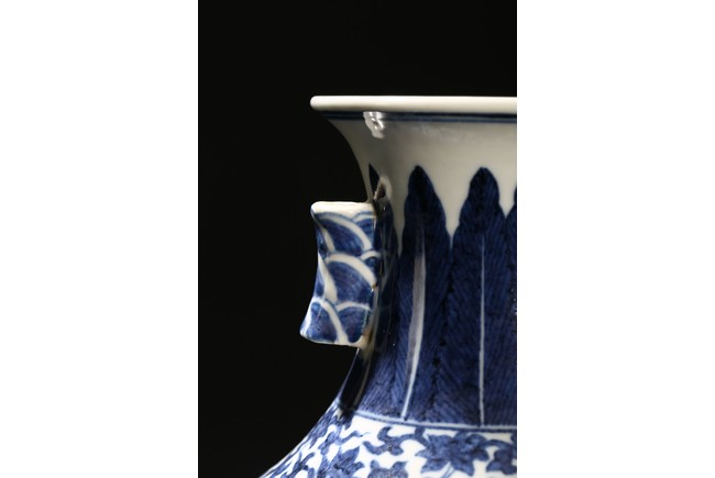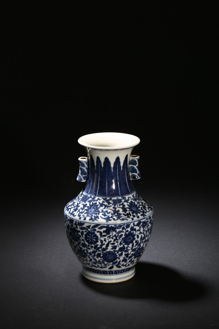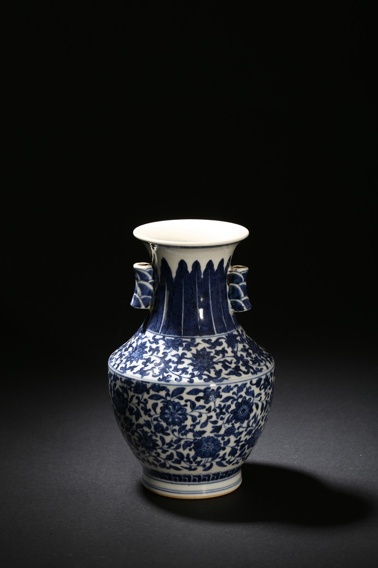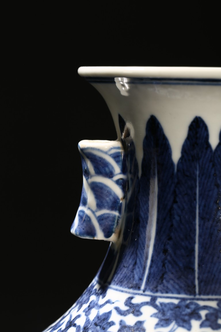 Modelled in circular form, raised by a cylindrical ring foot. Decorated with blue flowers and leaves pattern spreading from shoulder to the water ripple band at the top of the foot. On its neck, painted radial long leaf pattern as a circle, and framed two ears. Qing Dynasty period.