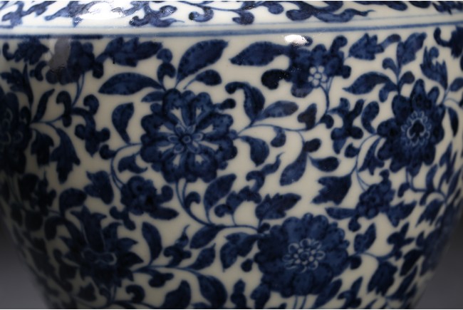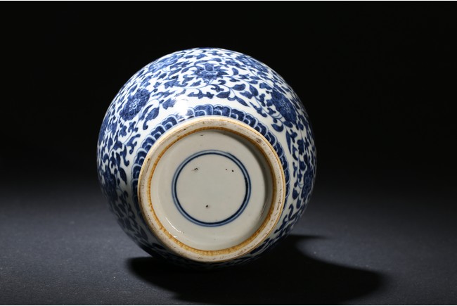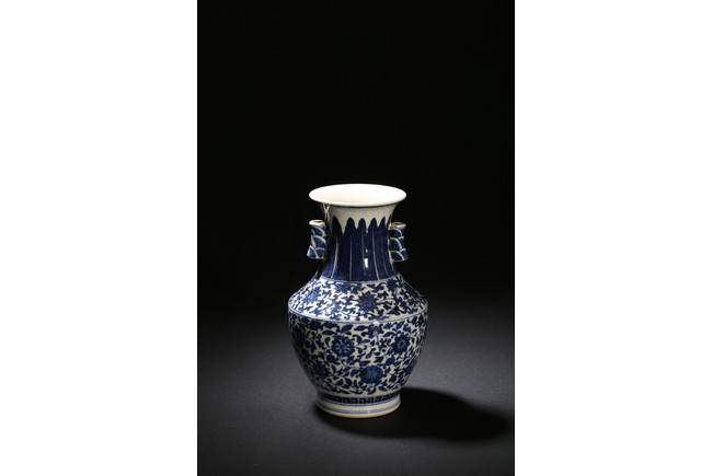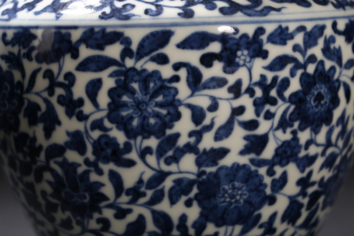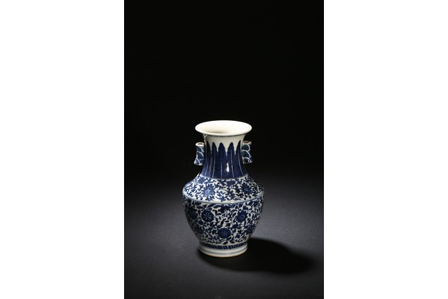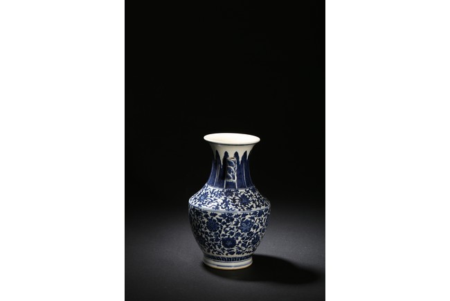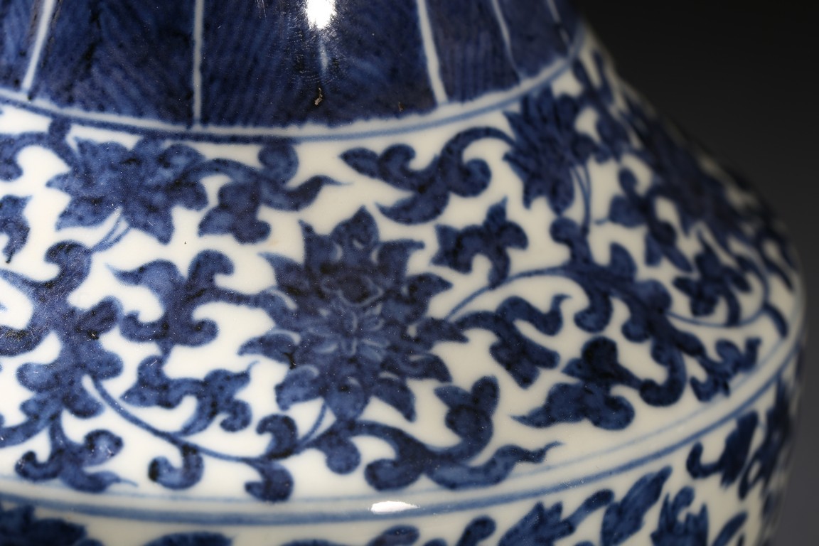 Modelled in circular form, raised by a cylindrical ring foot. Decorated with blue flowers and leaves pattern spreading from shoulder to the water ripple band at the top of the foot. On its neck, painted radial long leaf pattern as a circle, and framed two ears. Qing Dynasty period.