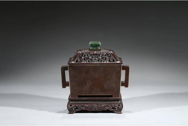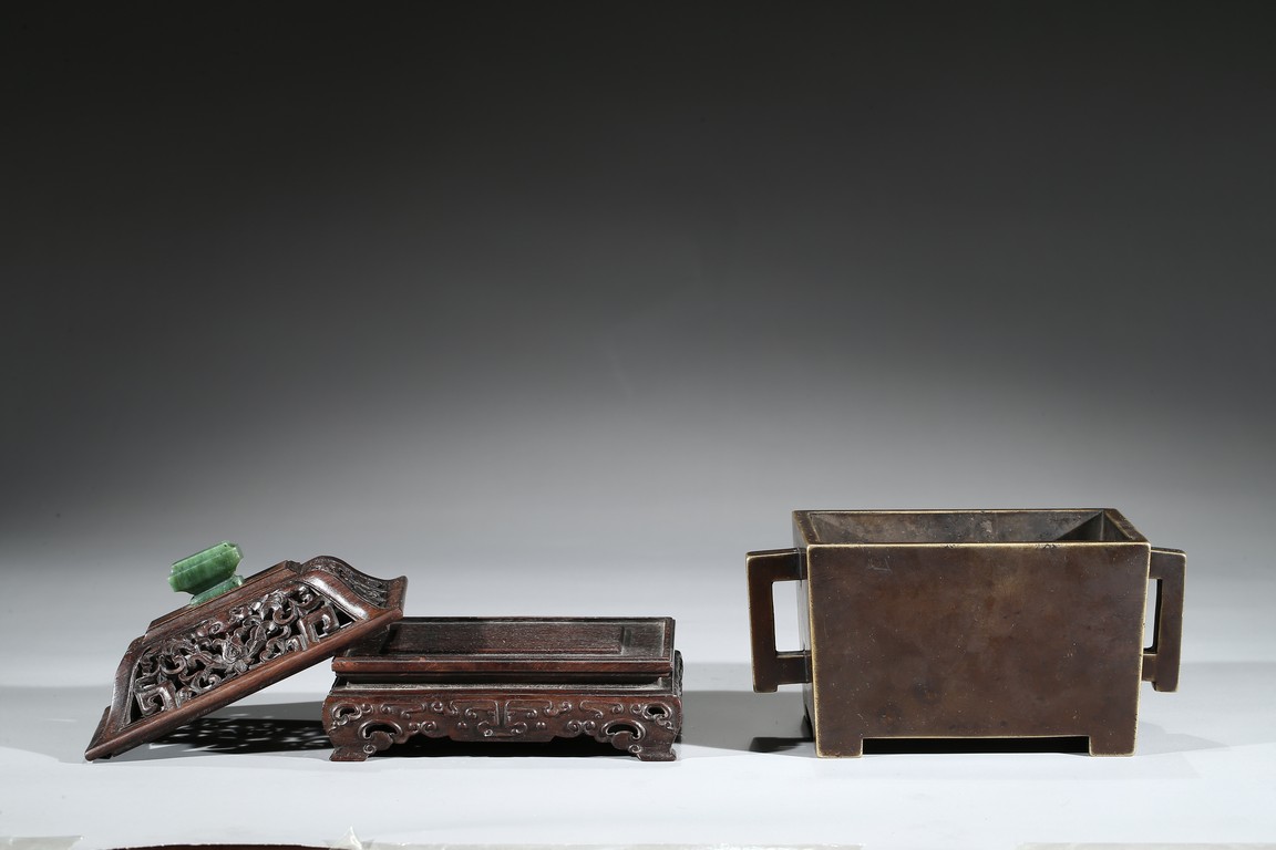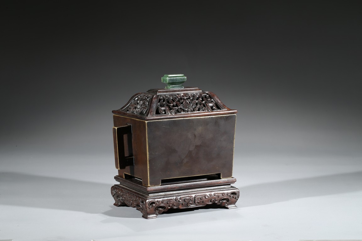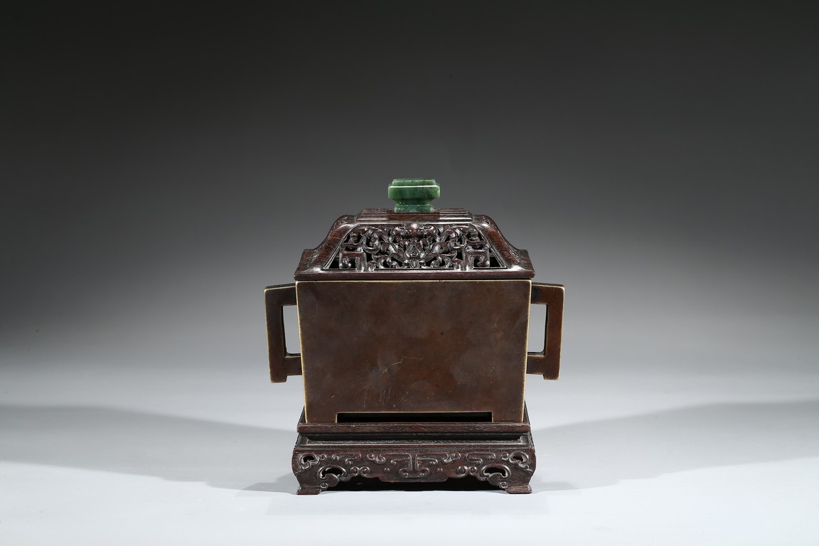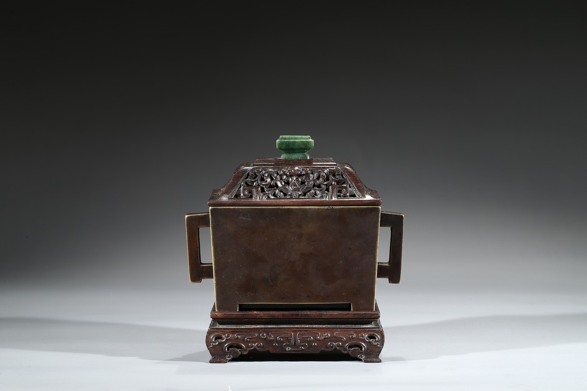 The square-form body rising from four short legs to a slightly flared rim, the sides flanked with a pair of opposing angular handles, the exterior patinated to a warm dark brown color, the base cast with two characters within a recessed square, completed with zitan cover and stand. Qing Dynasty period.
