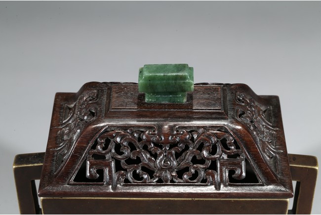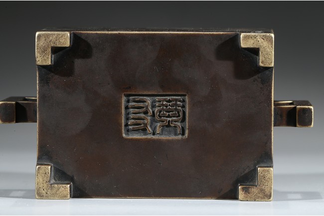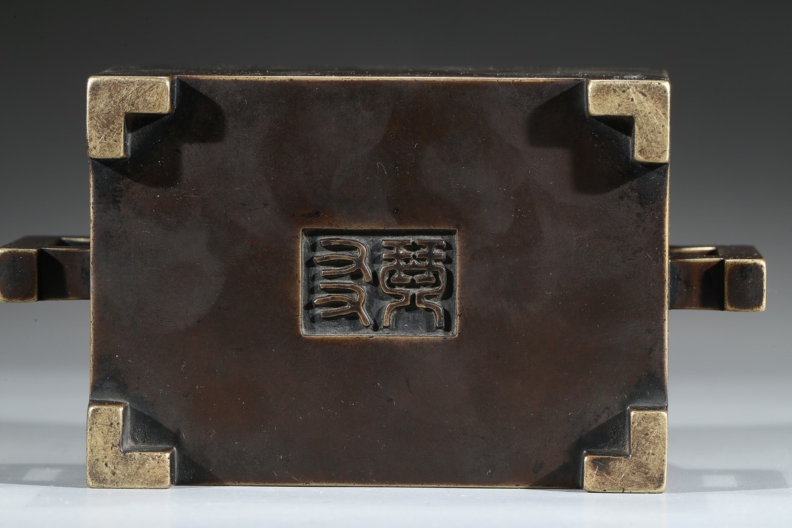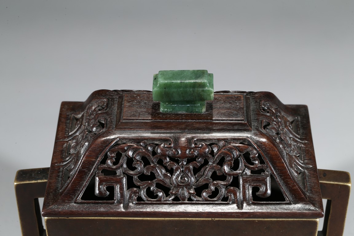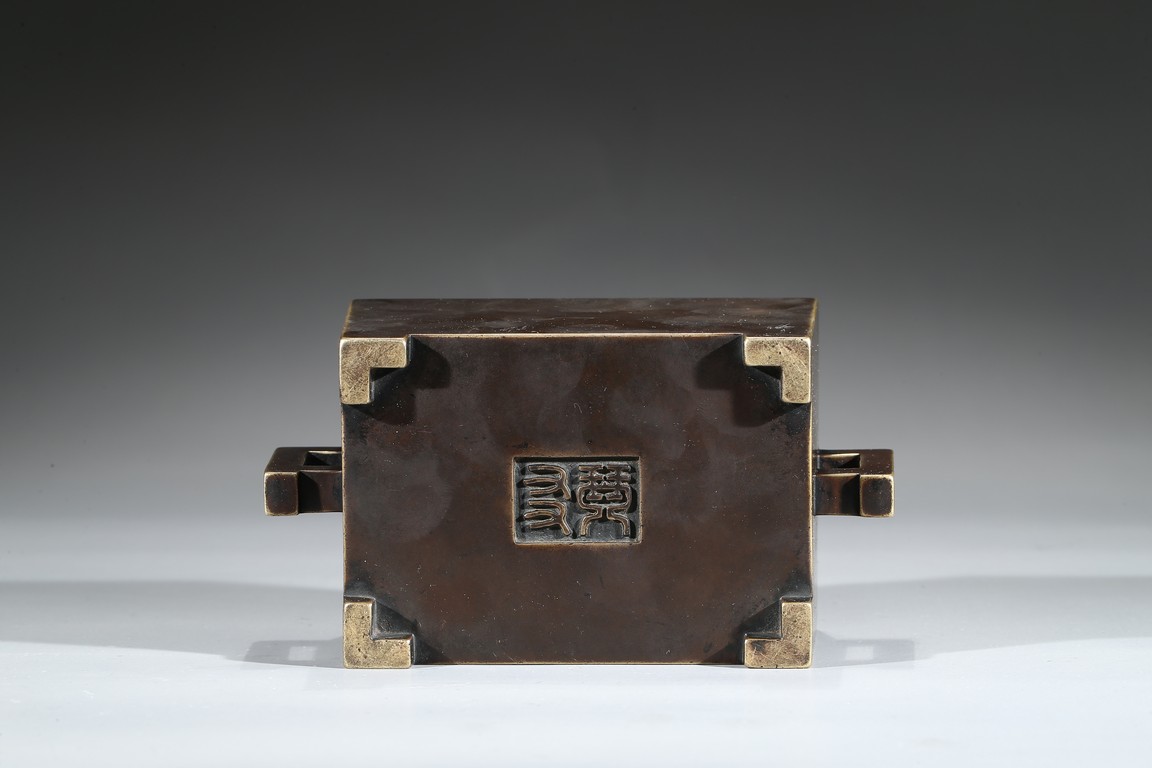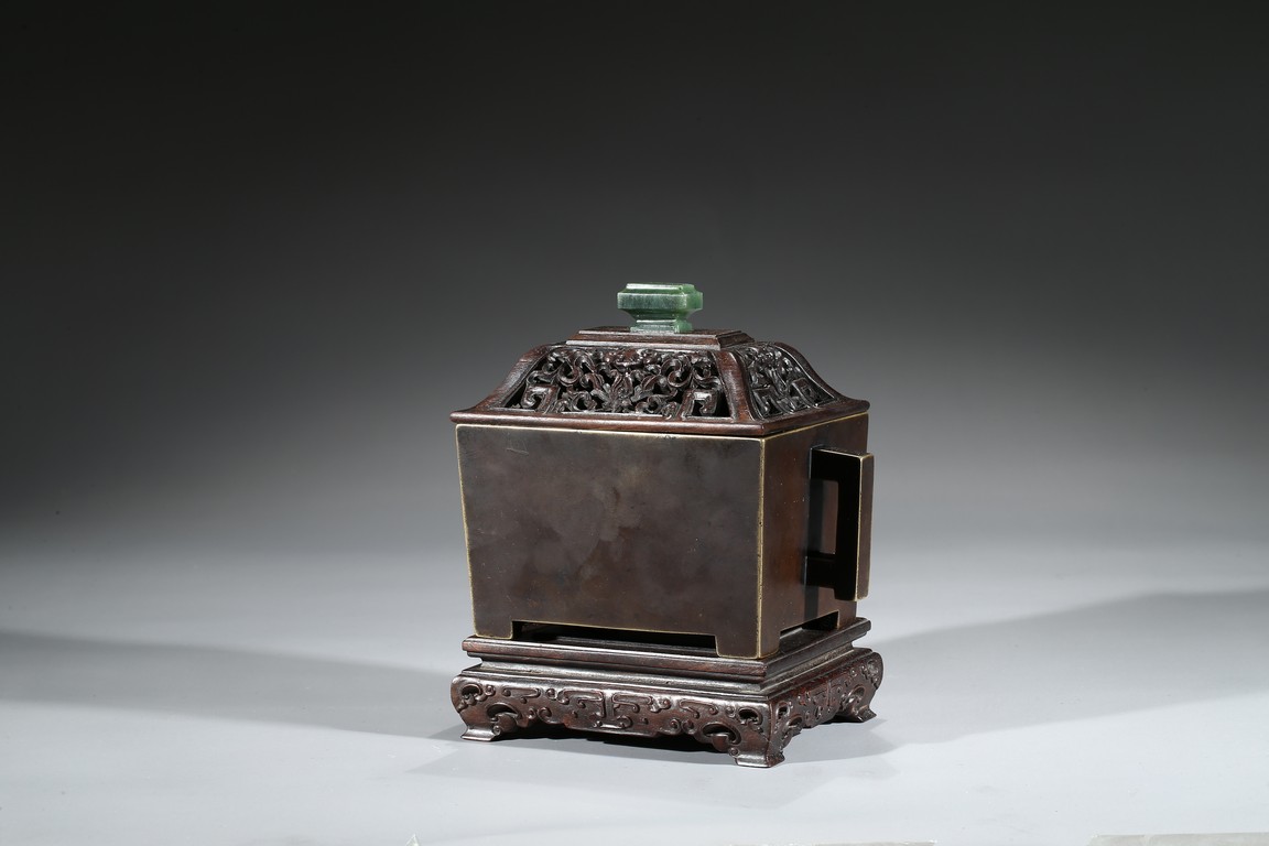 The square-form body rising from four short legs to a slightly flared rim, the sides flanked with a pair of opposing angular handles, the exterior patinated to a warm dark brown color, the base cast with two characters within a recessed square, completed with zitan cover and stand. Qing Dynasty period.