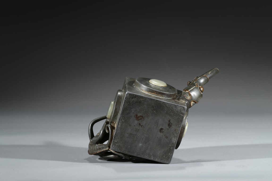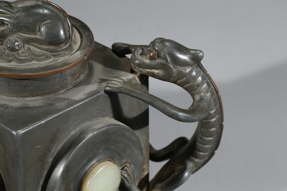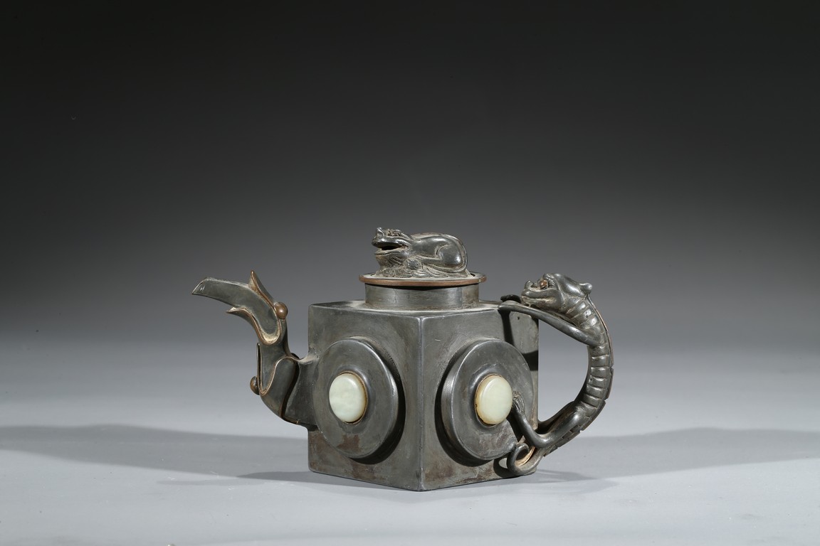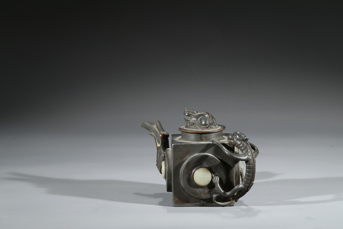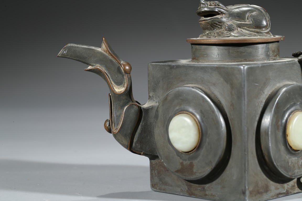 Of square section, each side inlaid with circular jade, flanked by chilling handle and tree branch spout, the cover topped with a recumbent animal. Qing Dynasty period.