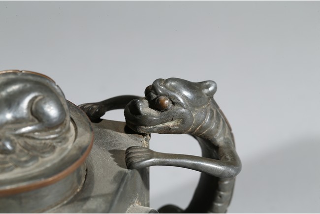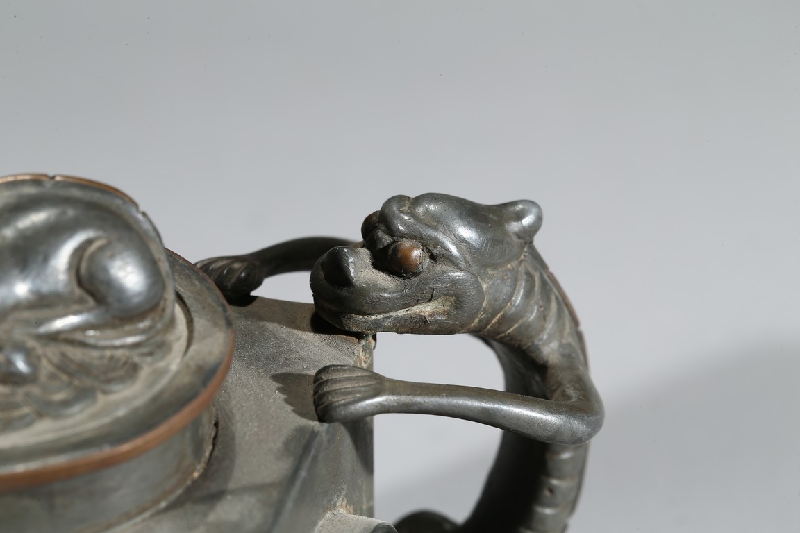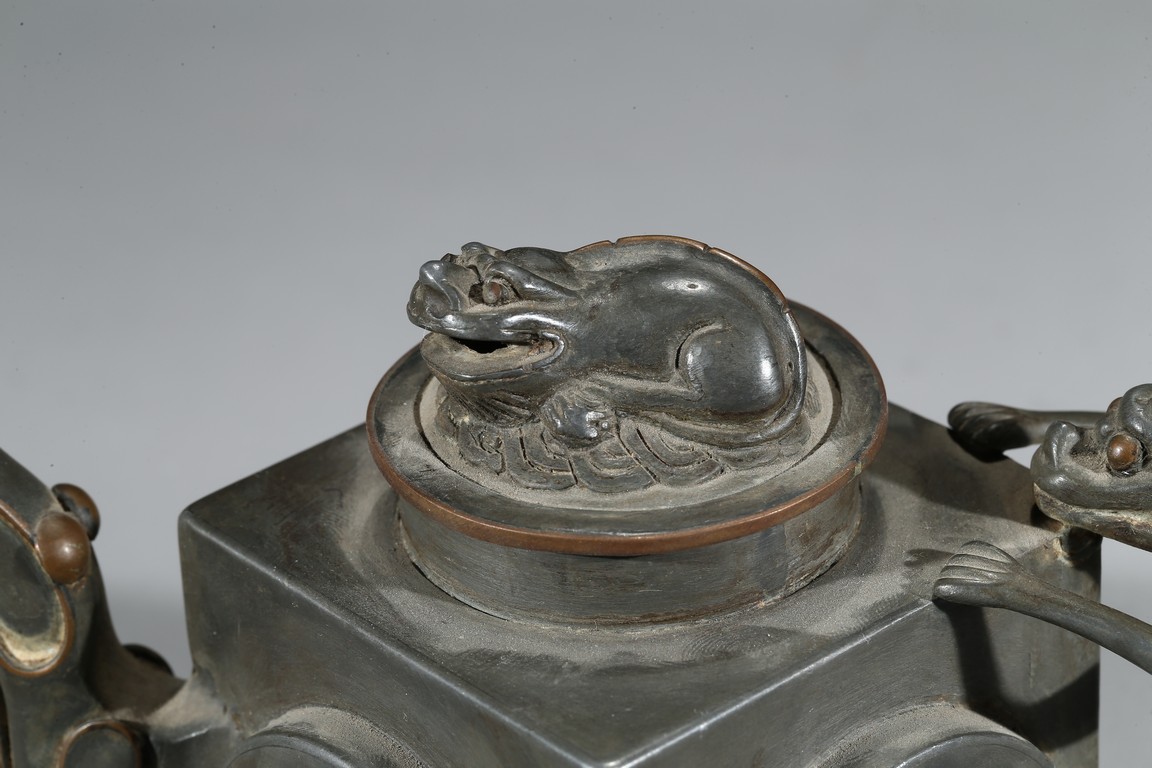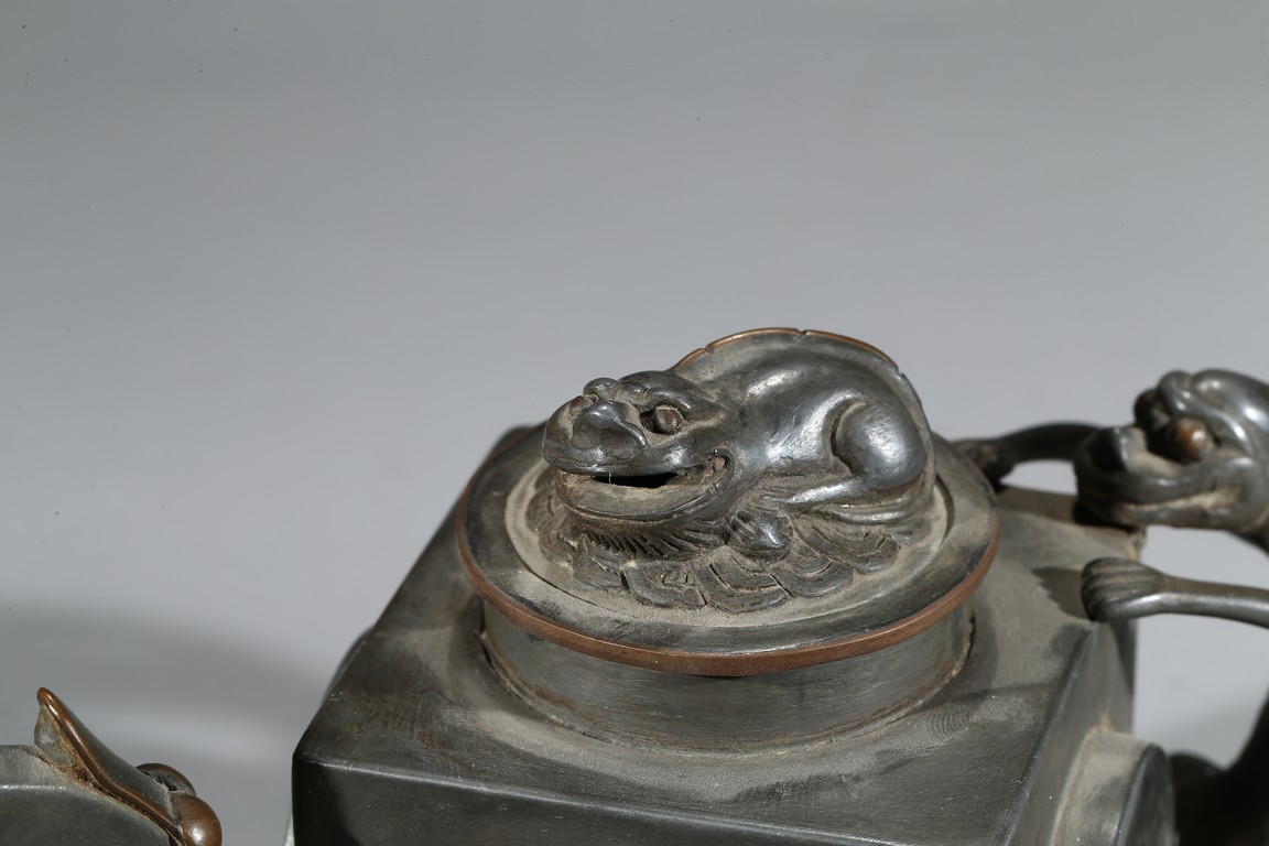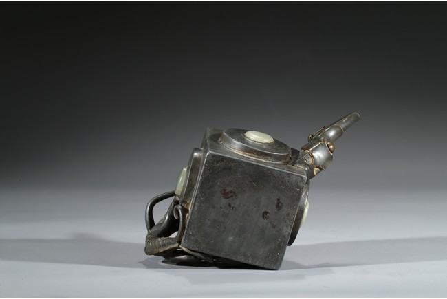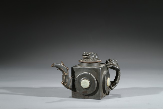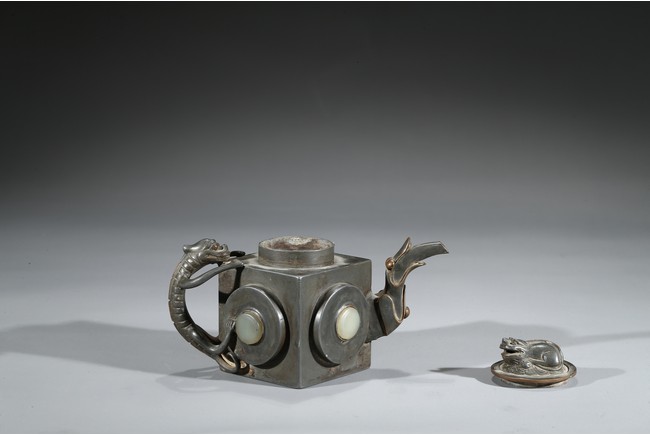 Of square section, each side inlaid with circular jade, flanked by chilling handle and tree branch spout, the cover topped with a recumbent animal. Qing Dynasty period.