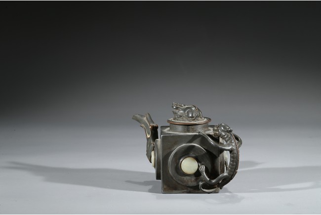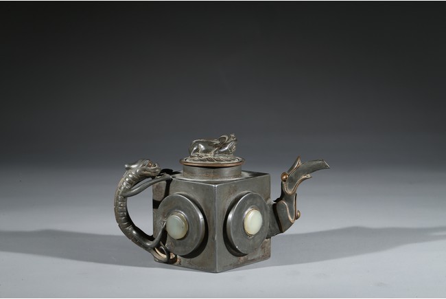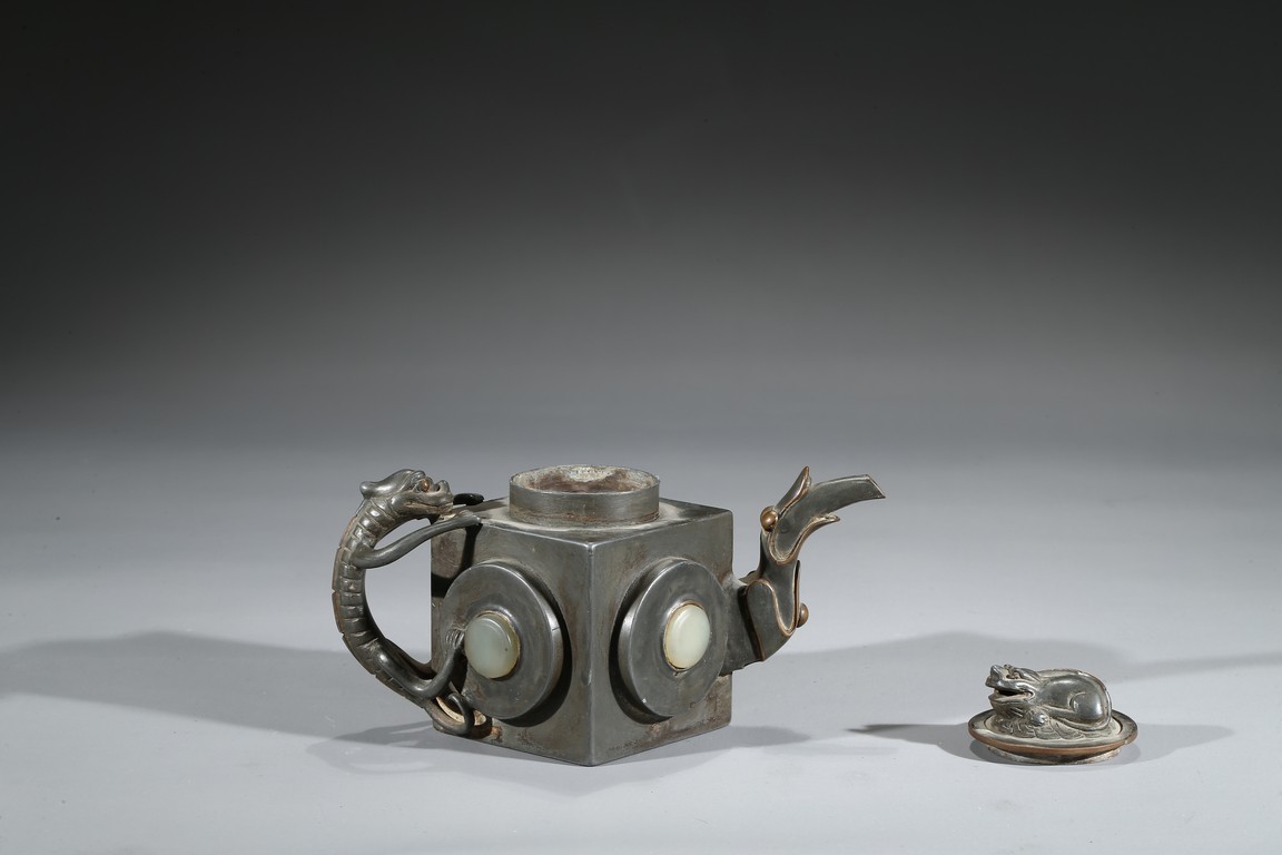 茶壺以錫為材,外方內圓,上部中心向內收縮並分兩層突起作壺蓋,蓋身下層略淺,略有彎折,上層略高,又向內收縮少許,使於壺蓋與壺身過渡和緩同時又富於造型變化,蓋呈圓形,中部略向下陷,提鈕以雄獅裝飾。流嘴彎曲如鳥首,螭龍提梁。壺身四面鑲嵌白玉。錫壺作為一個獨特的門類在茶道具中佔有一席之地,傳世錫壺數量相對較少。但錫壺又因其材質輕薄,適合鐫刻,一度成為文人創作的熱門素材。