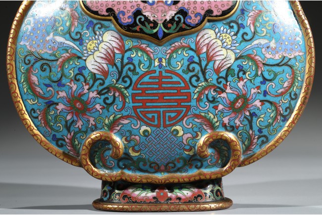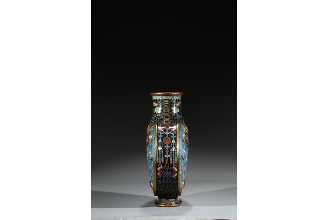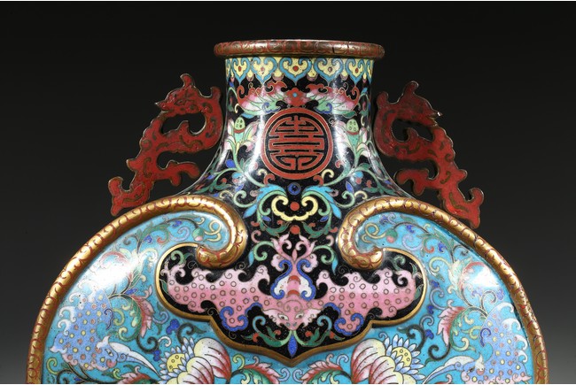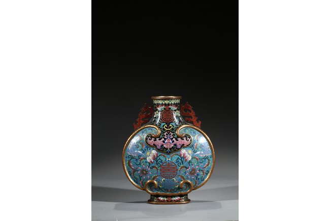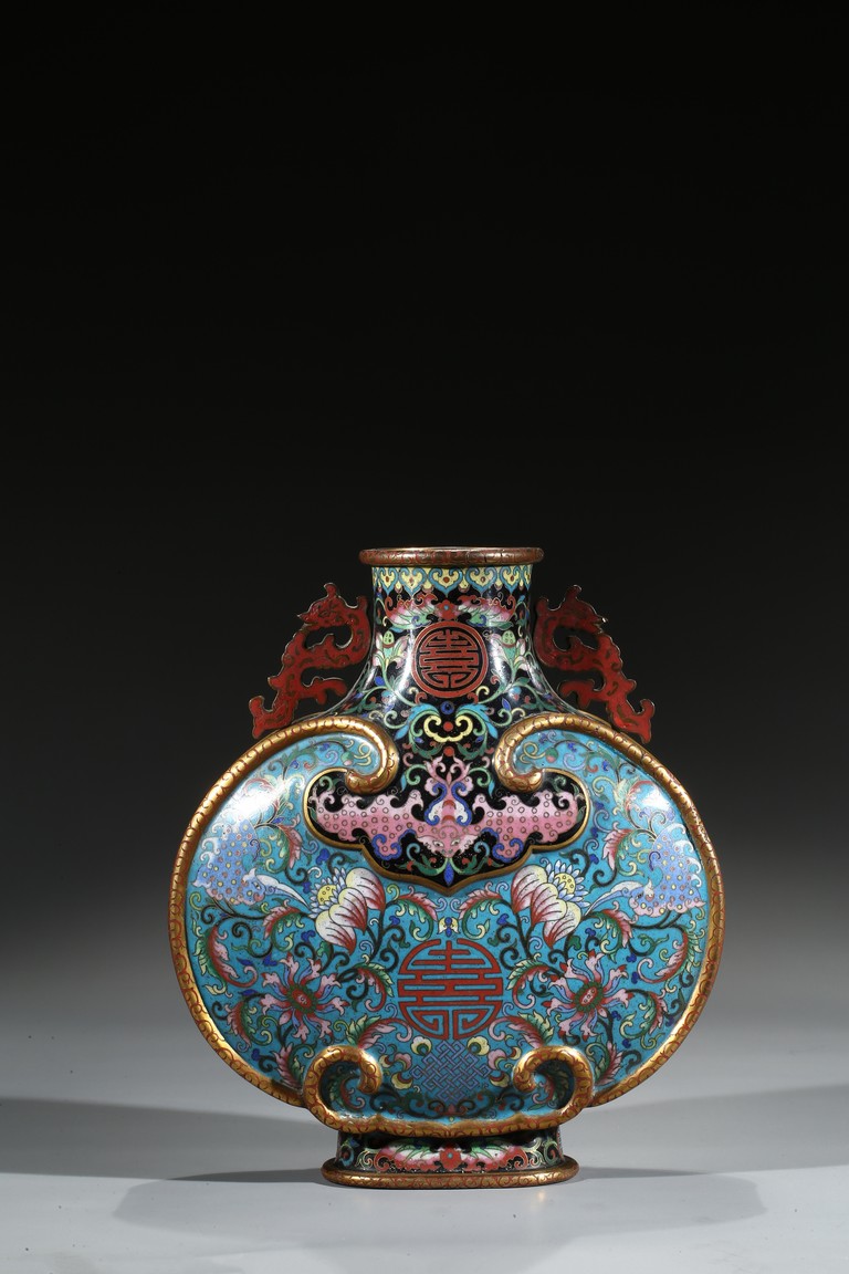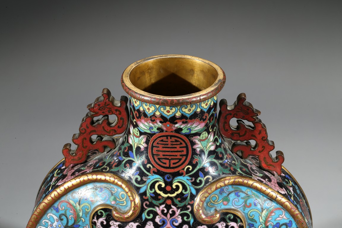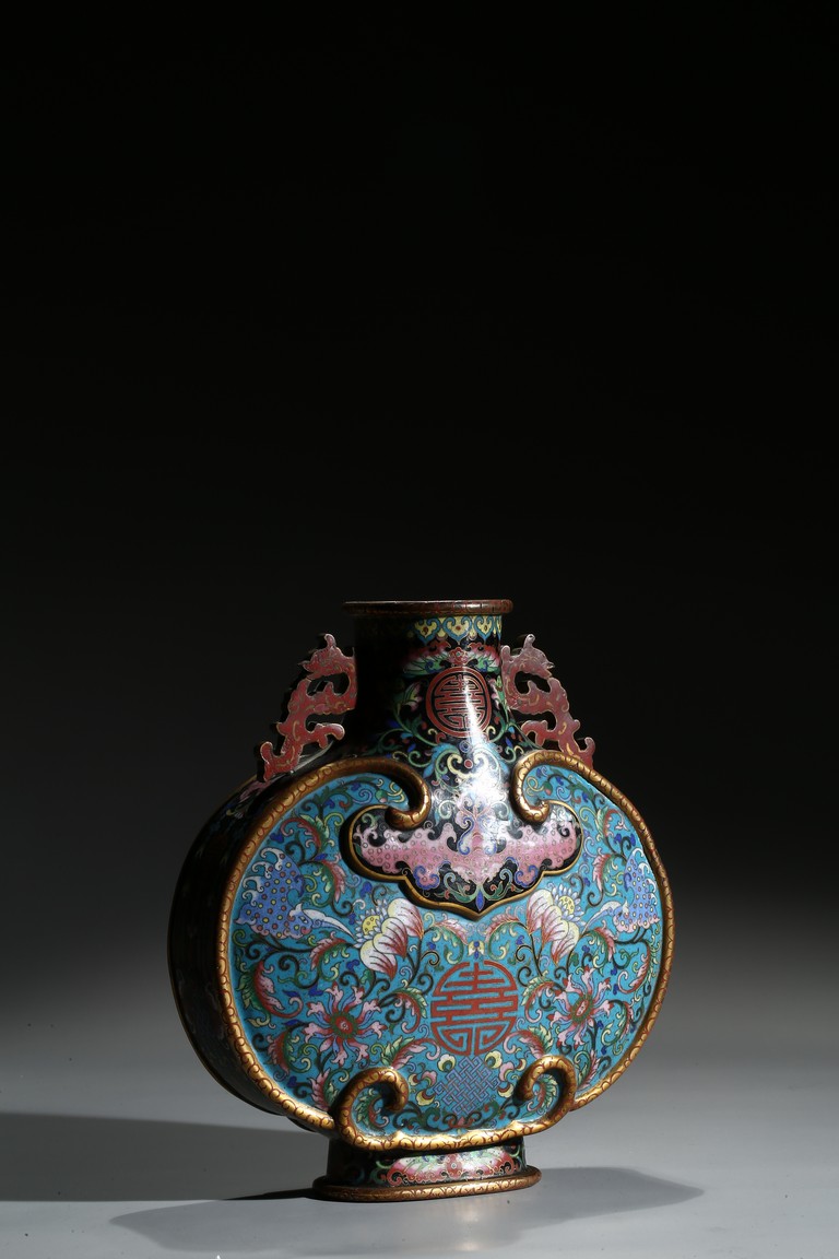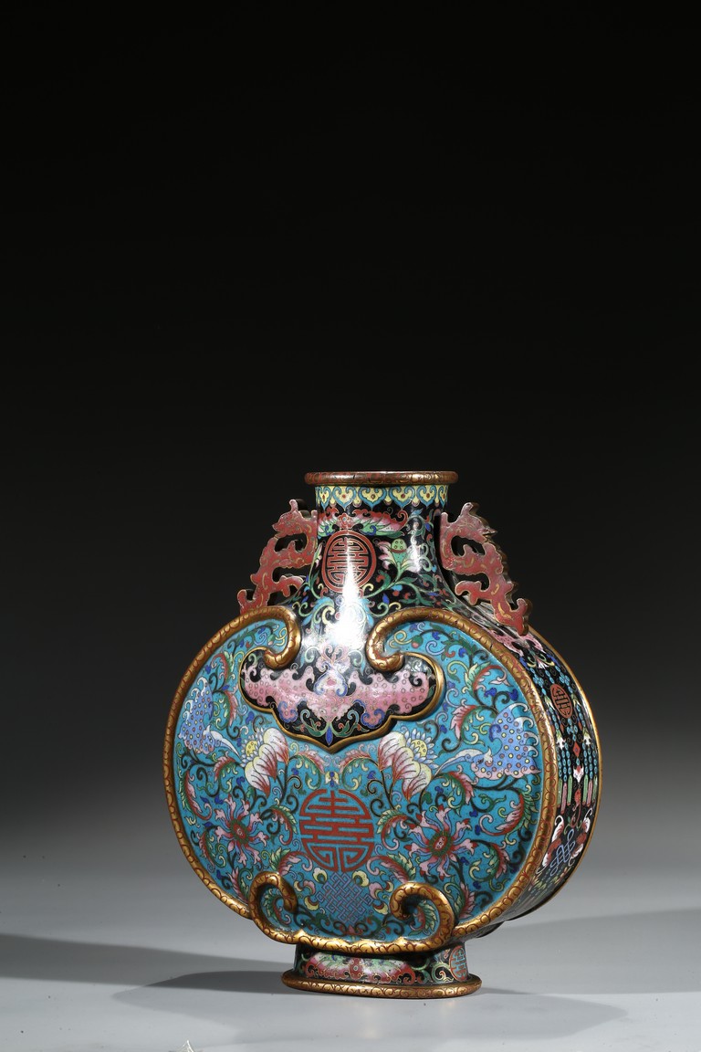 掐絲琺瑯俗稱“景泰藍”,是中國傳統手工藝之一,掐絲琺瑯一般以紅銅做胎(少數以金或銀為胎),胎子成型後,再用細而窄長的銅絲,根據裝飾圖案所需,銲接在胎體表面;然後將五顏六色的琺瑯釉填入凹陷的花紋之中,入窯焙燒;因其焙燒後凝結的琺瑯釉會收縮,所以填釉、焙燒的工序需要重複多次,才能使琺瑯釉完全充分的填充在盤絲的凹陷位置;燒好之後,還要進行打磨、鎏金等工序方可成器。正是由於掐絲琺瑯製作工藝複雜、技術要求嚴格、成本較高等原因,故其在中國誕生之日起,就被實力雄厚、人才濟濟的皇家所壟斷,秘藏深宮,非一般百姓所能享用。此件器物唇口,短頸,肩上飾對稱夔龍耳,扁圓腹。整器四周飾“壽字紋”、“纏枝花卉紋”、“雲蝠紋”。胎體厚重,釉色純正、艷麗,鎏金燦然,具有濃厚的宮廷氣息。