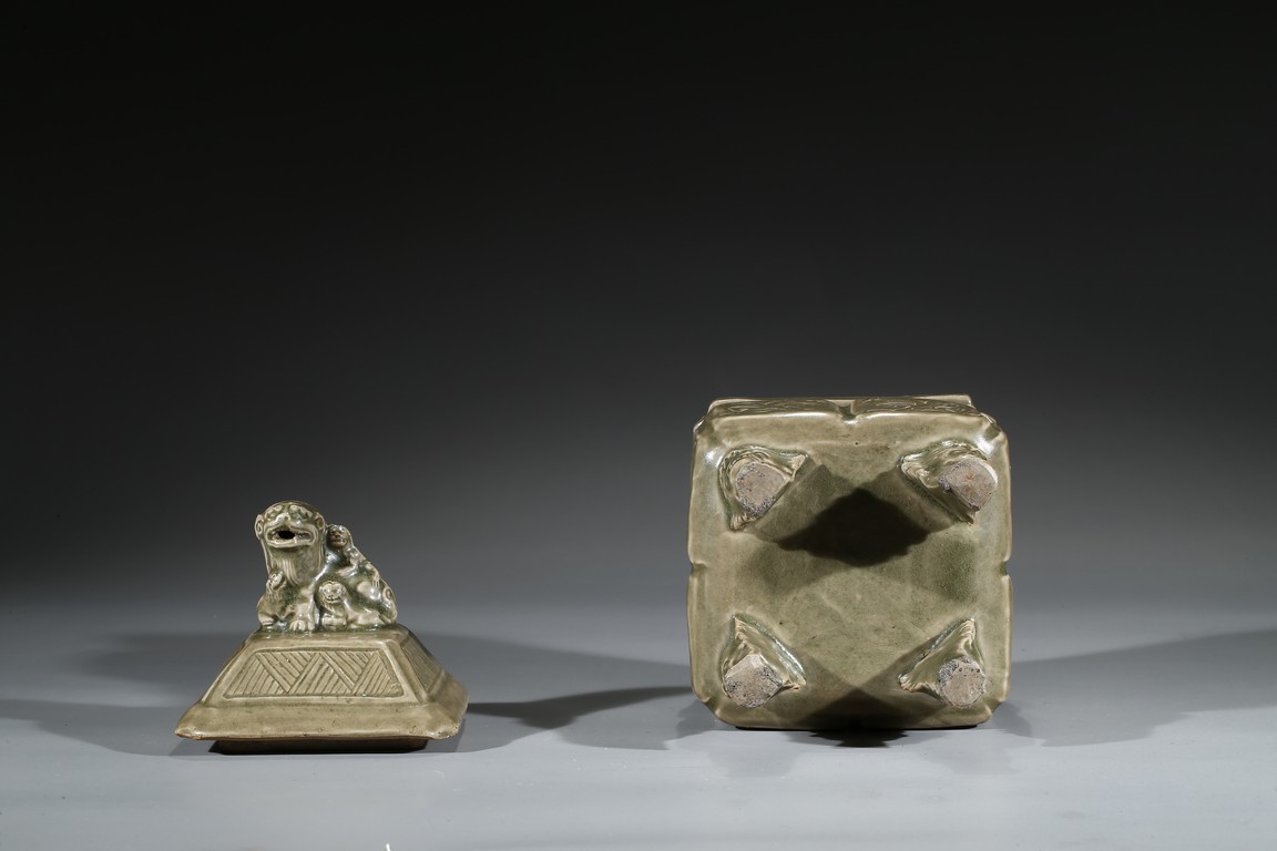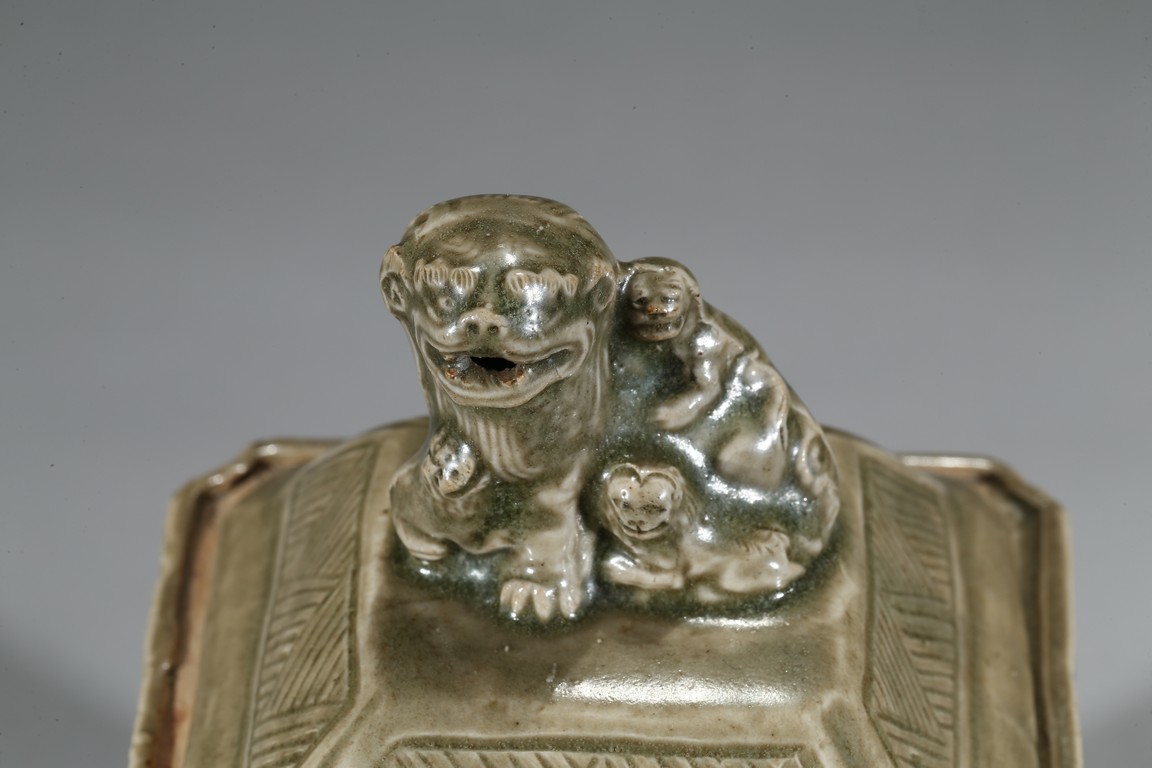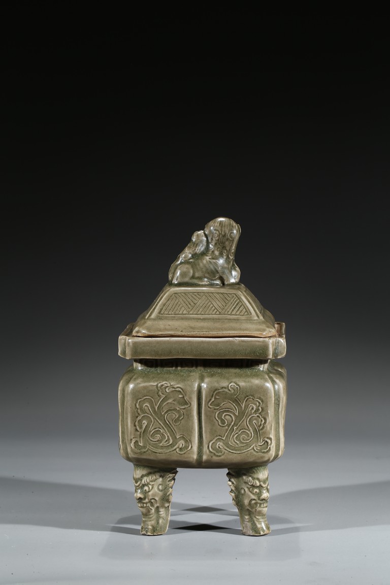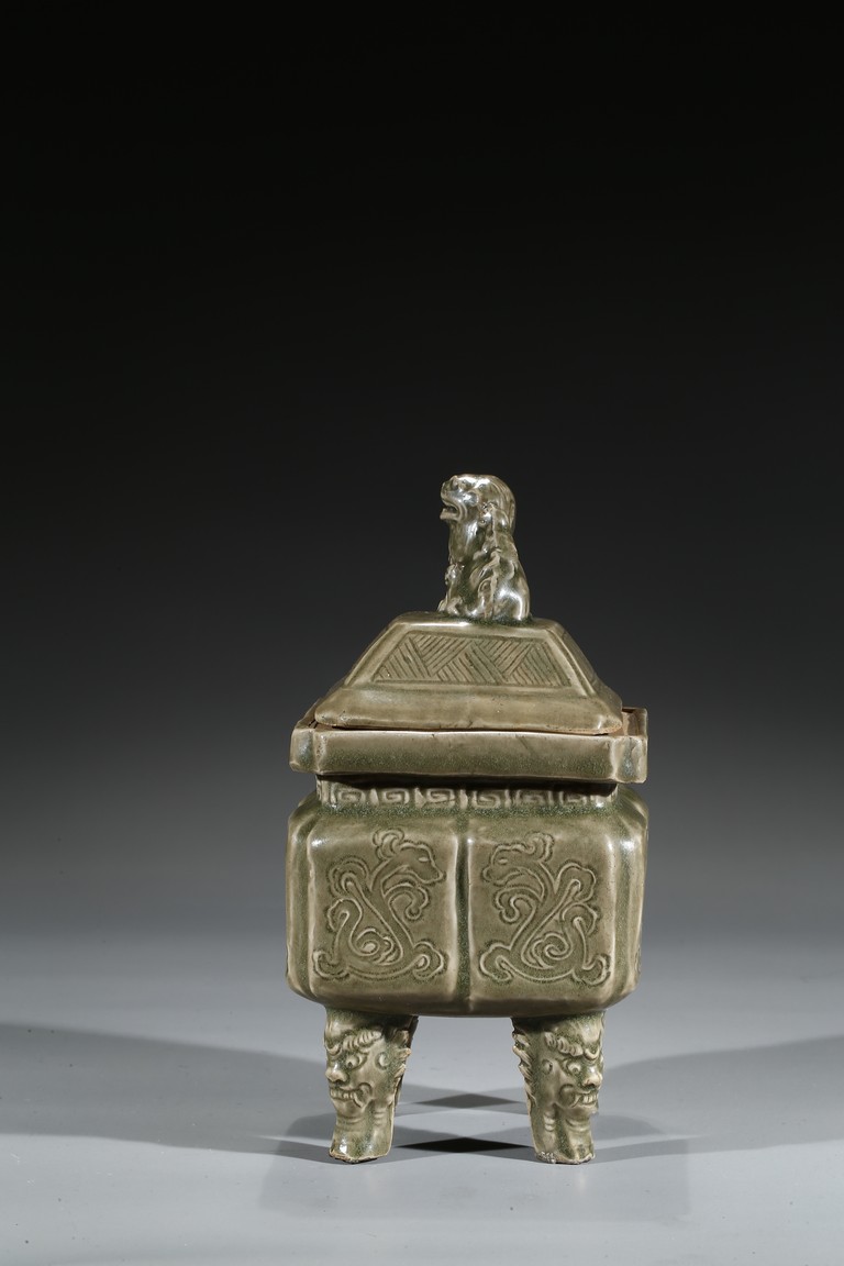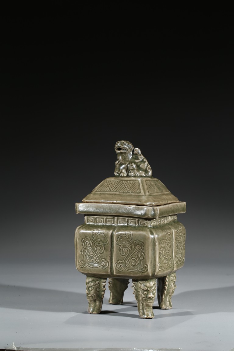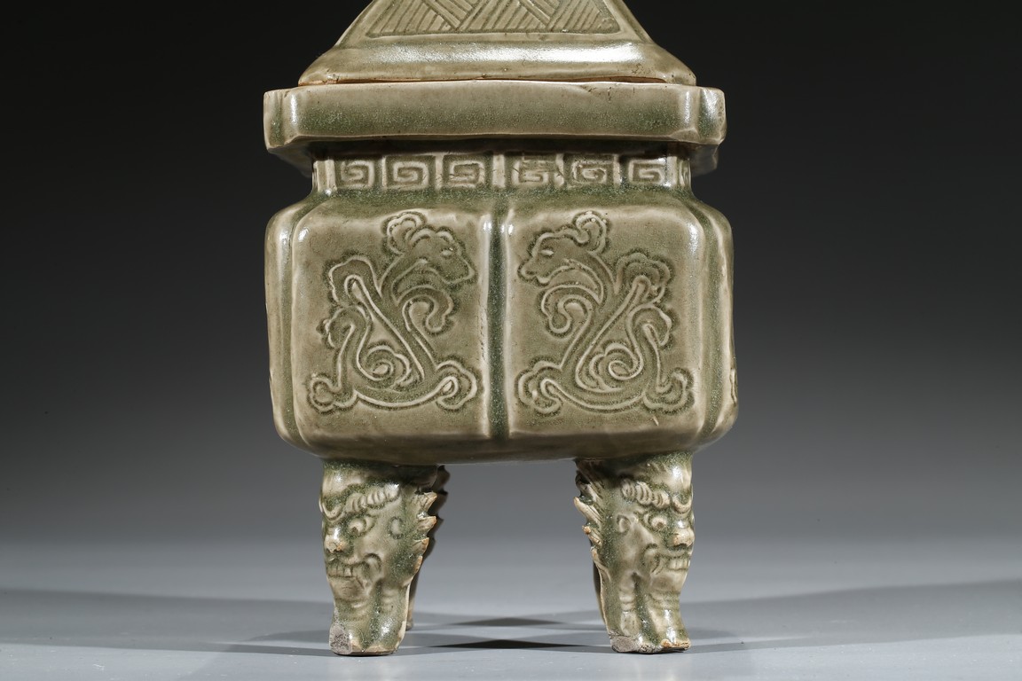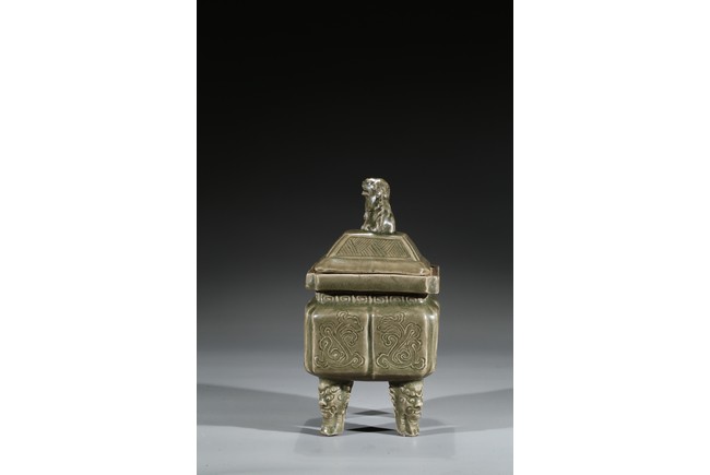 Modelled in the form of a square ding vessel, all raised in four mythical beast mask feet, the exterior carved with opposing pair of archaistic dragon on each side, fitted with a finial surmounted with a carved lion.