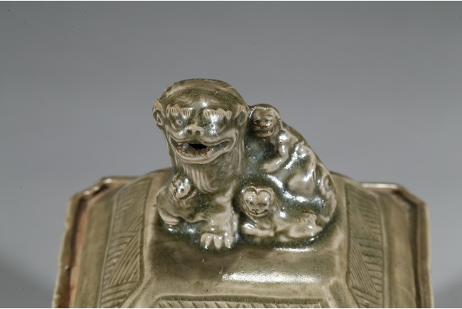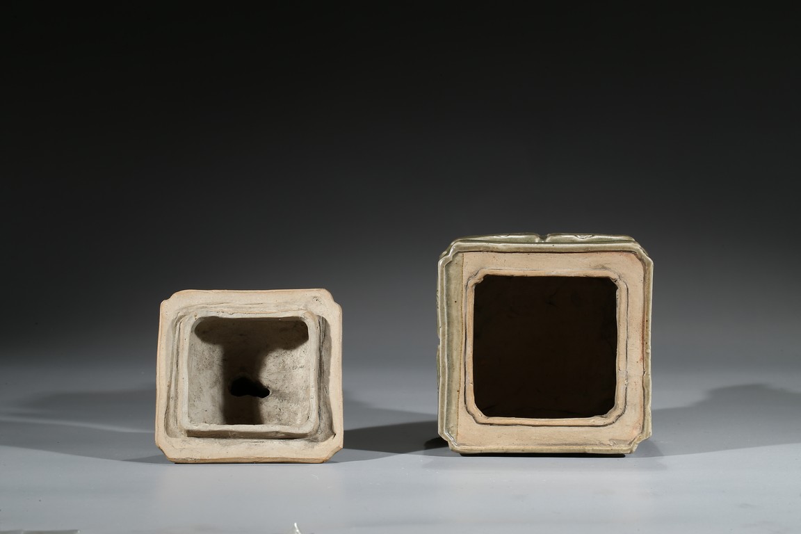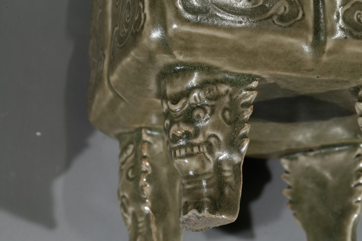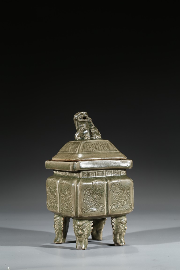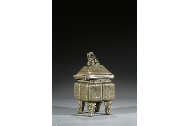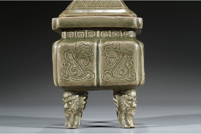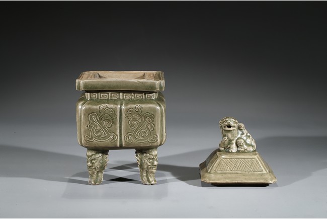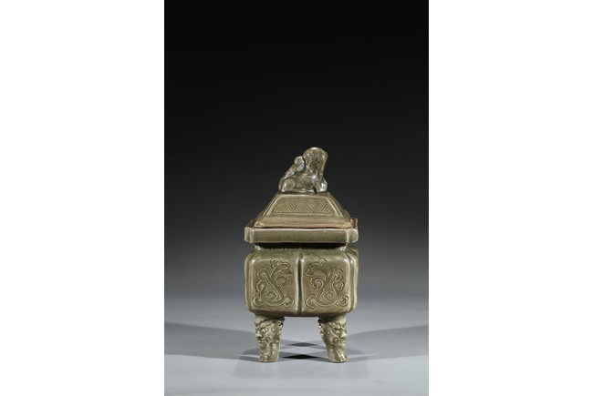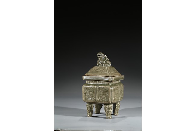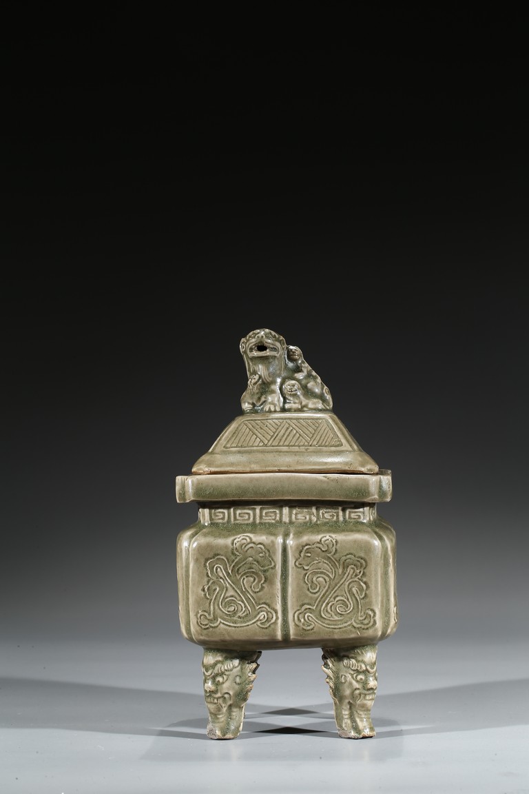 Modelled in the form of a square ding vessel, all raised in four mythical beast mask feet, the exterior carved with opposing pair of archaistic dragon on each side, fitted with a finial surmounted with a carved lion.