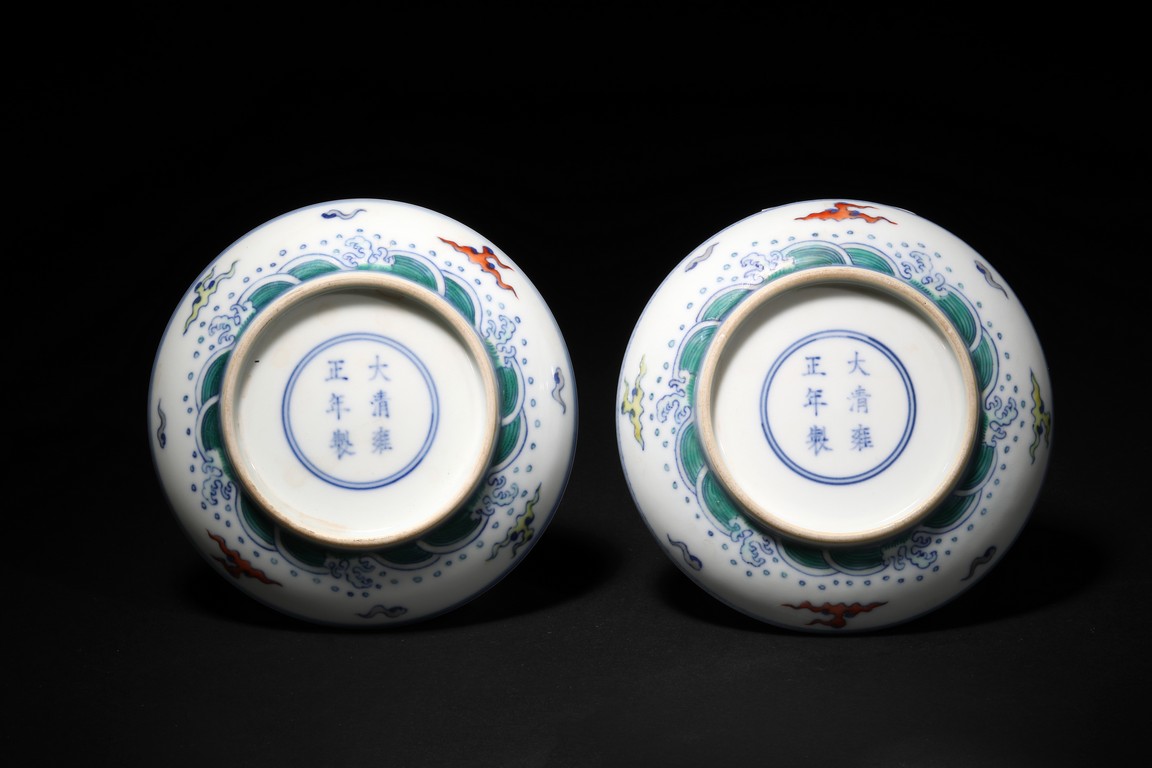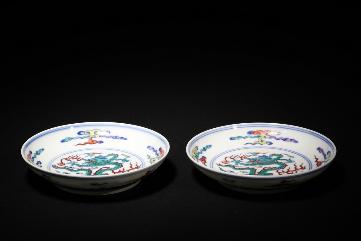 With shallow rounded sides rising from a tapered foot to a flared rim,the interior deftly painted in vivid tones of cobalt blue with a central medallion enclosing a green five-clawed dragon worthing amongst wucai scrolling clouds,the rim bordered by a colorful classic-scroll band,the base with a six-character reign mark within a double circle. Qing Dynasty period.