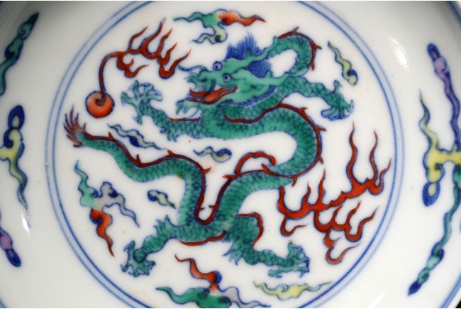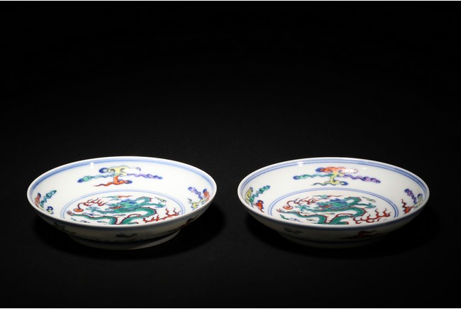 盤形周正規整,製作精美。敞口,弧壁,圈足。內外均施白釉,釉質細膩溫潤。盤心繪雲龍紋,以褐彩勾勒龍紋輪廓,綠彩填涂龍身,龍身周圍以紅彩繪祥雲紋。龍身矯健,蒼穹有力,張牙舞爪,氣勢雄渾。“大清雍正年制”款識。整器工藝複雜,製作精細,令人歎為觀止。