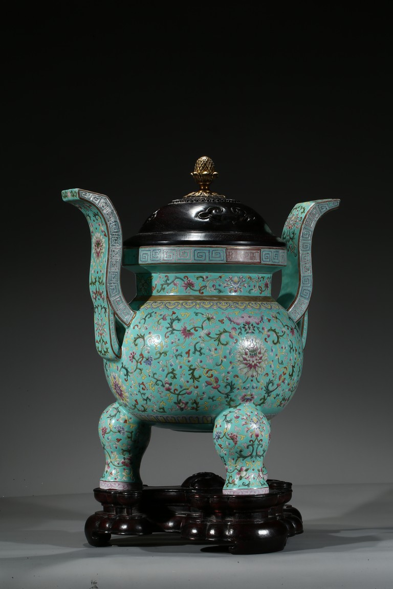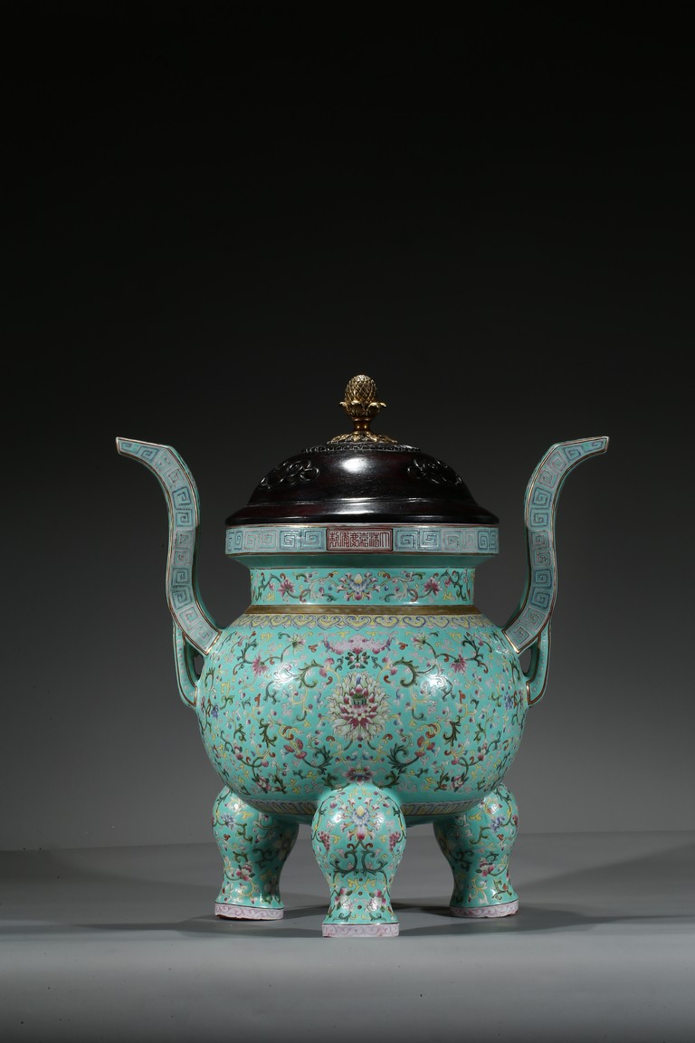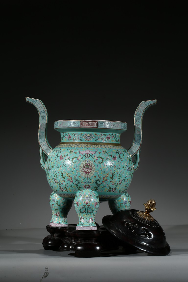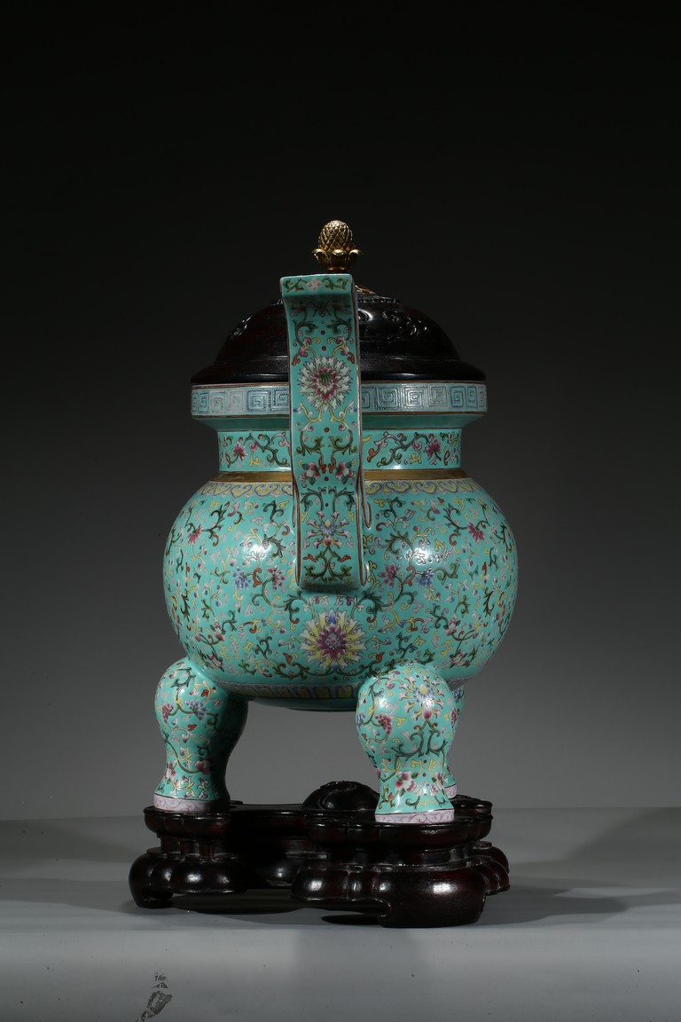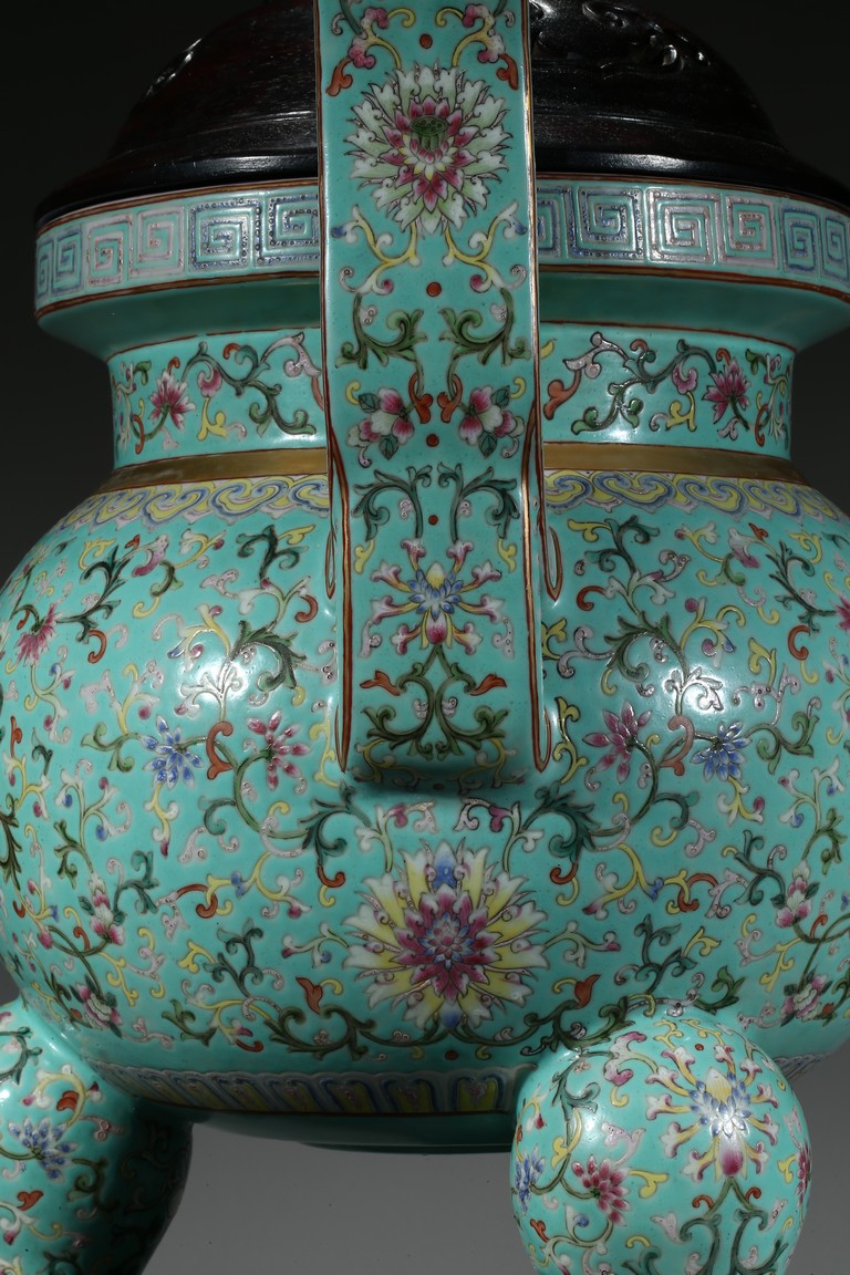 Provenance: Private San Diego collection, California 此爐取商周青銅器鼎之樣式,盤口束頸,鼓腹圜底,下承三蹄足,兩側飾衝天朝冠耳。胎質堅實,周身以鬆石綠地粉彩裝飾。口沿外繪迴紋,頸部繪纏枝花卉紋一週,外壁繪纏枝蓮紋及八寶紋,兩耳及三足繪纏枝花卉紋。佛教八寶為法螺、法輪、寶傘、白蓋、蓮花、寶瓶、金魚、盤腸八種吉祥物,常與蓮花合用於瓷器裝飾上,象徵吉祥如意。此類爐常作佛前五供,置於最中間,體量巨大,端莊雄壯,製作考究,且配木雕爐蓋及底座,十分難得。可參考一類似器型,售於倫敦佳士得,2011年11月,拍品號412。