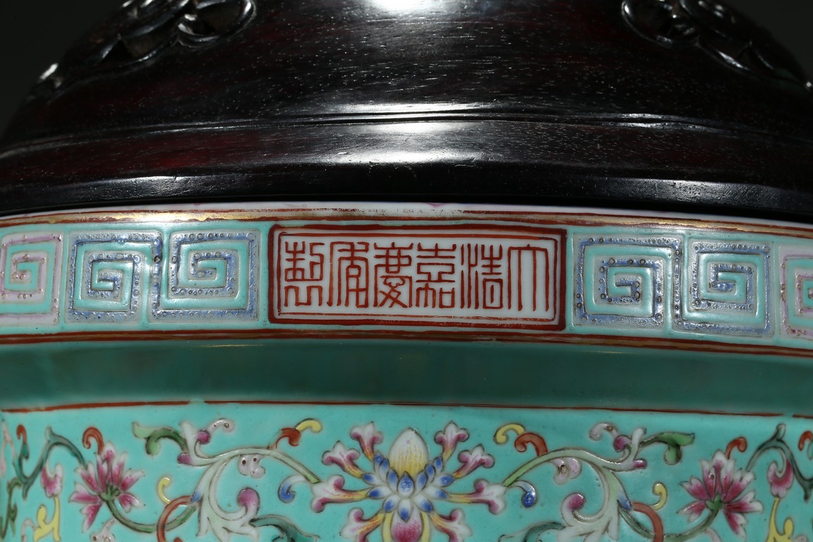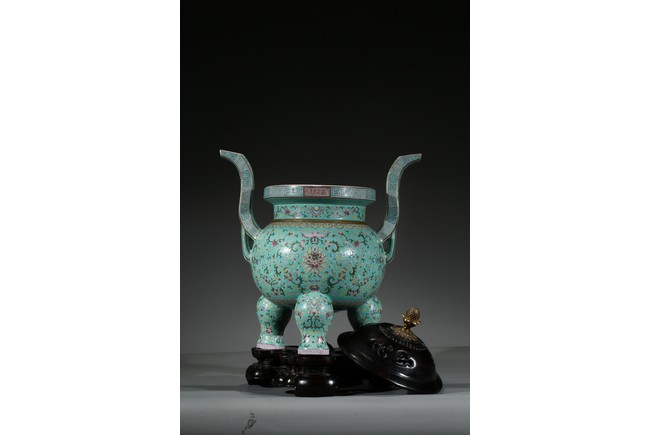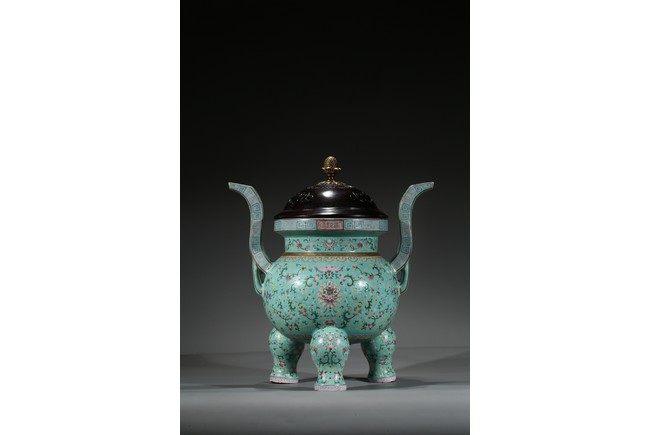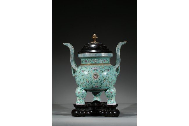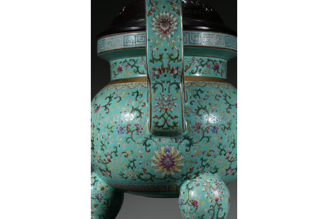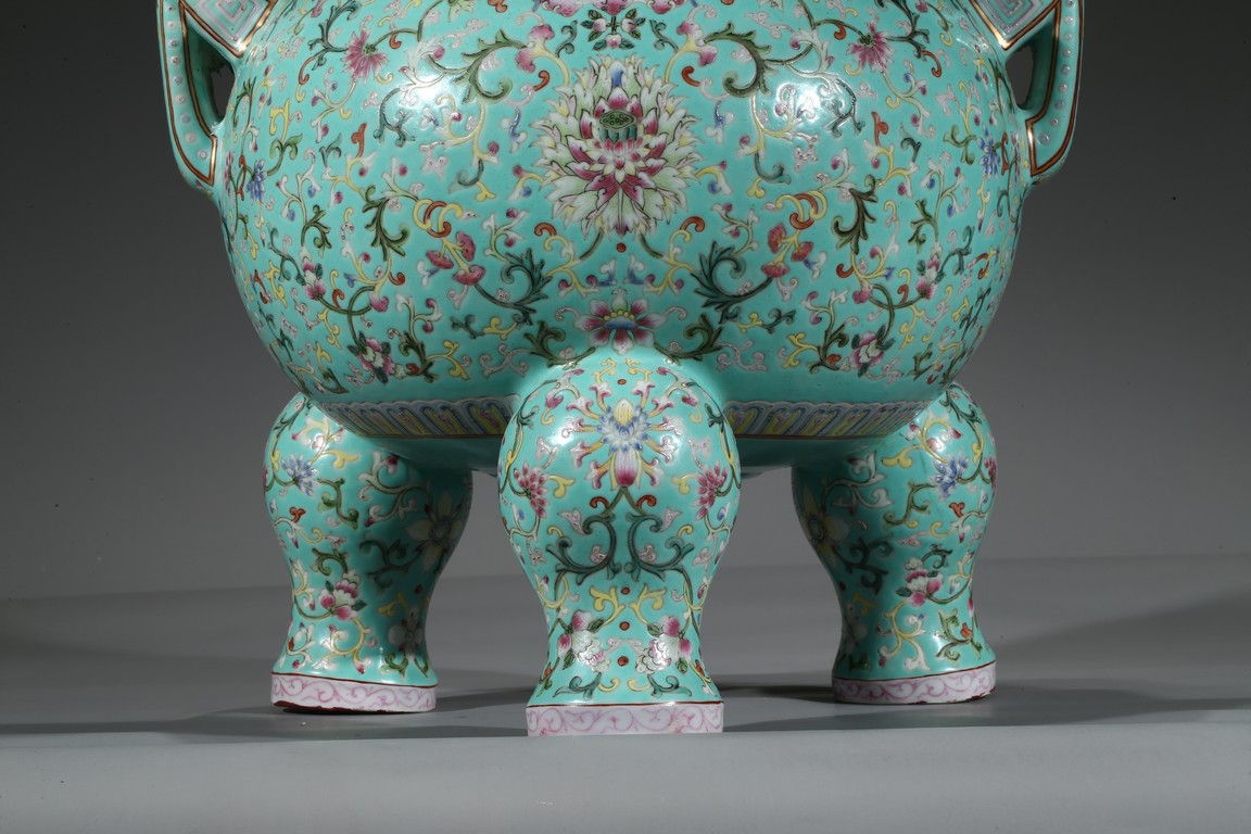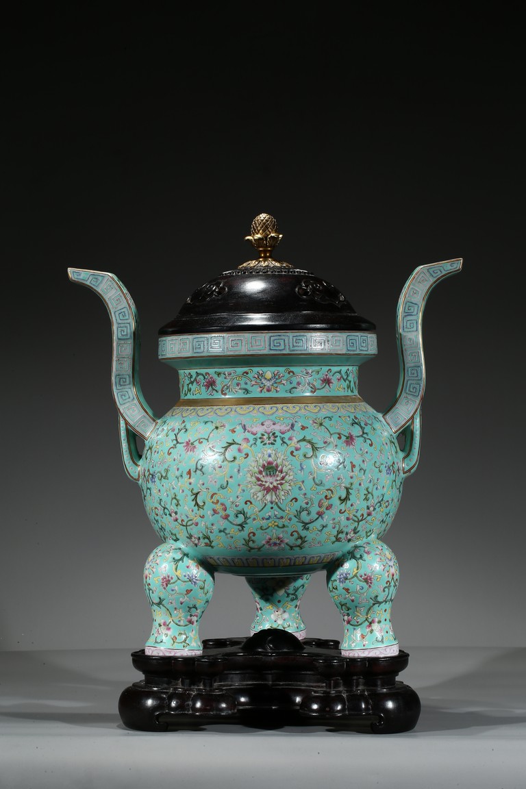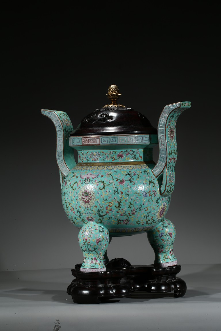 Provenance: Private San Diego collection, California 此爐取商周青銅器鼎之樣式,盤口束頸,鼓腹圜底,下承三蹄足,兩側飾衝天朝冠耳。胎質堅實,周身以鬆石綠地粉彩裝飾。口沿外繪迴紋,頸部繪纏枝花卉紋一週,外壁繪纏枝蓮紋及八寶紋,兩耳及三足繪纏枝花卉紋。佛教八寶為法螺、法輪、寶傘、白蓋、蓮花、寶瓶、金魚、盤腸八種吉祥物,常與蓮花合用於瓷器裝飾上,象徵吉祥如意。此類爐常作佛前五供,置於最中間,體量巨大,端莊雄壯,製作考究,且配木雕爐蓋及底座,十分難得。可參考一類似器型,售於倫敦佳士得,2011年11月,拍品號412。