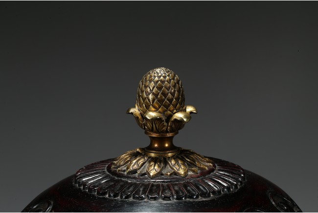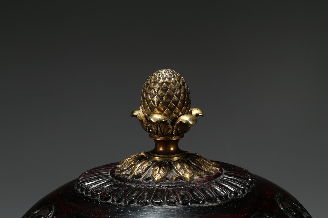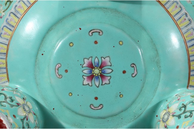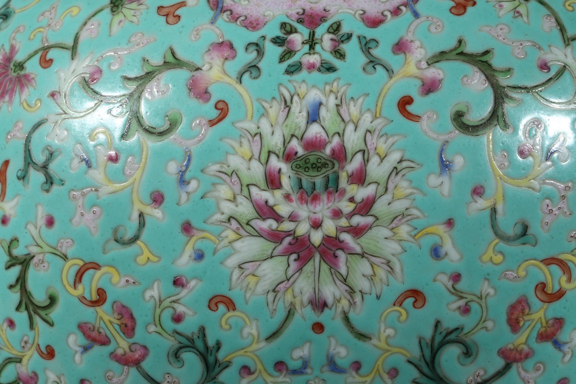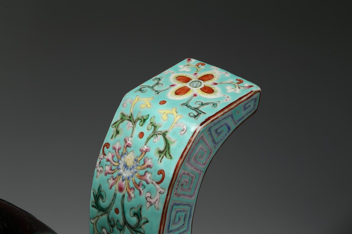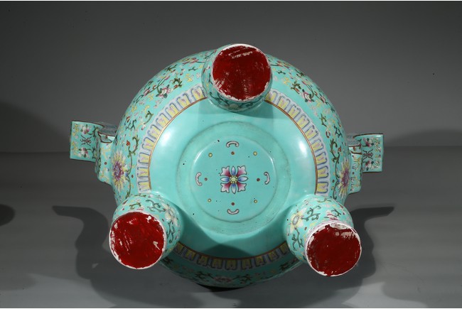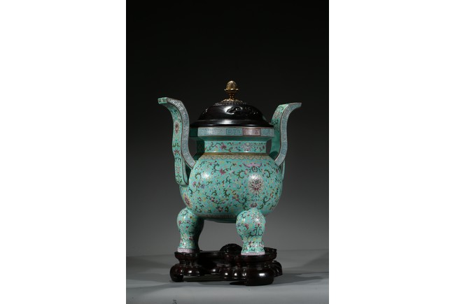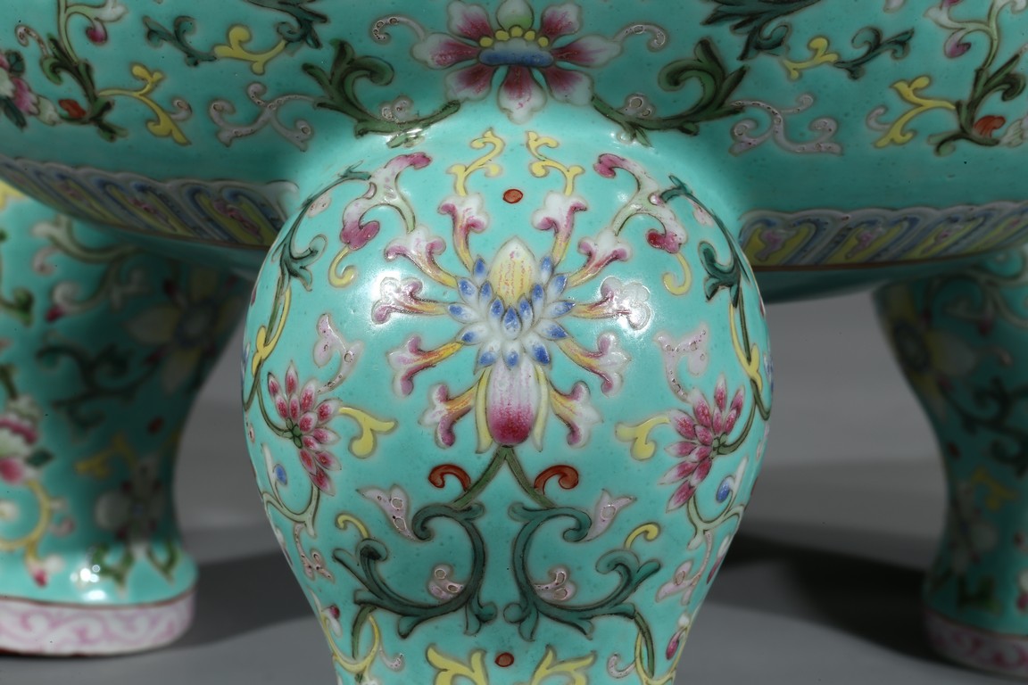 Provenance: Private San Diego collection, California 此爐取商周青銅器鼎之樣式,盤口束頸,鼓腹圜底,下承三蹄足,兩側飾衝天朝冠耳。胎質堅實,周身以鬆石綠地粉彩裝飾。口沿外繪迴紋,頸部繪纏枝花卉紋一週,外壁繪纏枝蓮紋及八寶紋,兩耳及三足繪纏枝花卉紋。佛教八寶為法螺、法輪、寶傘、白蓋、蓮花、寶瓶、金魚、盤腸八種吉祥物,常與蓮花合用於瓷器裝飾上,象徵吉祥如意。此類爐常作佛前五供,置於最中間,體量巨大,端莊雄壯,製作考究,且配木雕爐蓋及底座,十分難得。可參考一類似器型,售於倫敦佳士得,2011年11月,拍品號412。
