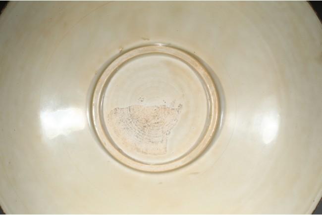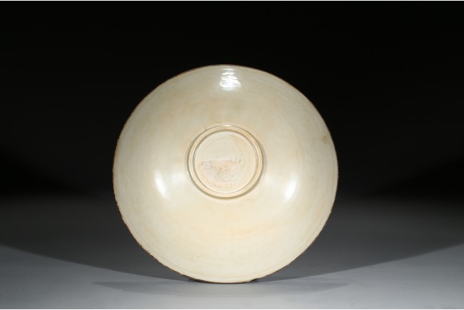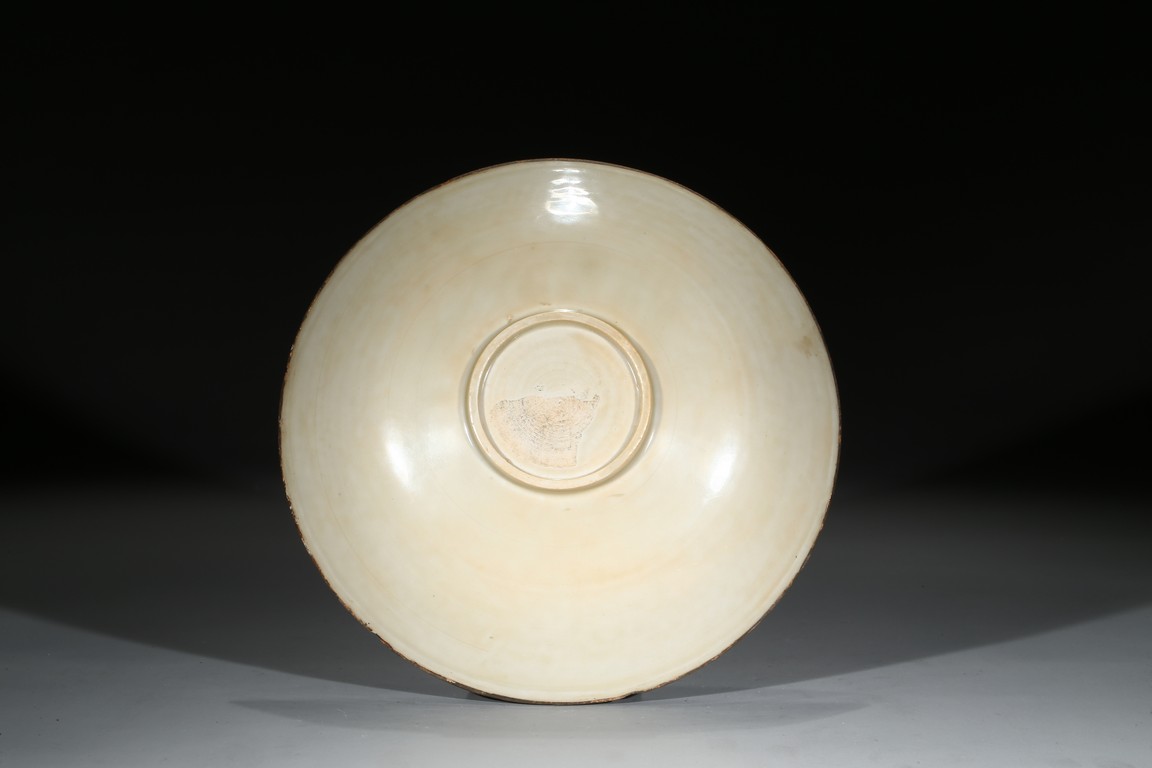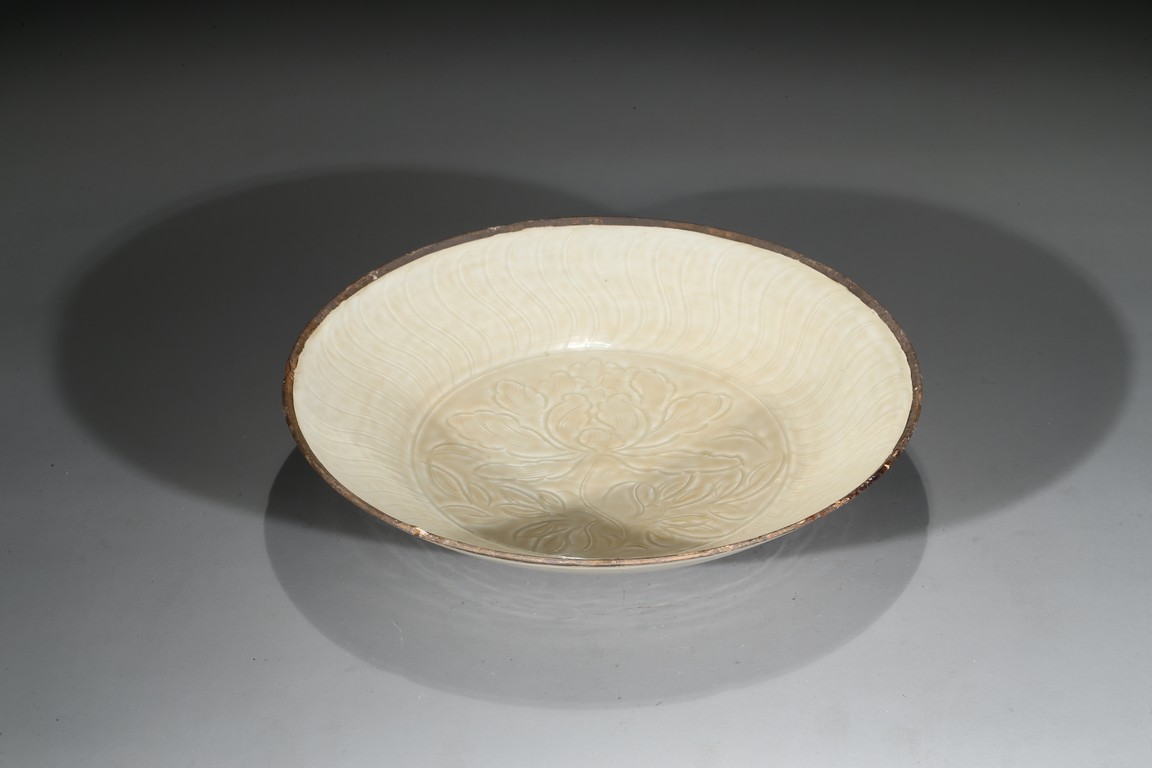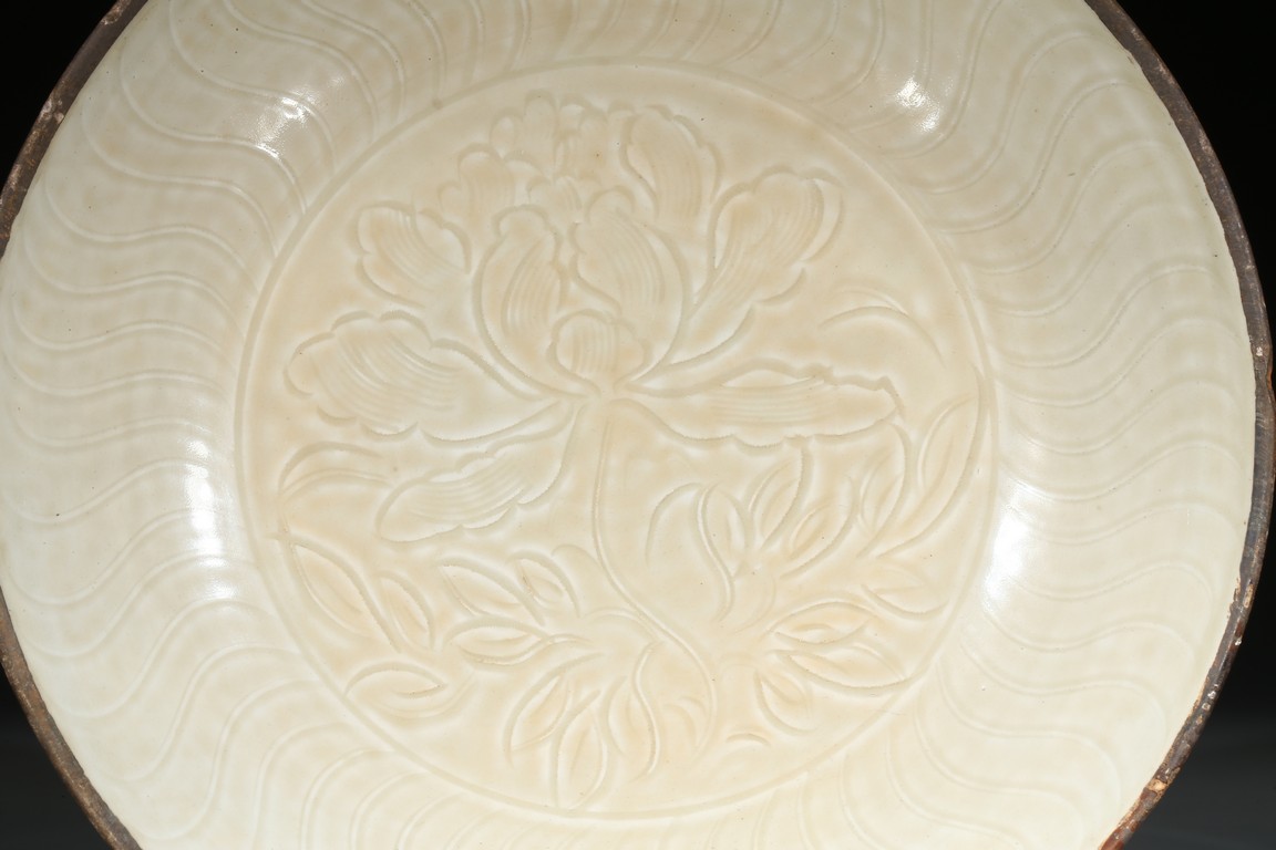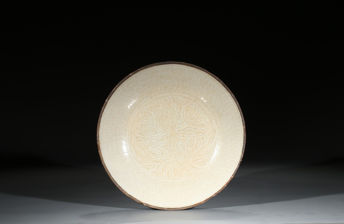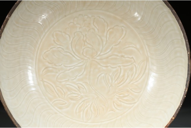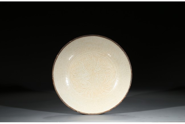 定窯為宋代五大名窯之一,以出產白瓷著稱,是五大名窯之中燒造時間最早、歷時最悠久的窯口,亦是唯一以紋飾見長者,所出精於刻劃,善長模印,素有定州花瓷的美稱,產品曾入貢內廷,為後世所重。此件器物口沿鑲金,盤壁微呈弧形,端莊大氣,通體施象牙白釉,清新雅緻。盤心刻肆意盛放的菊瓣,葉片舒展,表現出旺盛的生命力,刻劃線條俐落,流暢如畫,為定窯劃花工藝的傑出代表。