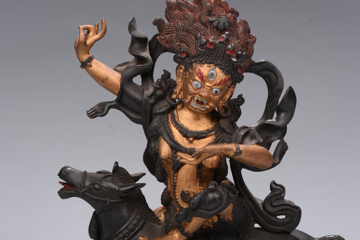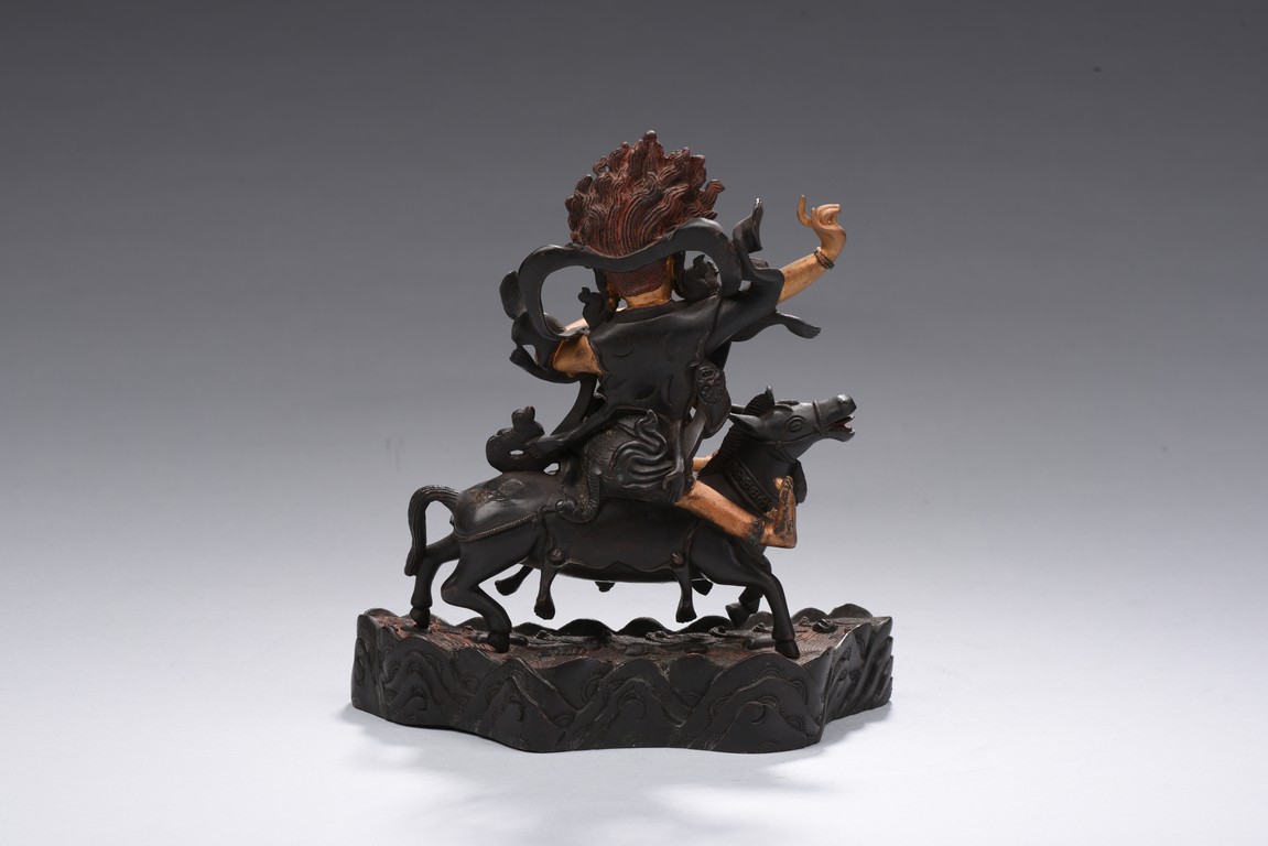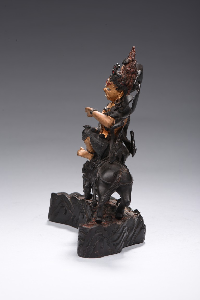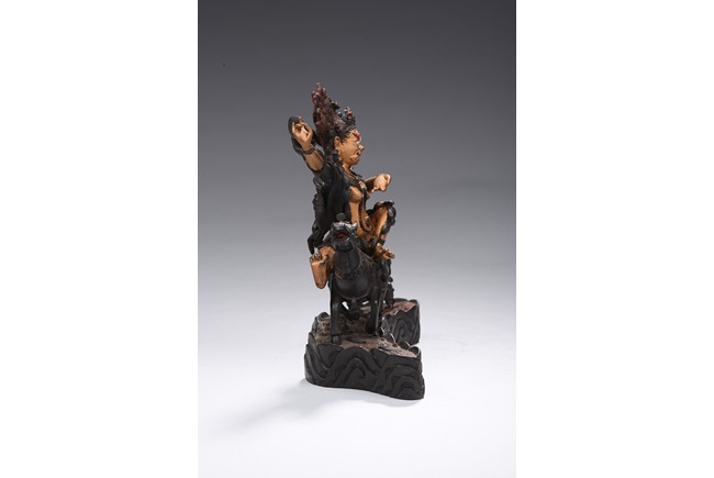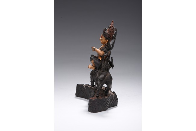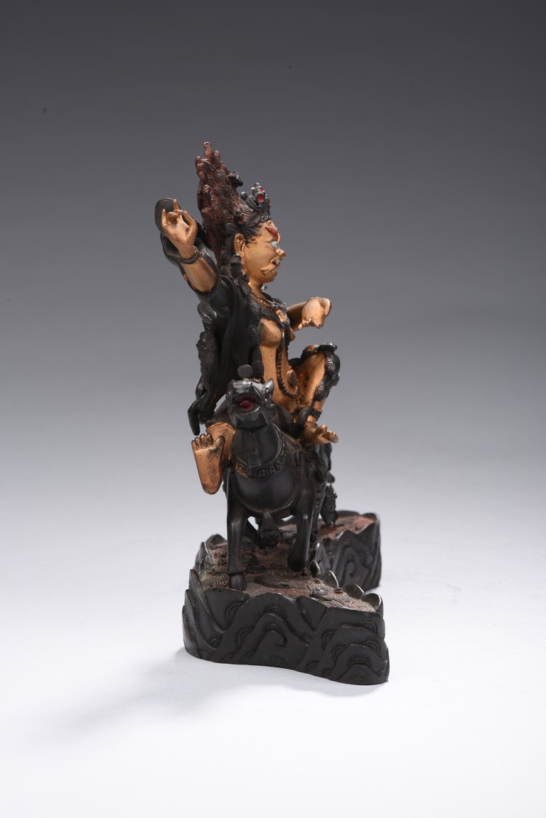 The fierce-looking deity is modelled with fanged teeth and bulging eyes. She is seated on a harnessed donkey,with one hand raised. The base is modelled in the form of crashing waves within rockwork. Qing Dynasty period.