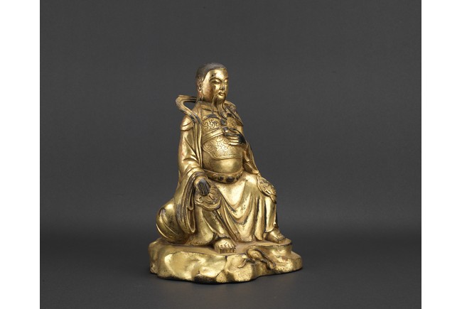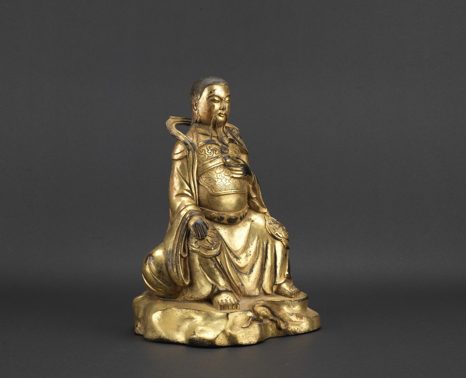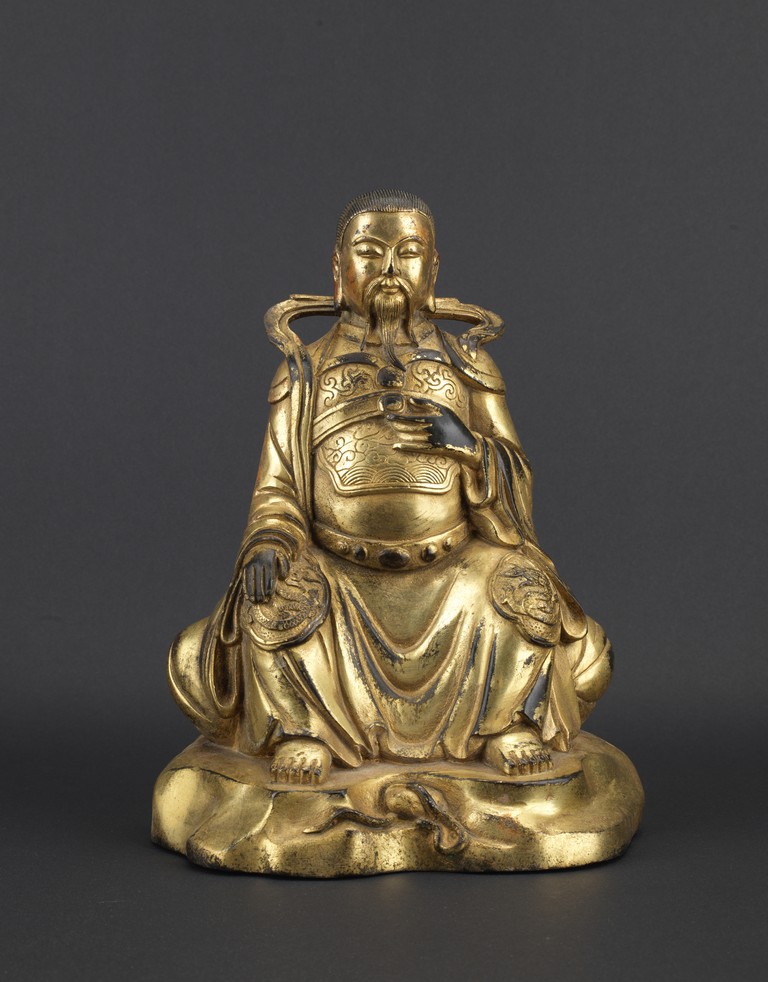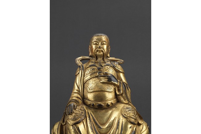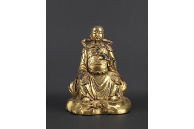 真武大帝,又稱玄武神、玄天上帝,為太上老君第八十二次變化之身,鎮於北方,故稱玄武神,常伴以龜蛇形象出現。道經中稱他為“鎮天真武靈應佑聖帝君”。人祈求延生長壽,都要奉祀真武大帝。同時,真武大帝主水,能治水降水,故奉祀真武以祈免水火之災。此尊真武大帝像容貌壯偉,面形方正,雙目炯炯,彎眉與鼻脛相連,神態溫良和藹,長髮披於腦後,下頷垂下一縷長鬚,為此尊形象的重要標誌。身穿鎧甲,表示主掌兵戈之事,司權收服邪魔;外罩龍袍,圍玉帶。衣紋以高超的寫實工藝表現,左手撫膝,右手撫鬚,,垂足正襟危坐。整像造型端莊,鑄造工藝精良,黃銅質地細膩潤澤,鎏金厚重,熠熠生輝,使真武大帝飽含英武之氣。