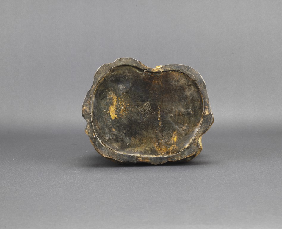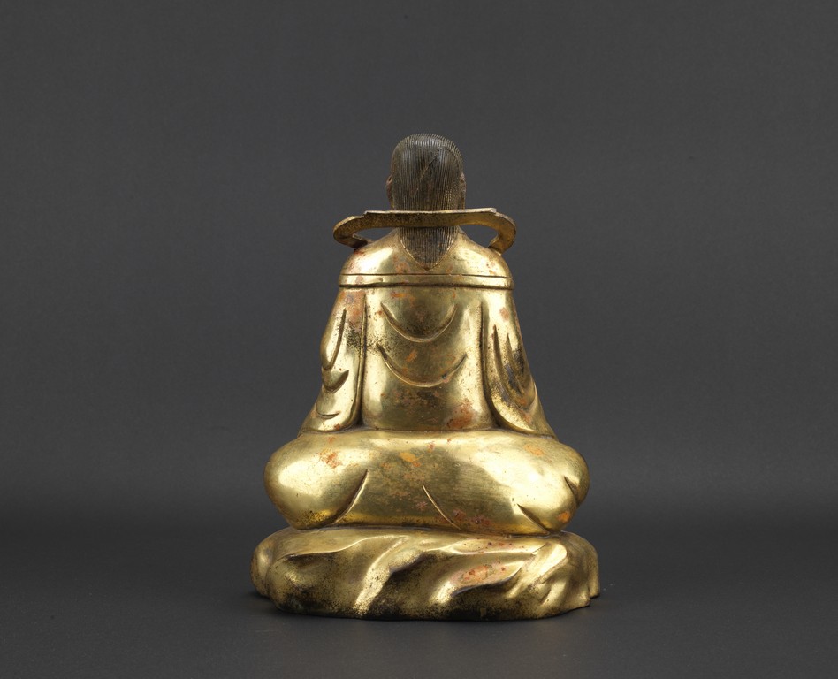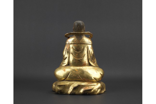 Cast seated with his right hand resting on his knees and his left hand in front of chest, his long robes adorned with clouds and ocean at his abdomen falling to voluminous folds around his arms and to his bare feet, his long neatly combed hair swept back behind his shoulders and falling towards his waist, revealing his serene face. Early Qing Dynasty period.