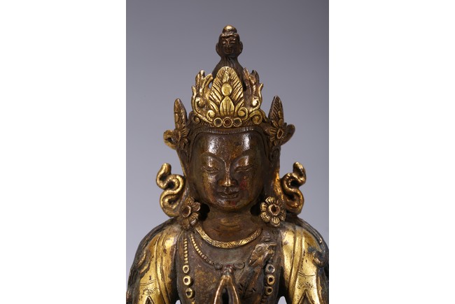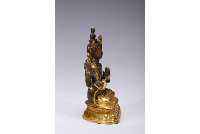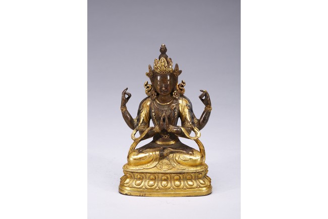 The bodhisattva is shown seated in dhayanasa upon double lotus throne, with primary hands clasped together in front of chest and two arms raised in mudra, wearing beaded jewelry and scarves around arms, face with meditative expression and with hair pulled into a chignon framed with pointed crown. Qing Dynasty period.