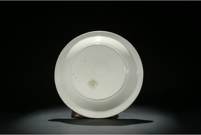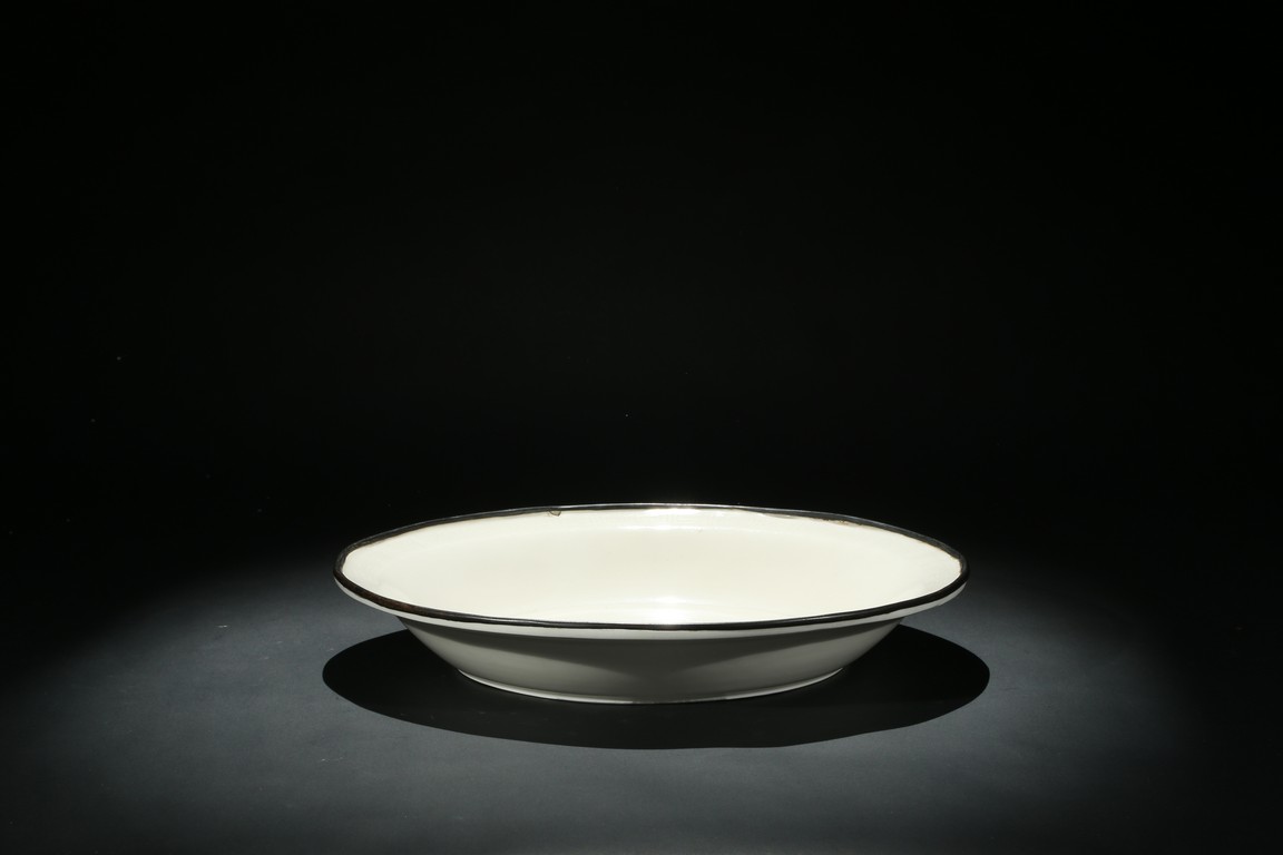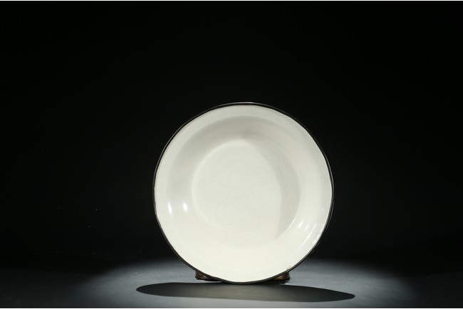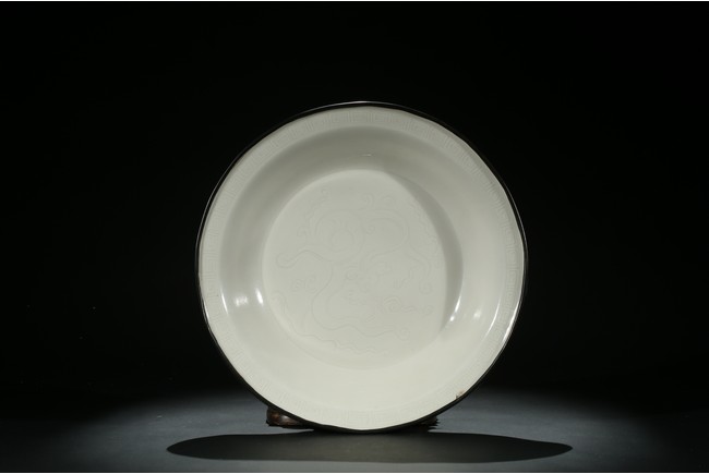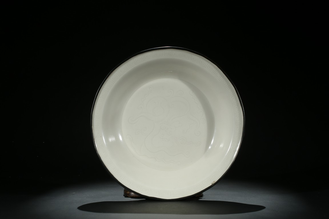 The gently curved sides rising from circular base and short straight foot to a broad everted lipped rim bounded with metal with key-fret pattern, the center decorated with a writhing chilong within auspicious clouds. Song Dynasty