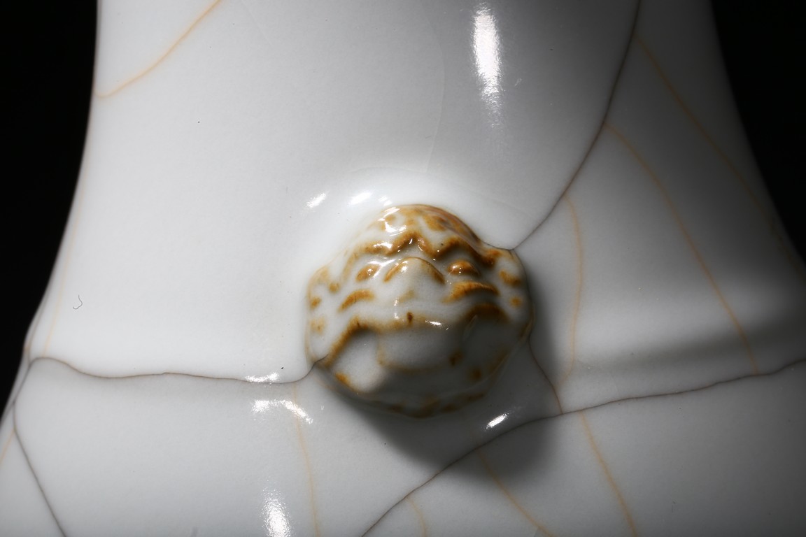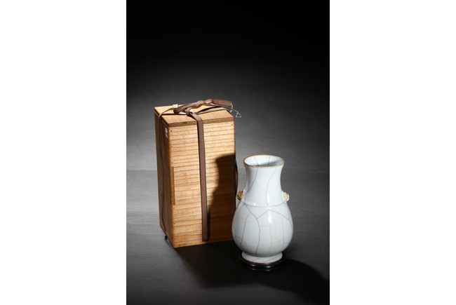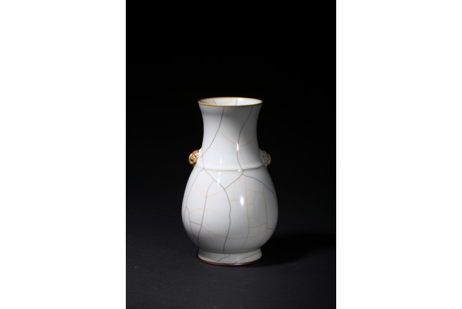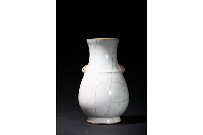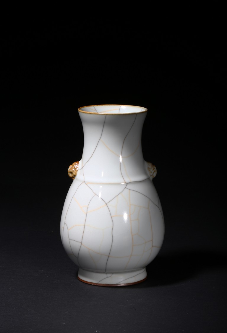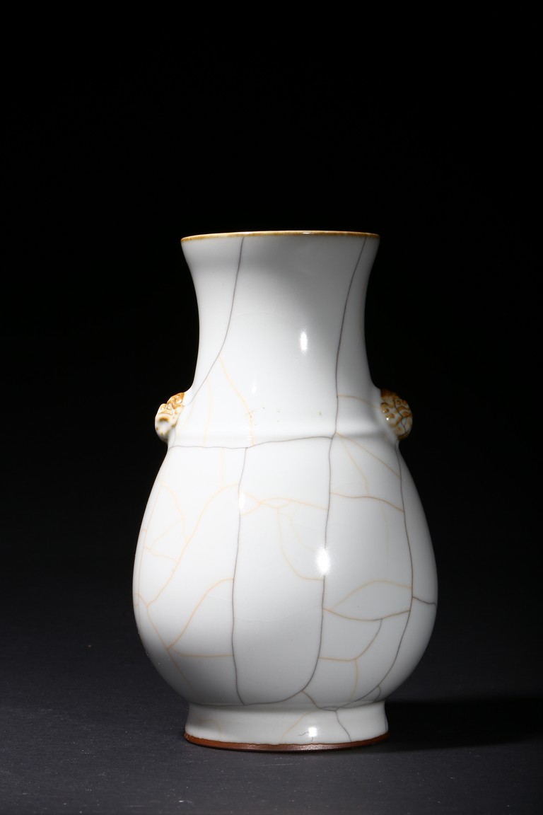 Provenance: Private Hawaii collection, California 哥窯為五大名窯之一,後世多有仿製,此件器物為清代仿哥窯作品,侈口,垂肩,鼓腹,高圈足,飾雙獅耳。釉色灰白,施釉色厚潤猶如凝脂,寶光內藴,周身紋片緻密,饒有韻致。夏威夷日本著名藏家前田家族收藏