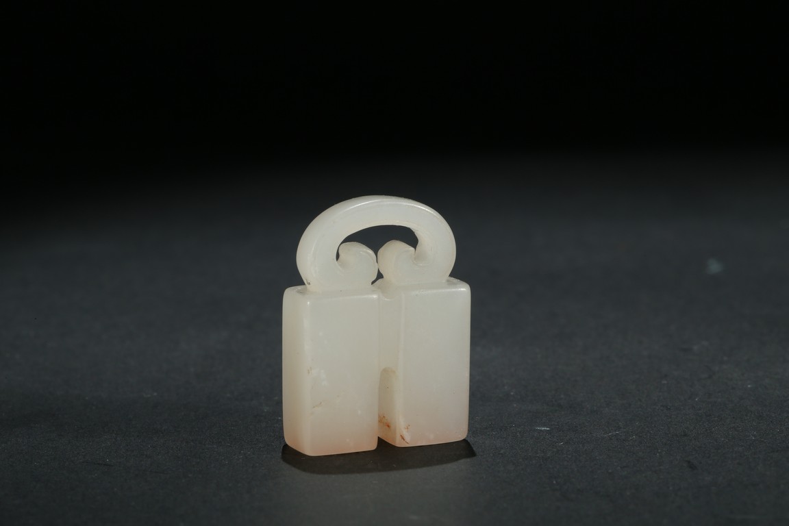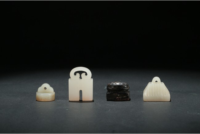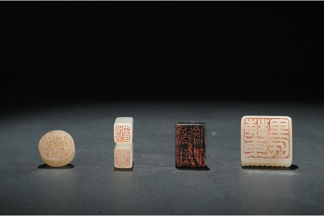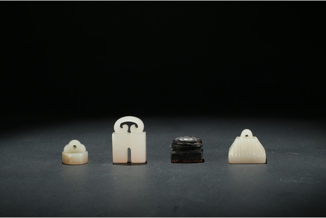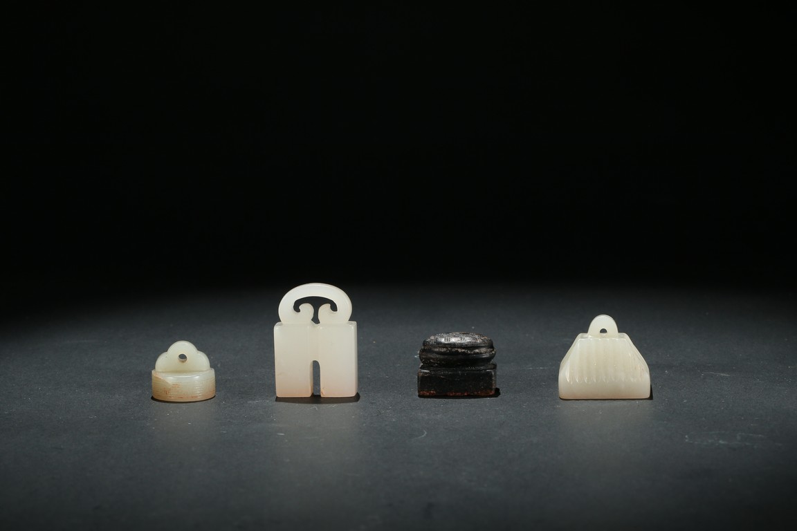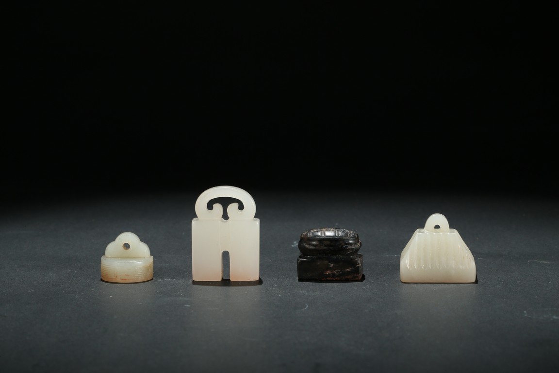 Comprising of four various seals, including a black jade square seal topped with turtle shell finial; a white jade square seal topped with arched finial; a white jade circular seal; and a joined rectangular seal. Ming/Qing Dynasty period.