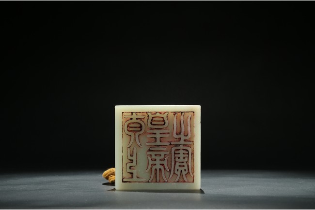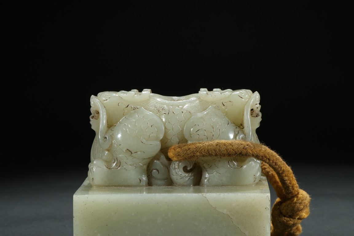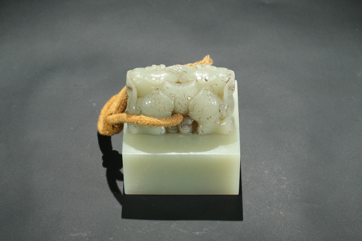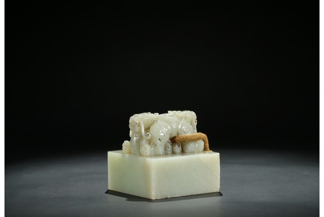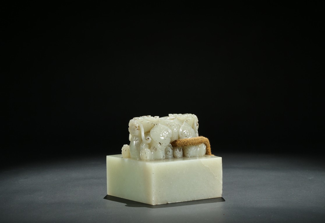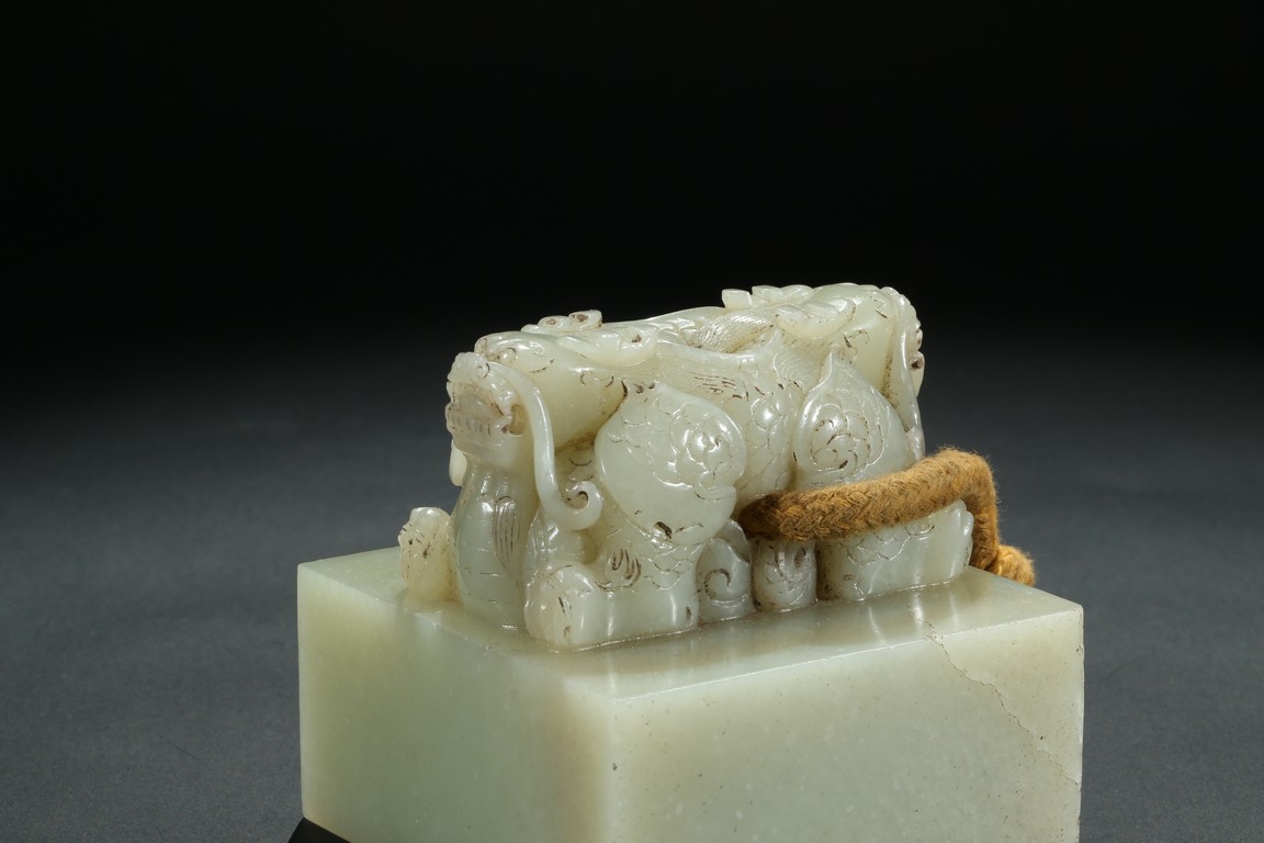 Of square section, the top carved with pair of recumbent dragons crouching on haunches,with scaly bodies,large bulging eyes,and sharp fangs. The seal face carved with six characters. The stone is of even white tone. Qing Dynasty period.